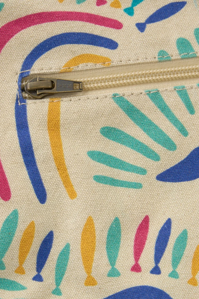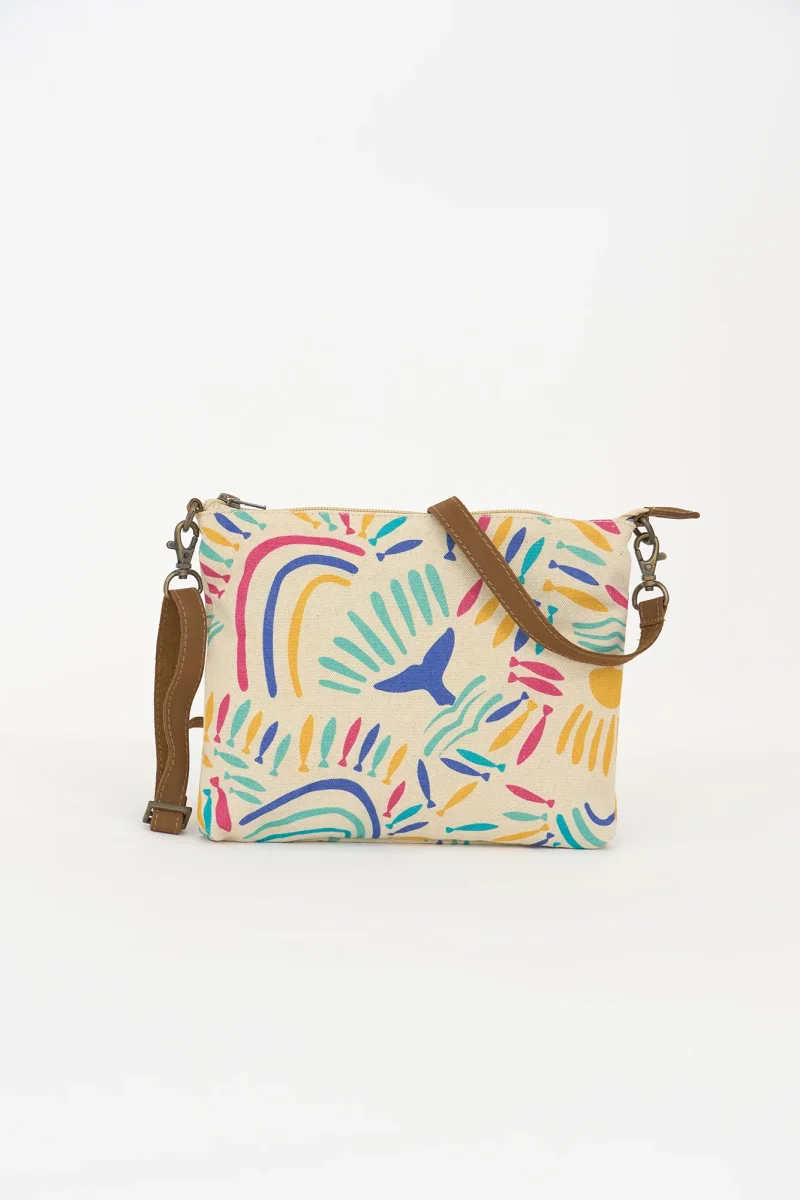 Bolso bandolera de tela con estampado multicolor de inspiración gráfica. Un diseño ligero y práctico, ideal para llevar lo esencial en el día a día, con asa ajustable y un estilo fresco que aporta un toque creativo y actual.
