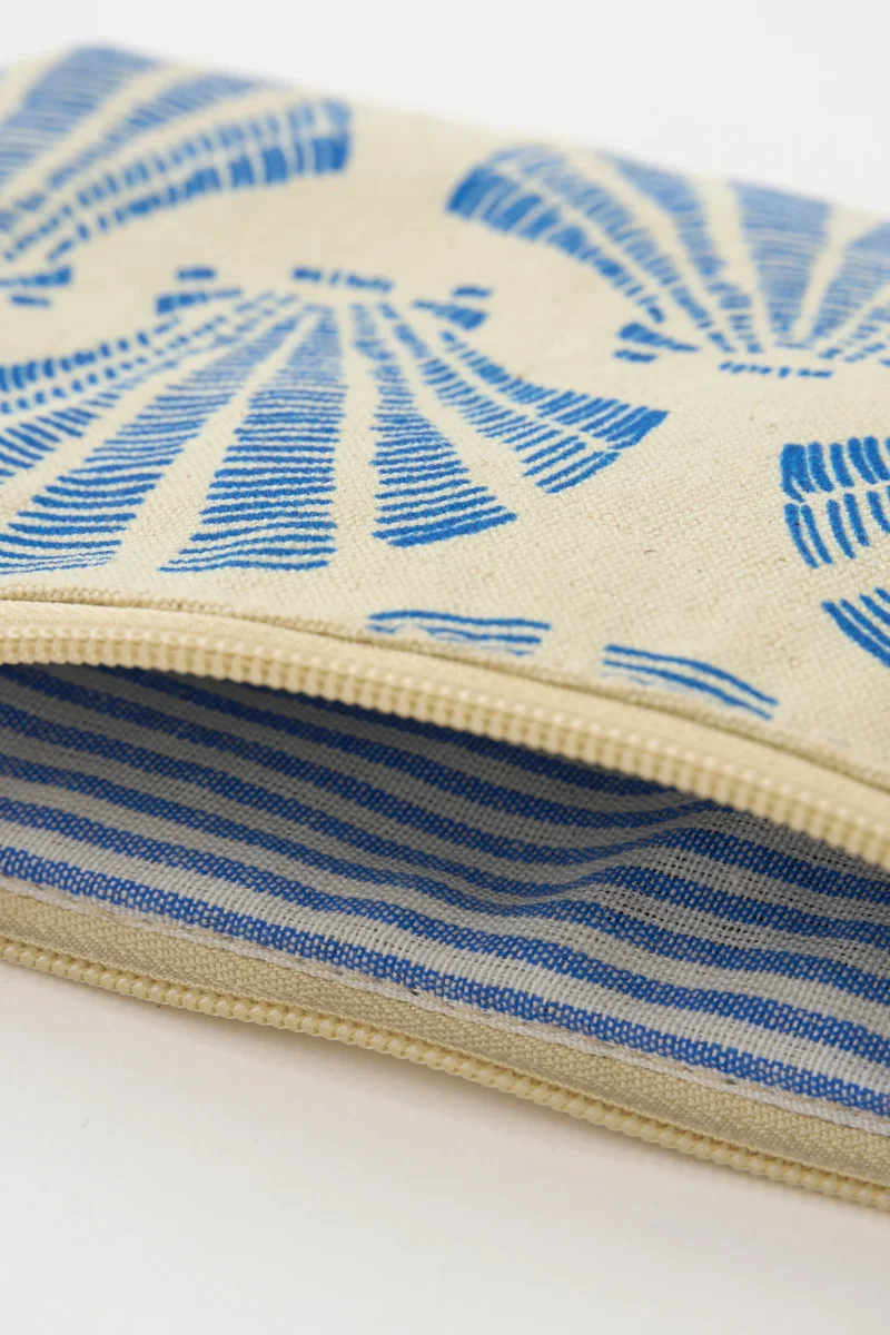 Bolso de inspiración marinera con estampado de conchas en tonos azules sobre lona natural. Un diseño práctico y atemporal, ideal para llevar lo esencial con un toque costero.