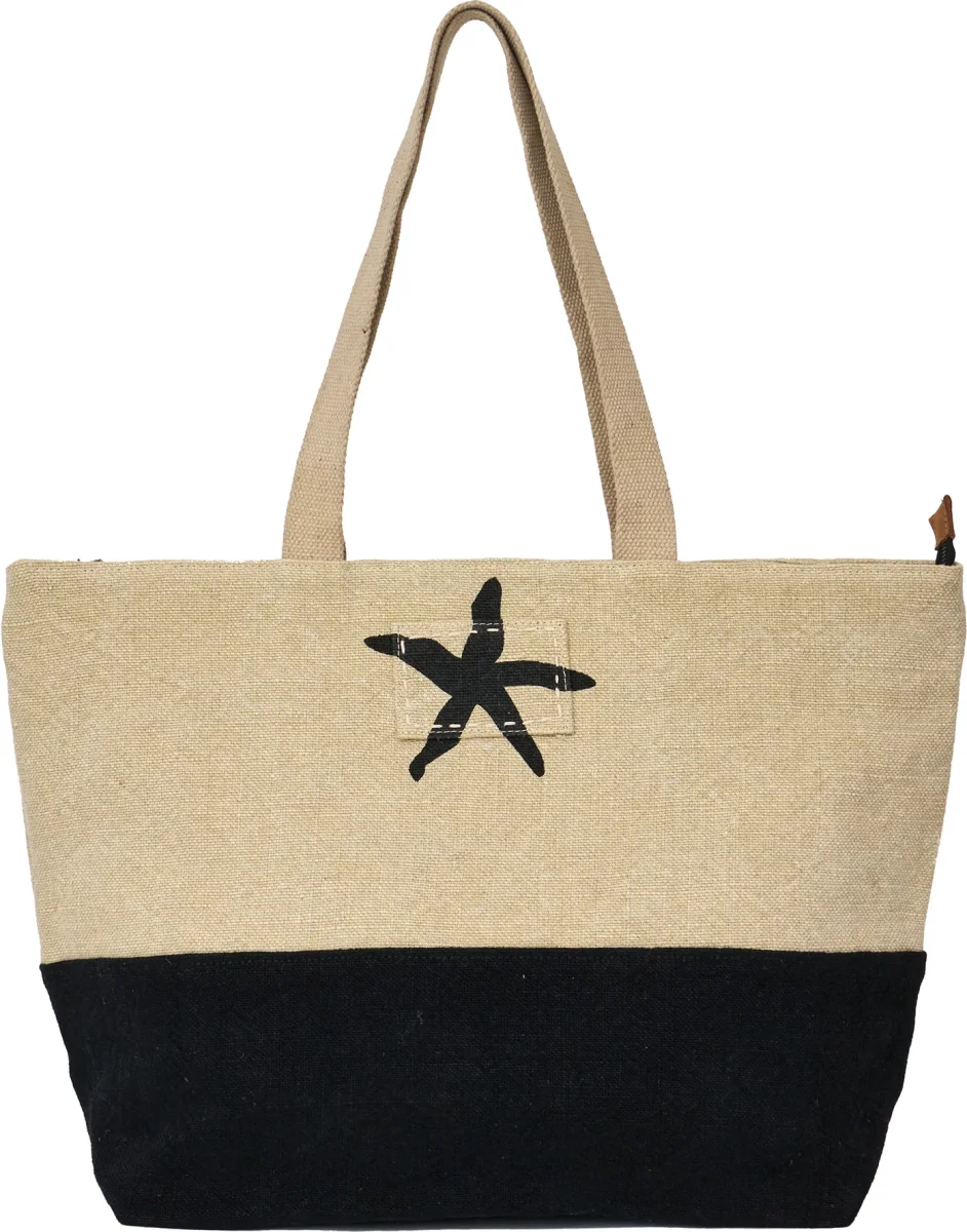 Bolso de tela con motivo de estrella de mar, inspirado en el universo marino. Ligero y funcional, es perfecto para el uso diario o para llevar a la playa. Diseño más ancho que el D2892