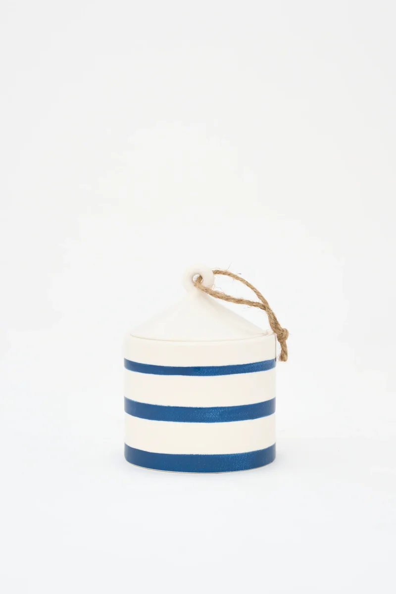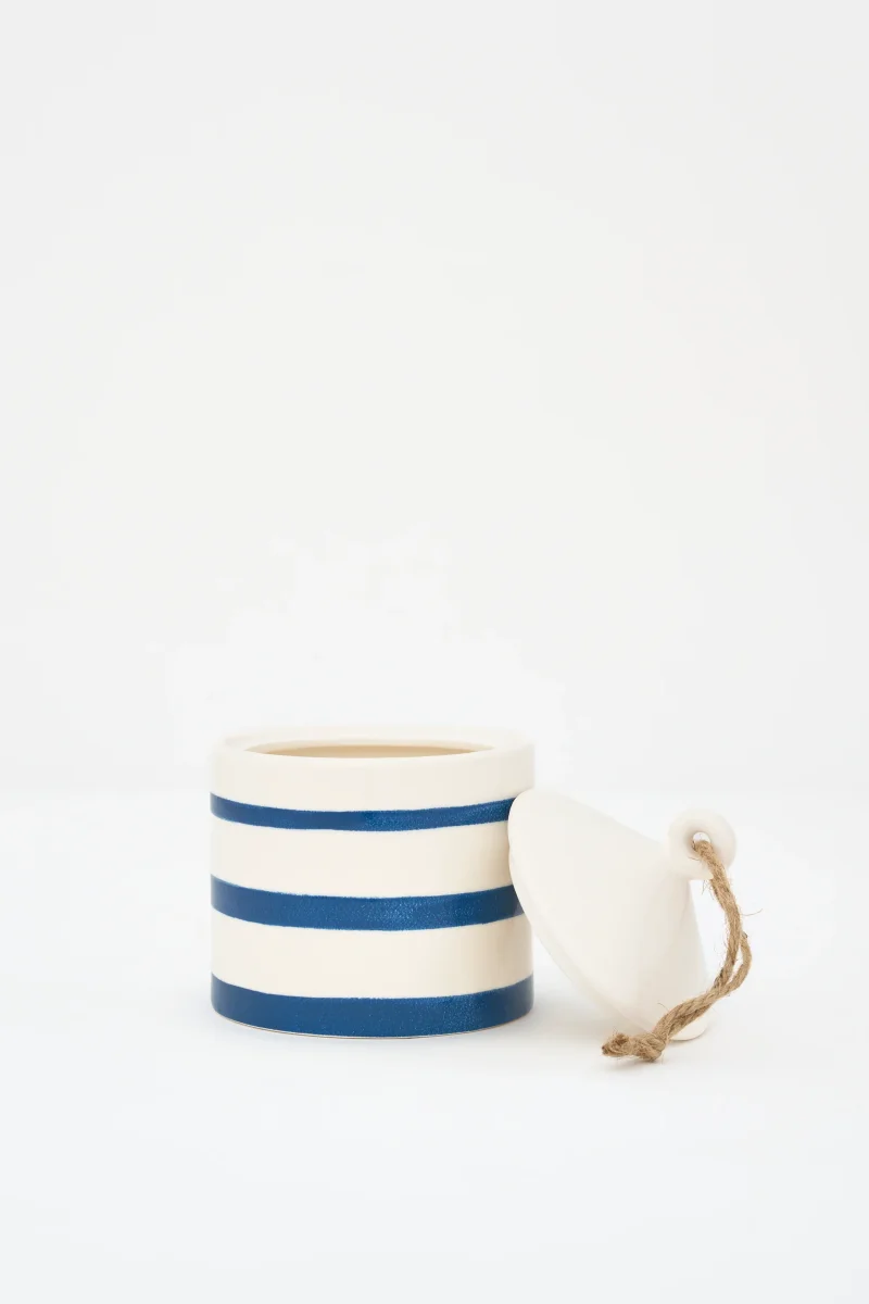 Bote de gres con diseño cilíndrico y acabado a rayas en tonos blanco y azul. Una pieza funcional y decorativa, perfecta para cocinas o estanterías con un estilo marinero limpio y atemporal.