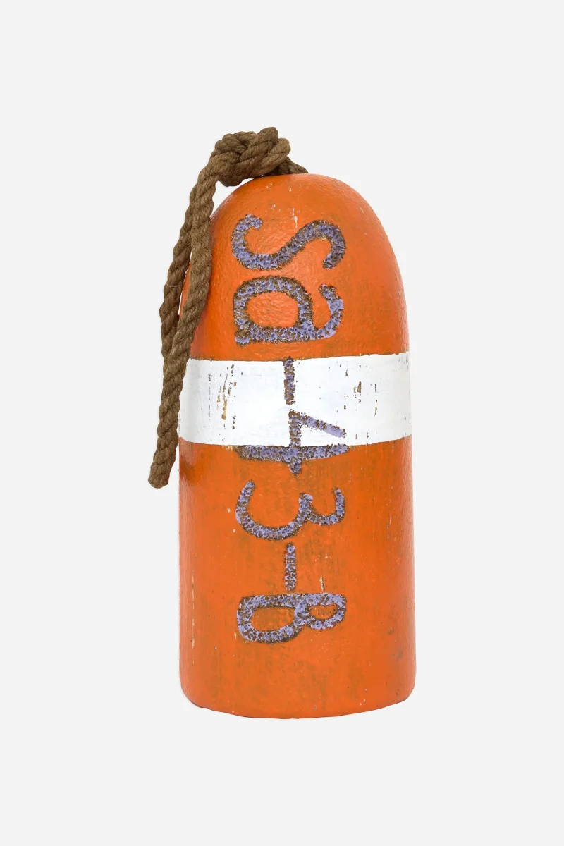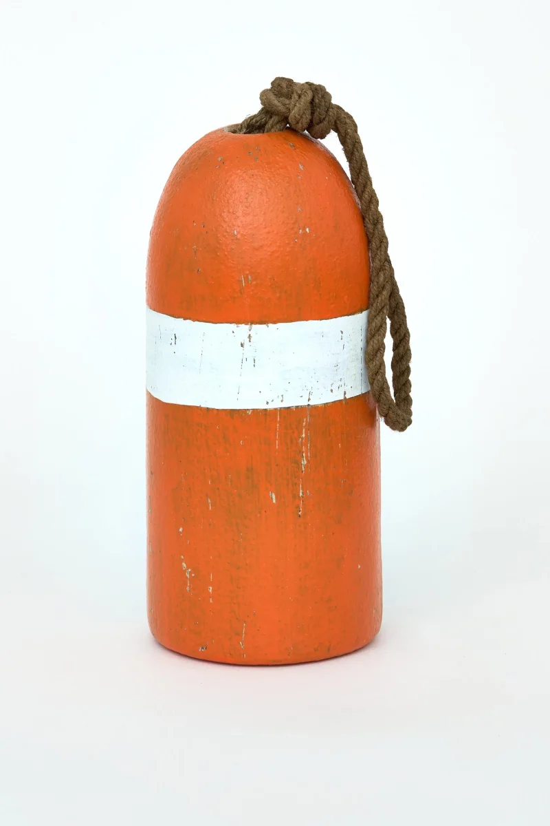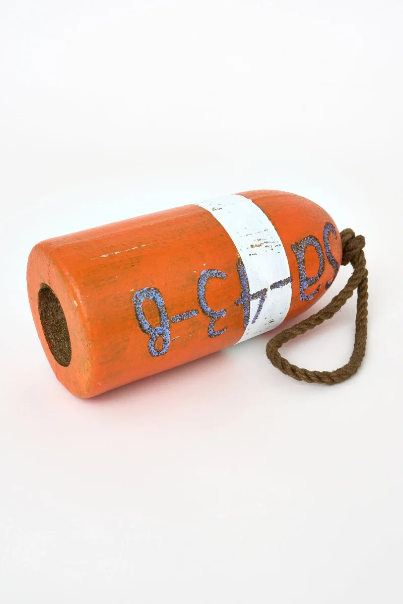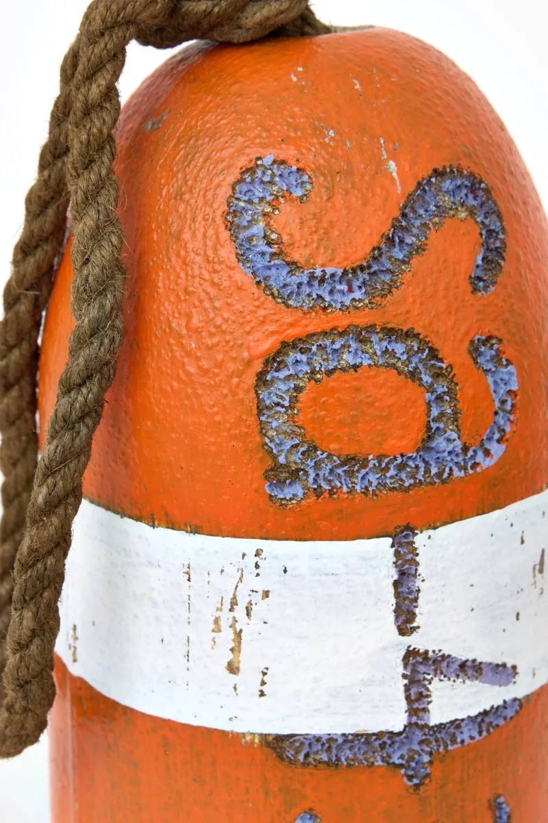 Boya decorativa en tono naranja con franja blanca y acabado envejecido, inspirada en señalización marina tradicional. Incluye cuerda superior que refuerza su carácter auténtico