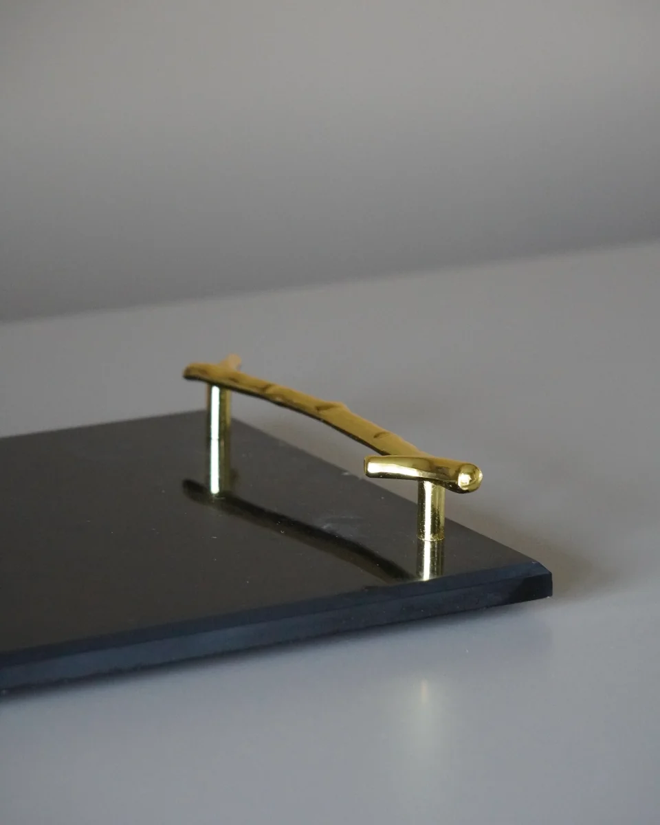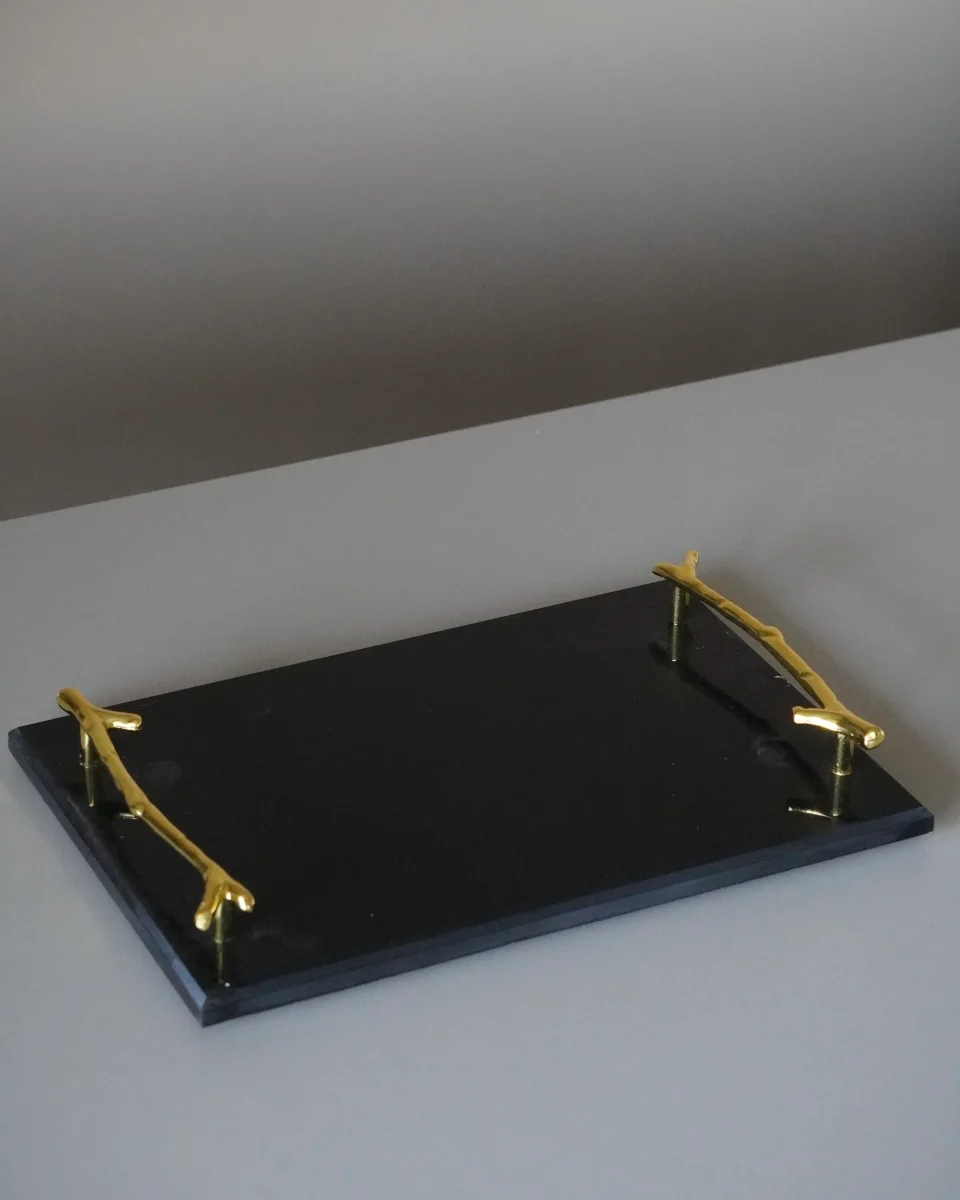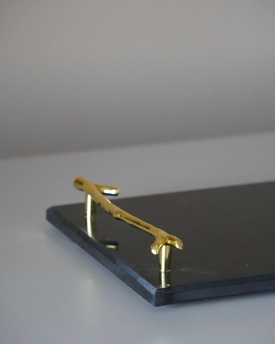 Détails Luxueux : Le plateau est sublimé par deux poignées dorées en forme de branches, créant un contraste saisissant avec la profondeur du marbre noir.