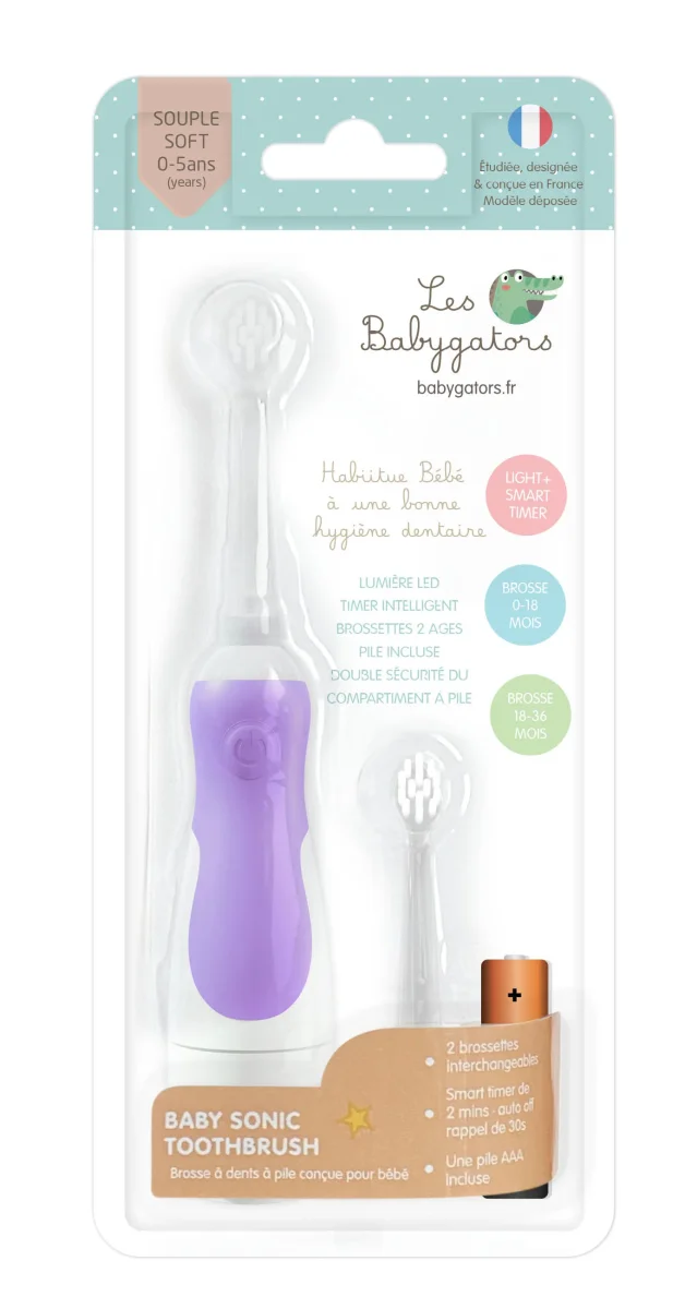 Brosse à dents Sonique avec minuteur intelligent. Brossettes interchangeables de tailles adaptées à la bouche de bébé. Idéale pour les dents de lait! Élimine la plaque dentaire et les résidus de lactose. Brossette 0-18 mois, Brossette 18 mois et plus (pour les enfants jusqu’à 5 ans) et Pile AAA incluse. Couleur Lilas.