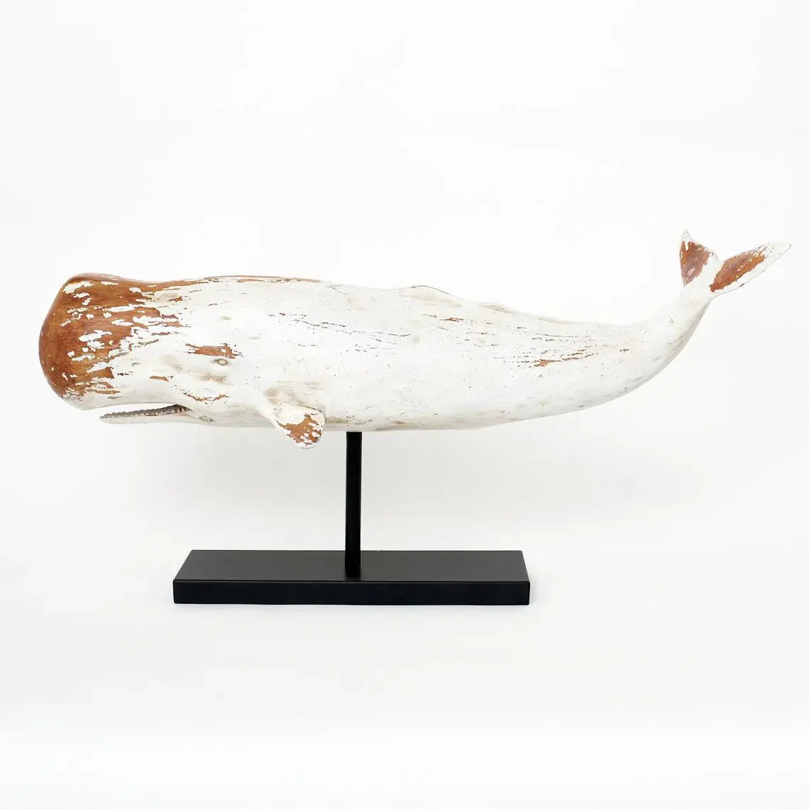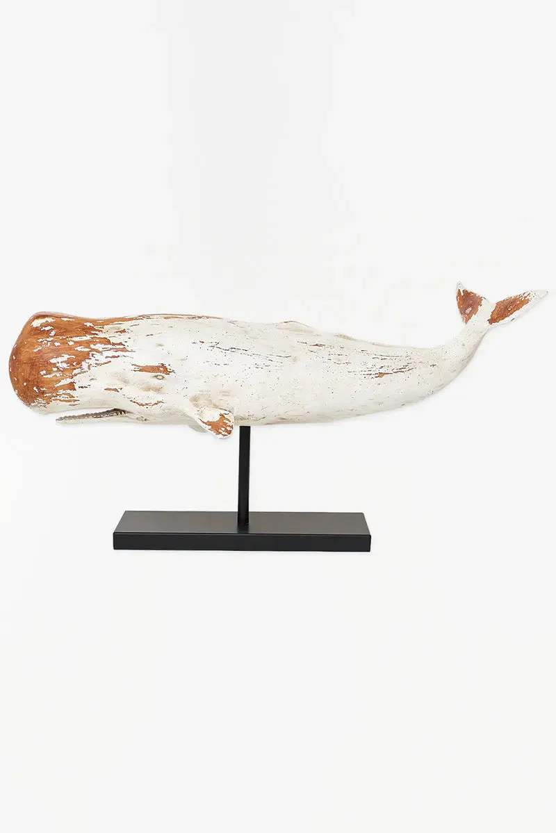 Gran cachalote blanco con base de metal. Ballena hecha en resina y tiene un toque envejecido que lo convierte en uno de los artículos más buscados en el catálogo de Batela.