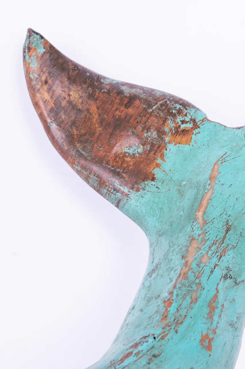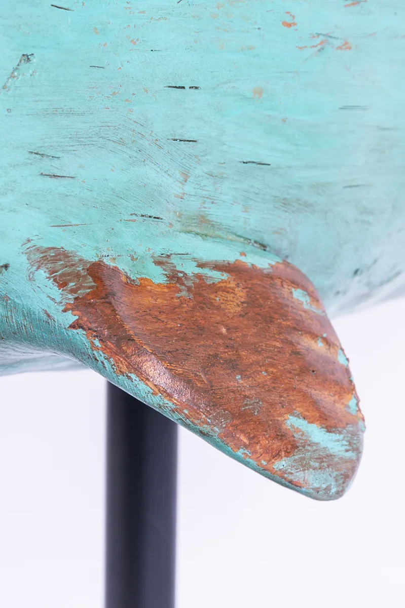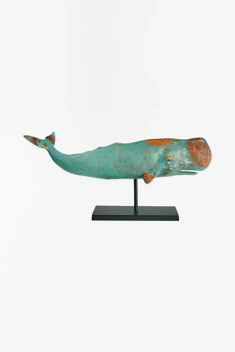 Cachalote o ballena de gran tamaño hecha en resina. Tiene una base metálica y una terminación en madera envejecida.