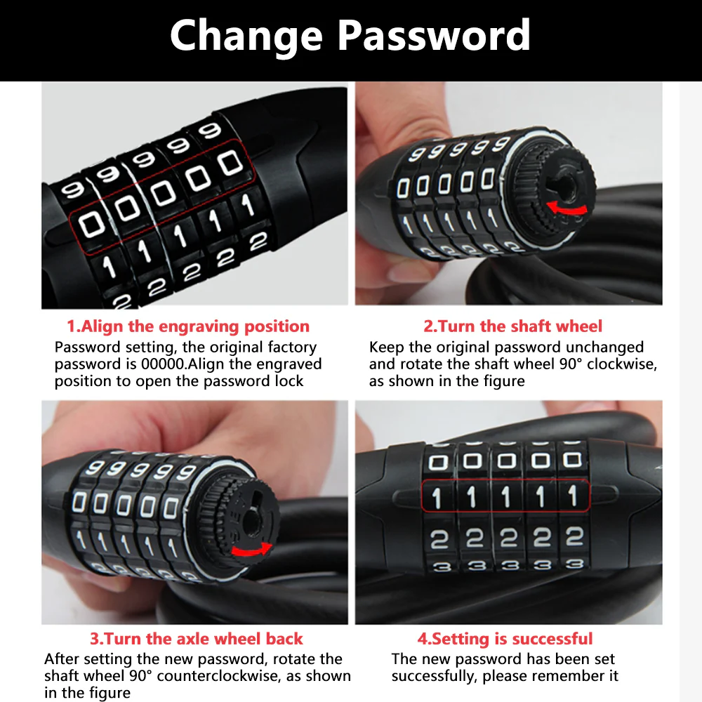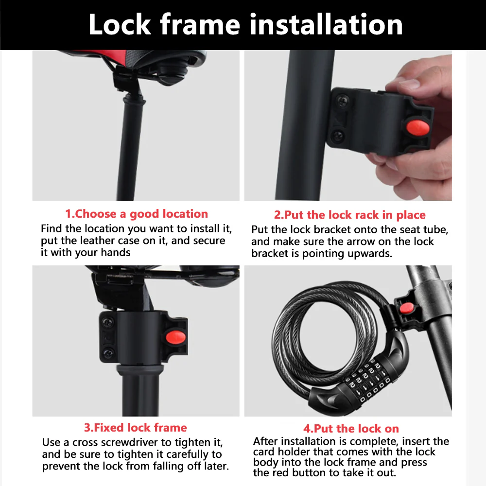- Comprend un cadenas à cinq chiffres pour VÉLO qui ne peut pas être ouvert sans clé. Apportez votre vélo et profitez de votre balade. Peut être facilement attaché autour du siège du vélo. Avec le cadenas à cinq chiffres, le produit offre plus de 10 000 combinaisons ! Le plastique PVC de haute qualité et notre alliage sont résistants à la rouille, à l’usure, aux signes d’utilisation et aux coupures.
