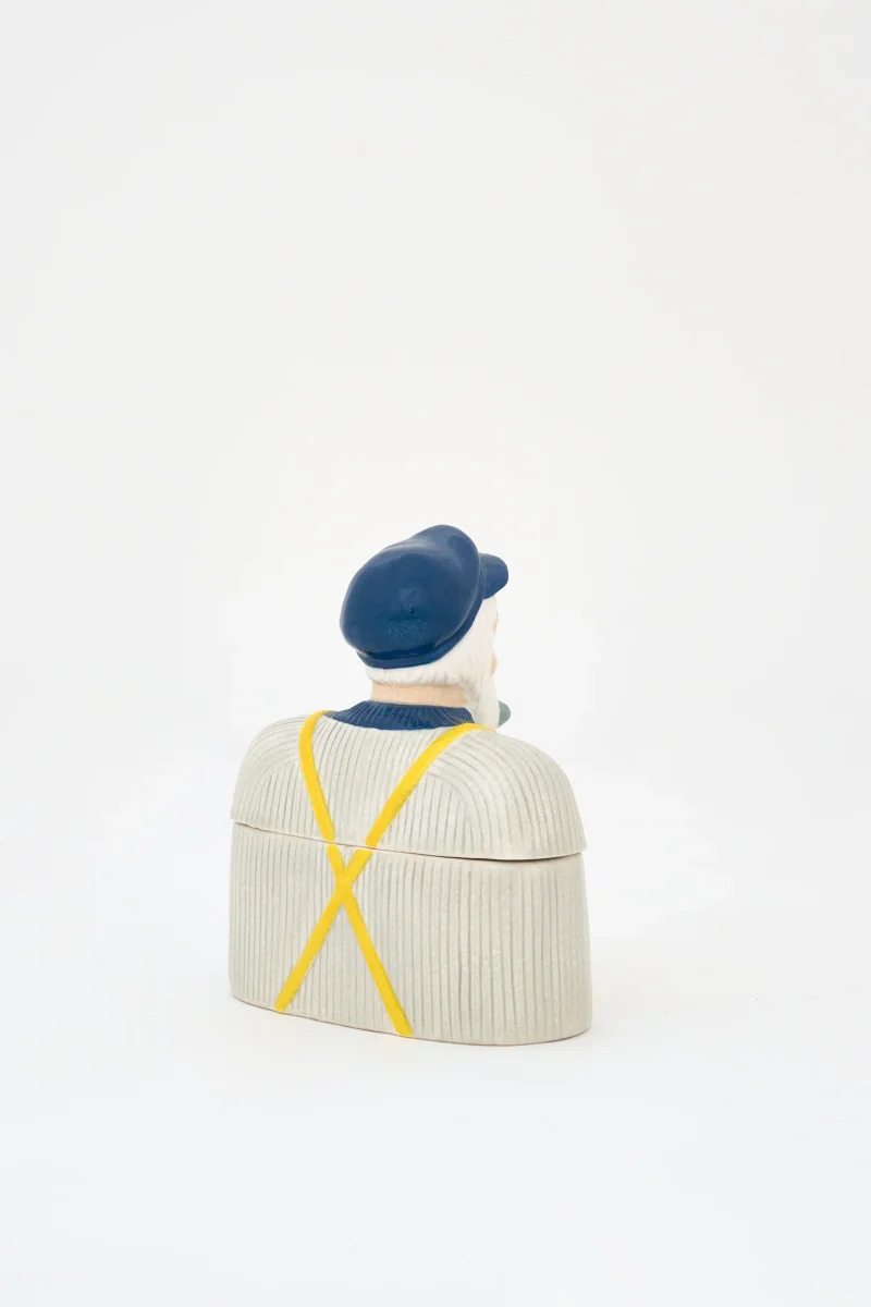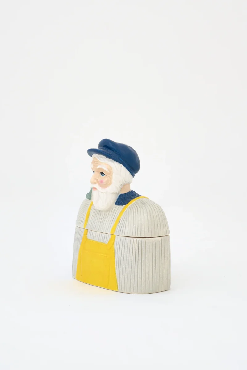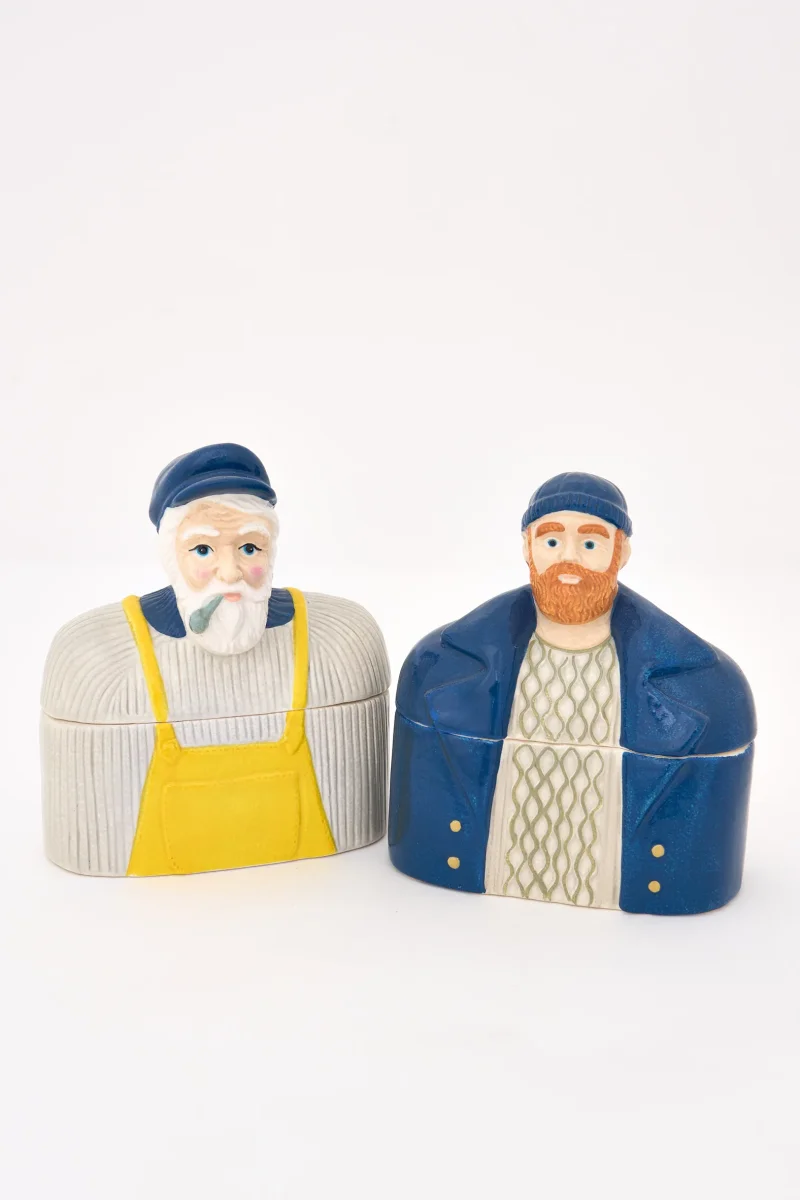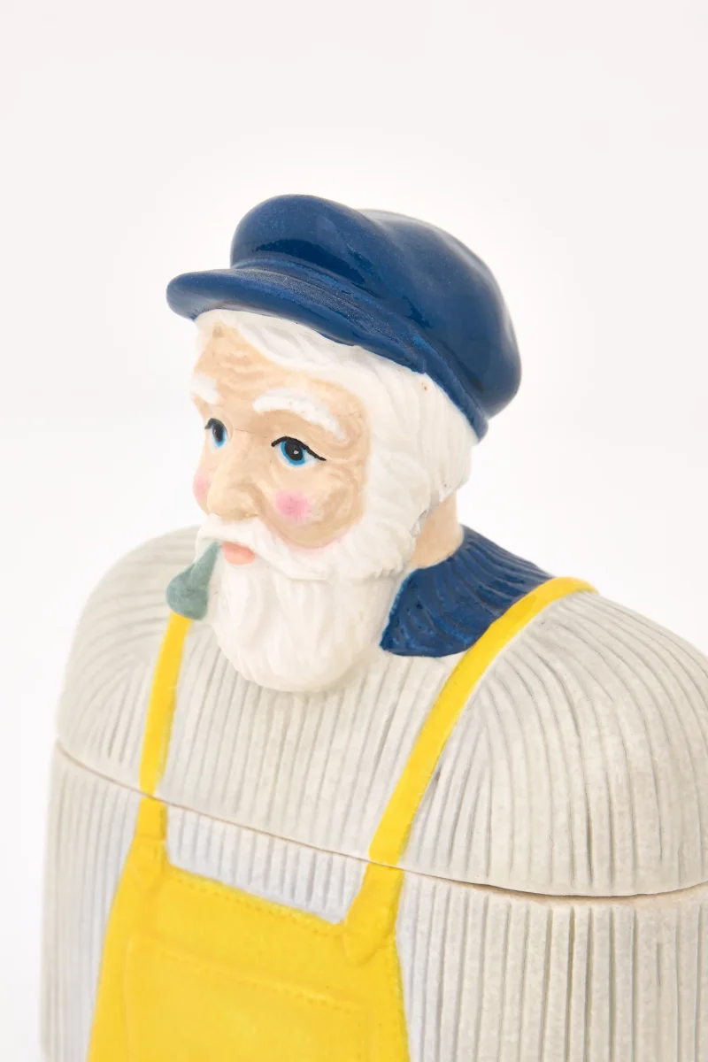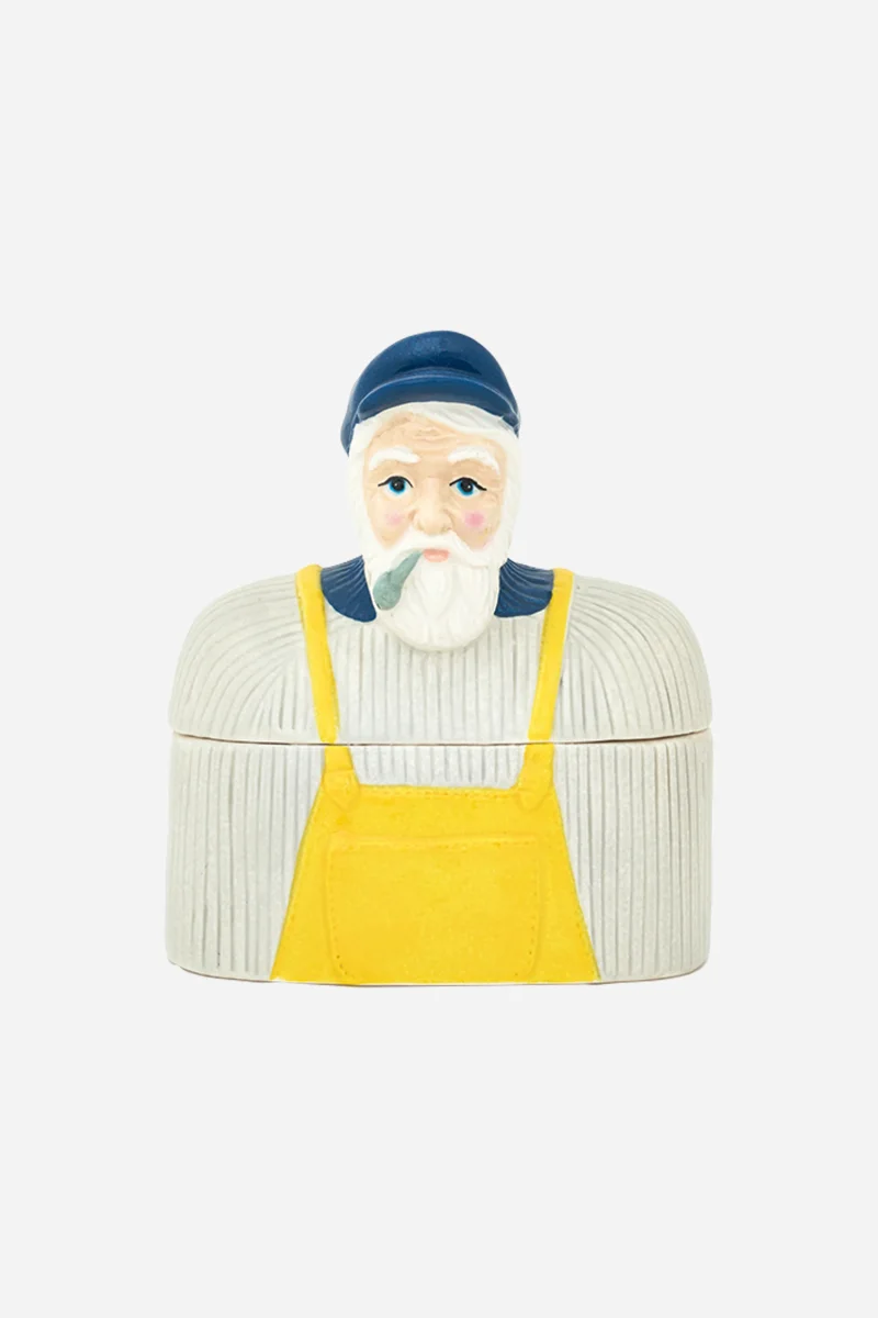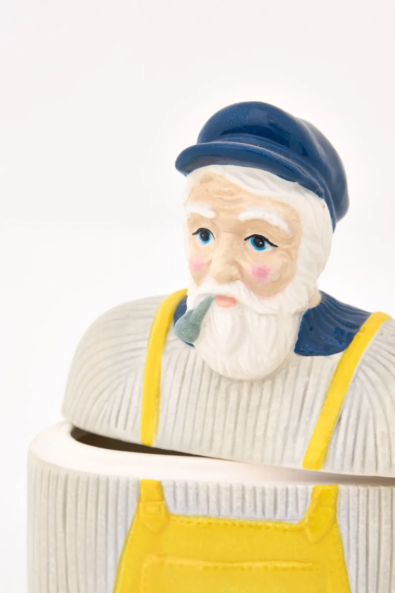 Caja decorativa de cerámica con figura de pescador y acabado esmaltado. Un objeto funcional y decorativo de estilo marinero, ideal para aportar carácter costero a cualquier estancia.