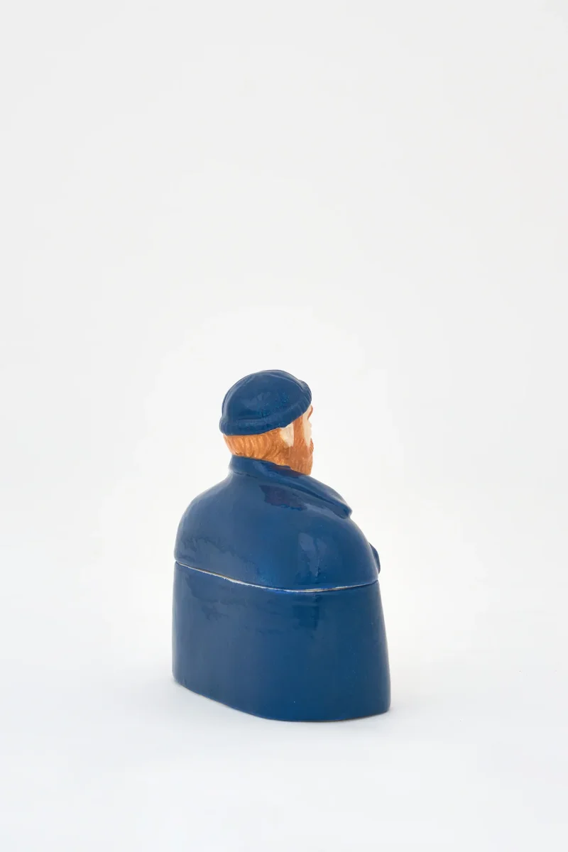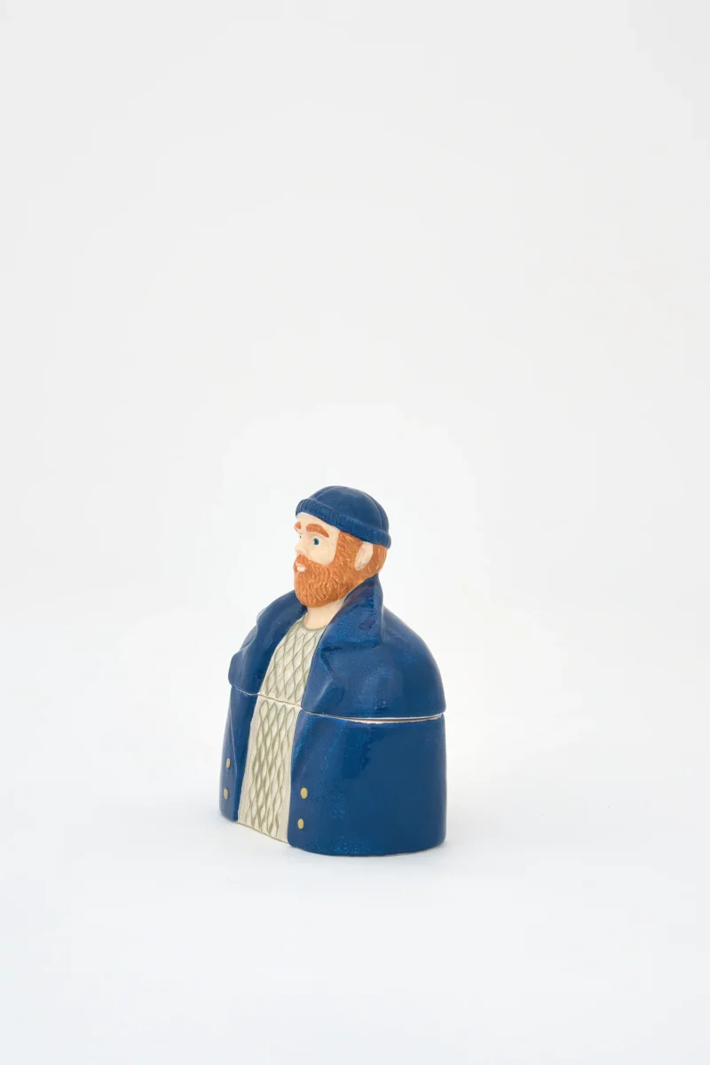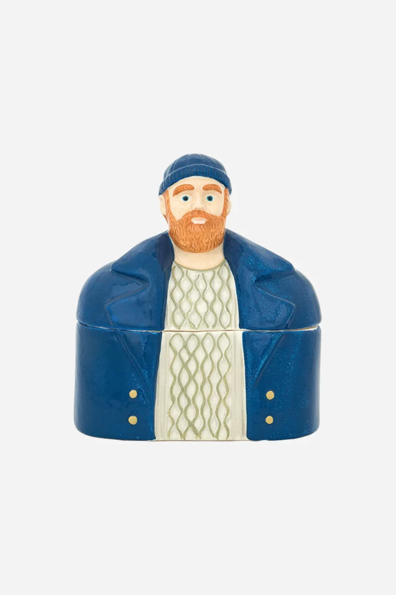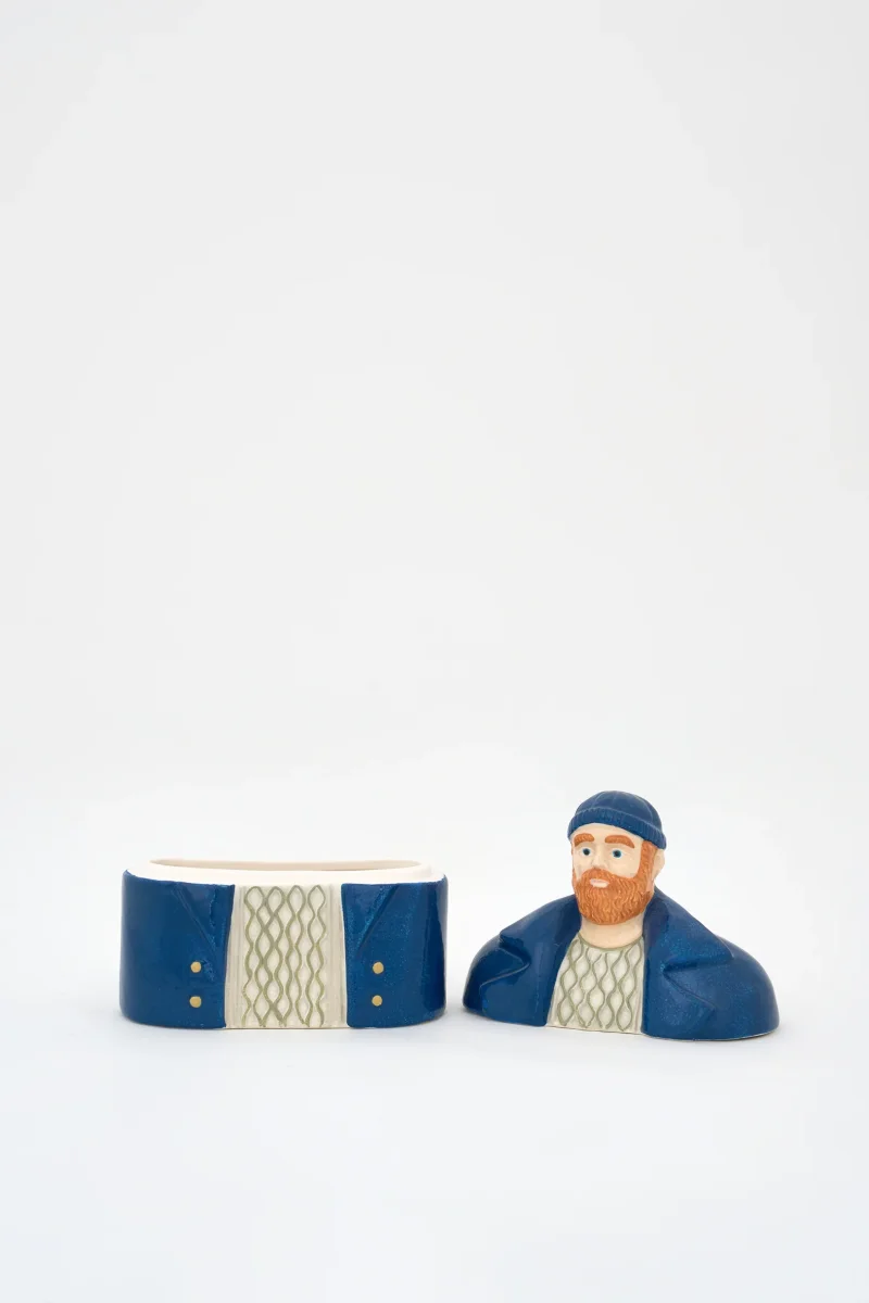 Caja decorativa de cerámica con figura de pescador en tonos azules y acabado esmaltado. Una pieza funcional de inspiración marinera, pensada para aportar carácter y estilo costero en cualquier espacio.