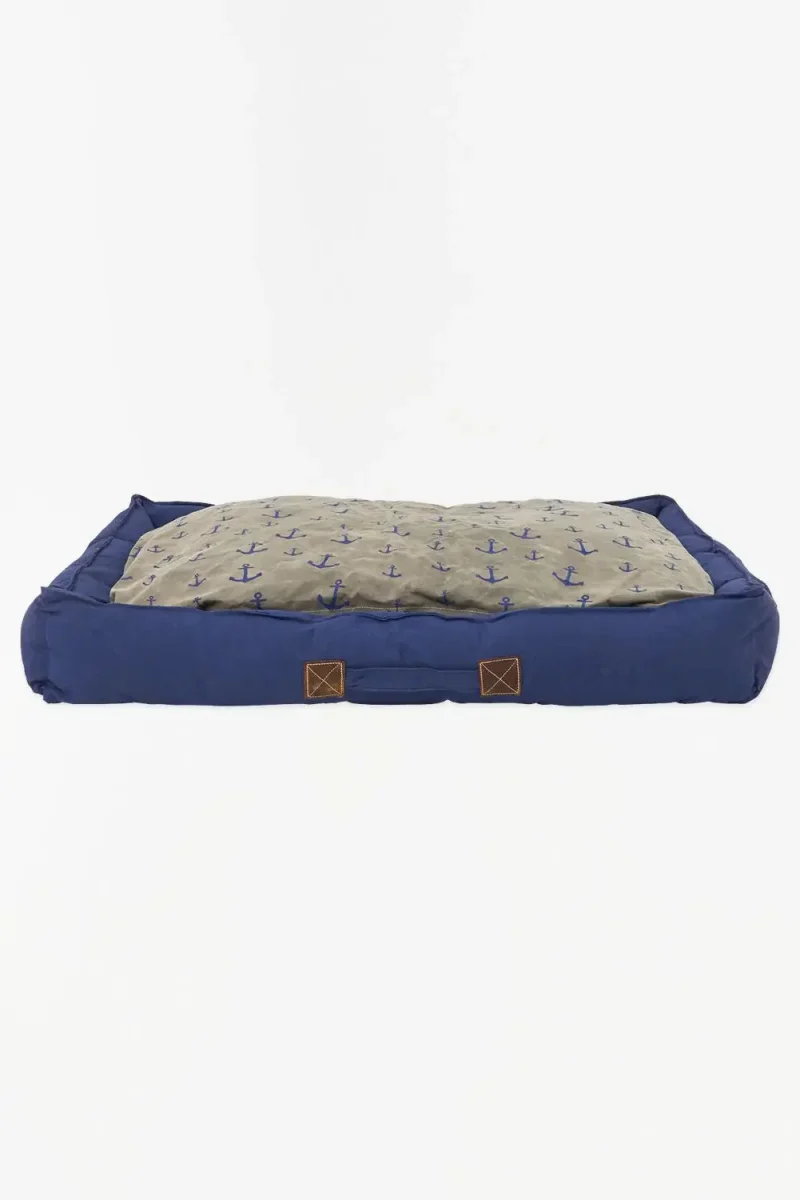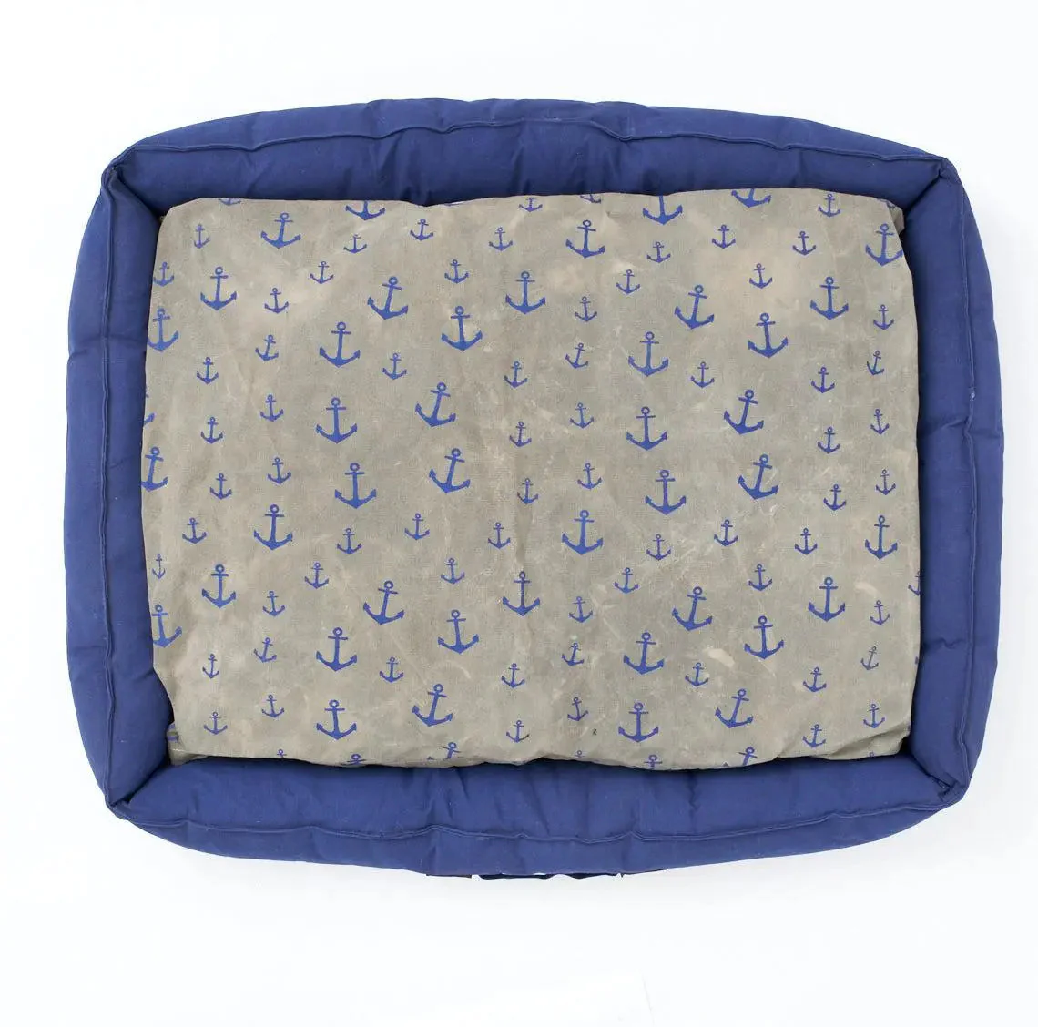 Cama grande para mascota. La parte exterior es azul y la interior gris adornada con anclas azules de diferentes tamaños. El regalo náutico perfecto.
