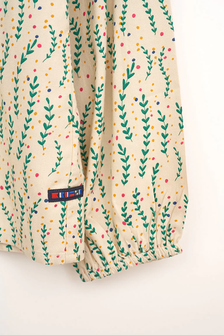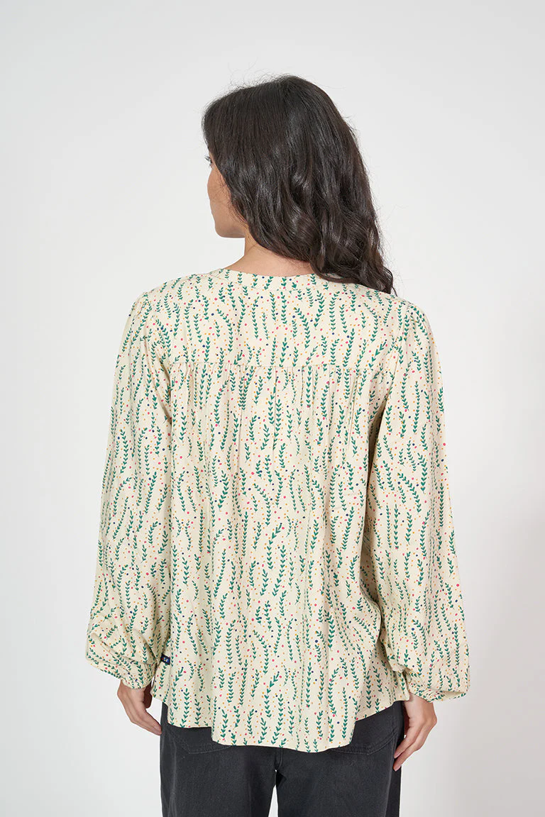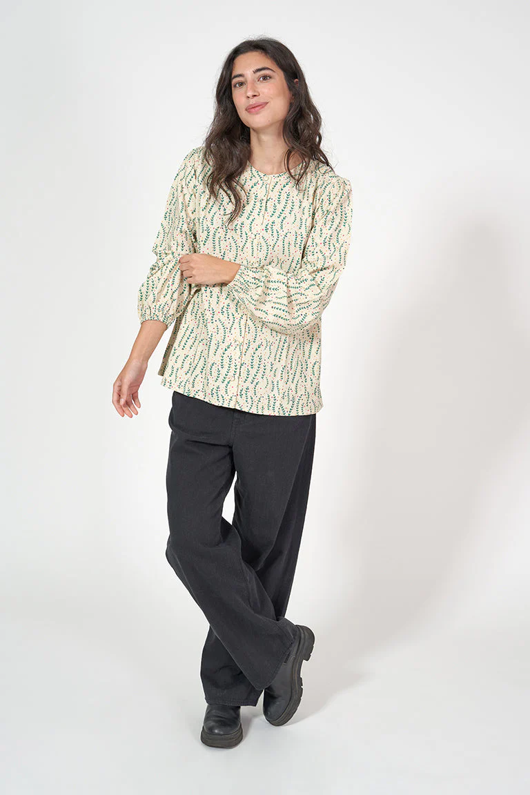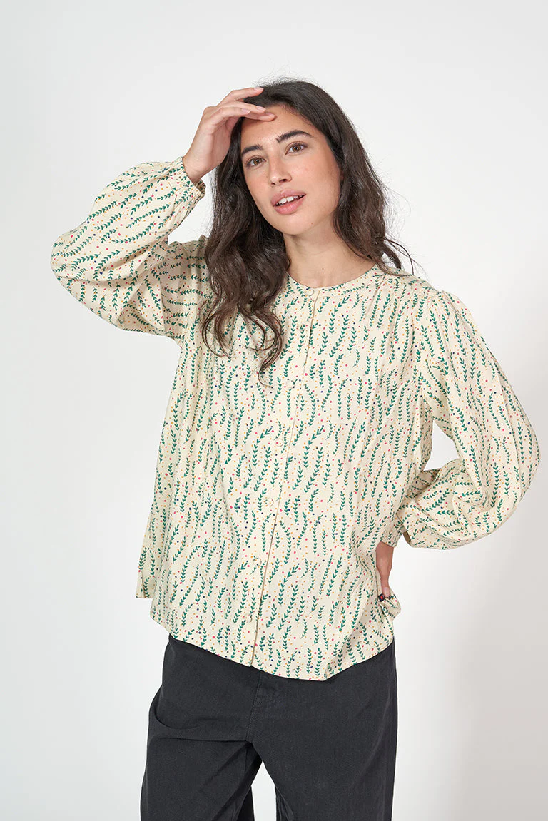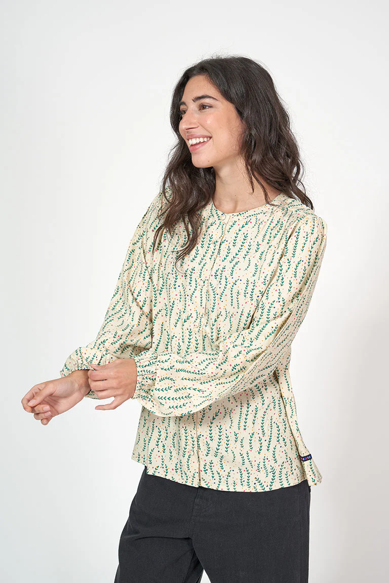 Camisa de mujer de manga larga con un bonito estampado de hojas. Tiene cuello redondo y abertura frontal con botones. La manga larga acaba en elástico aportándole volumen. La modelo mide 1,72m y lleva una talla 38