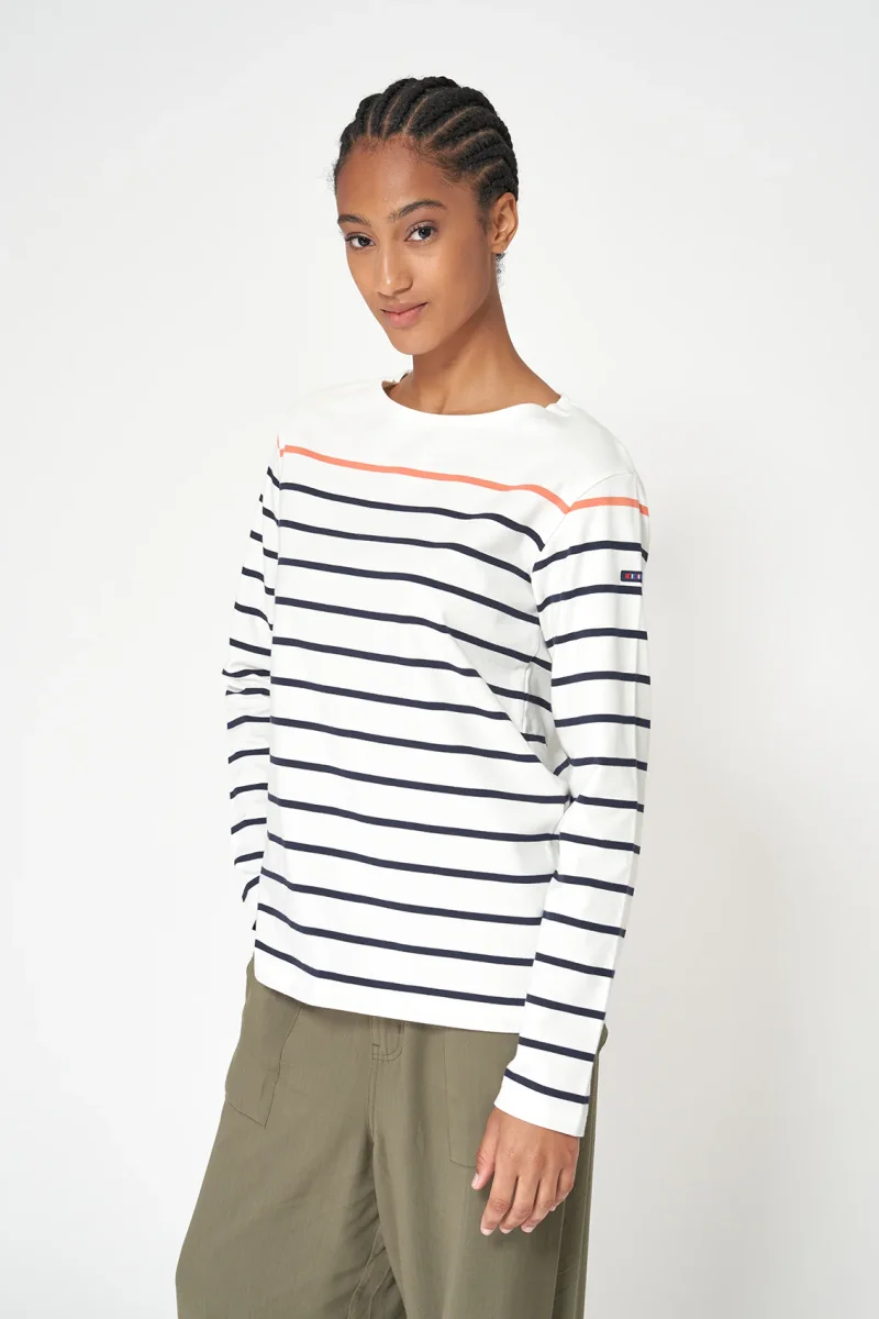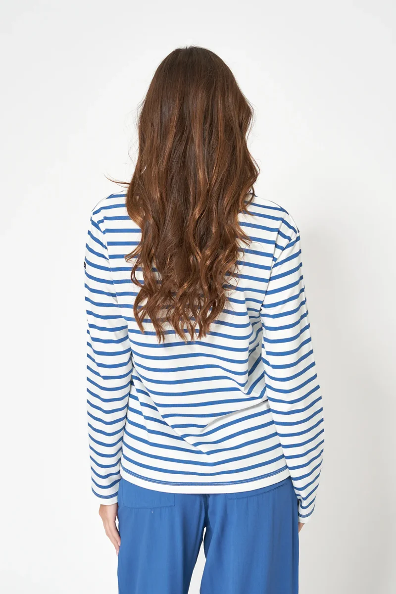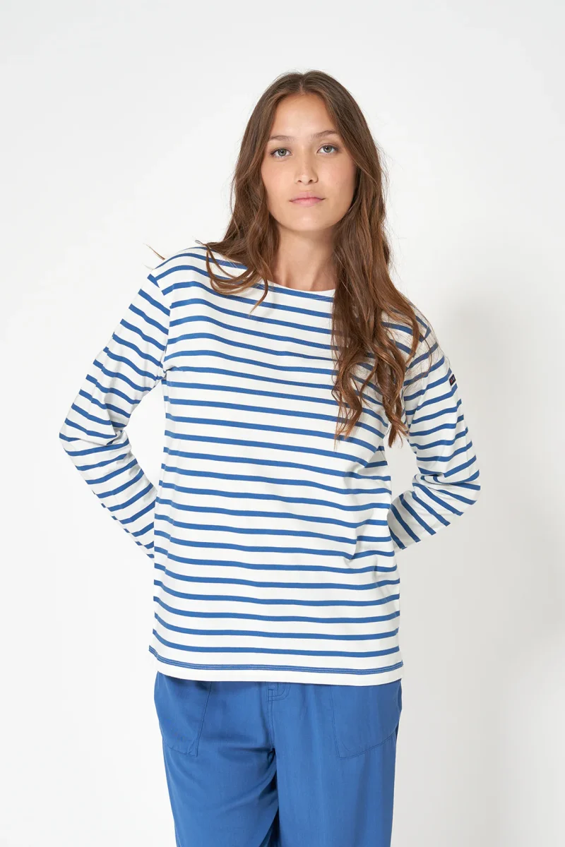 Esta camiseta marsellesa en manga larga es un básico en la colección de Batela para mujer. Su corte clásico con cuello redondo y su estampado a rayas la convierten en la camiseta marinera perfecta.