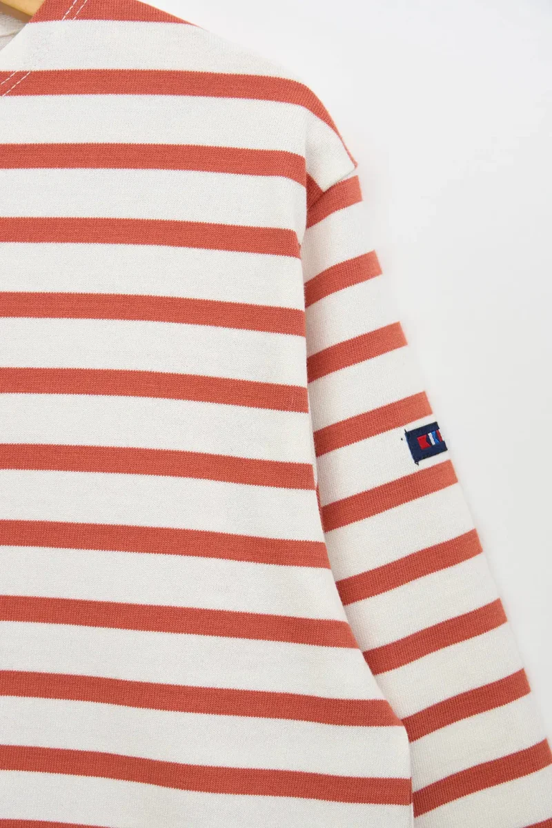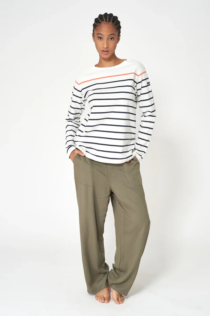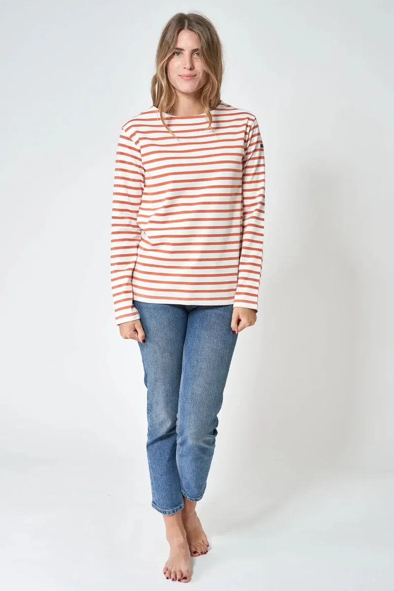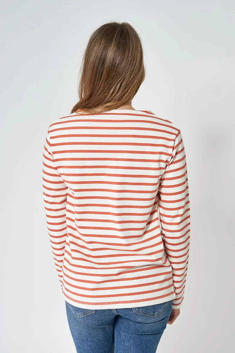 Esta camiseta marsellesa en manga larga es un básico en la colección de Batela para mujer. Su corte clásico con cuello redondo y su estampado a rayas la convierten en la camiseta marinera perfecta.