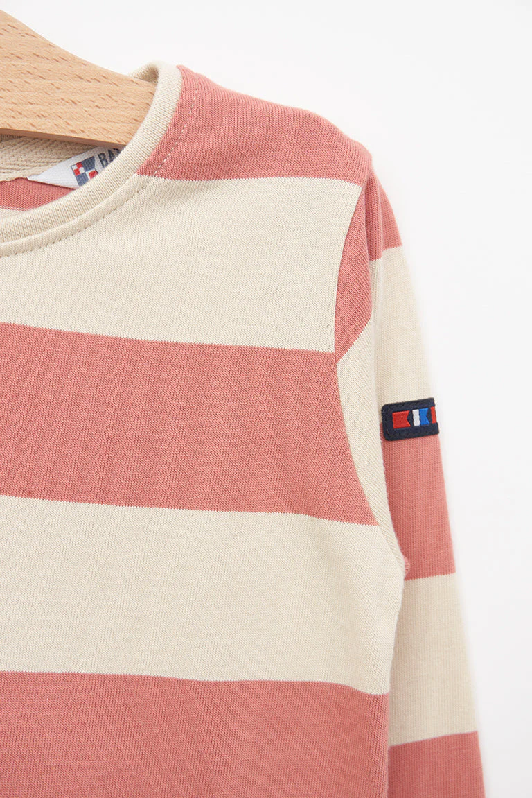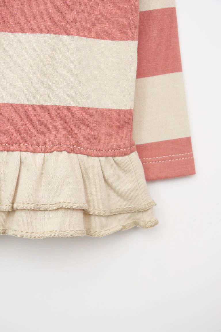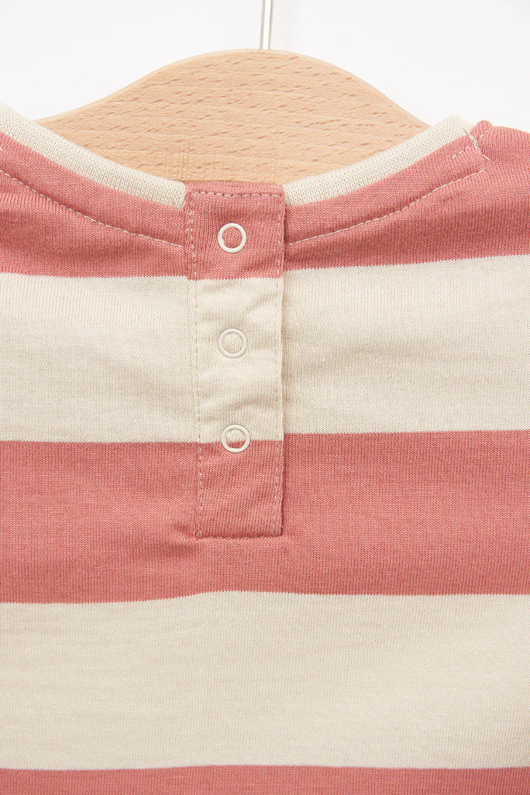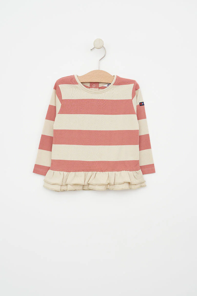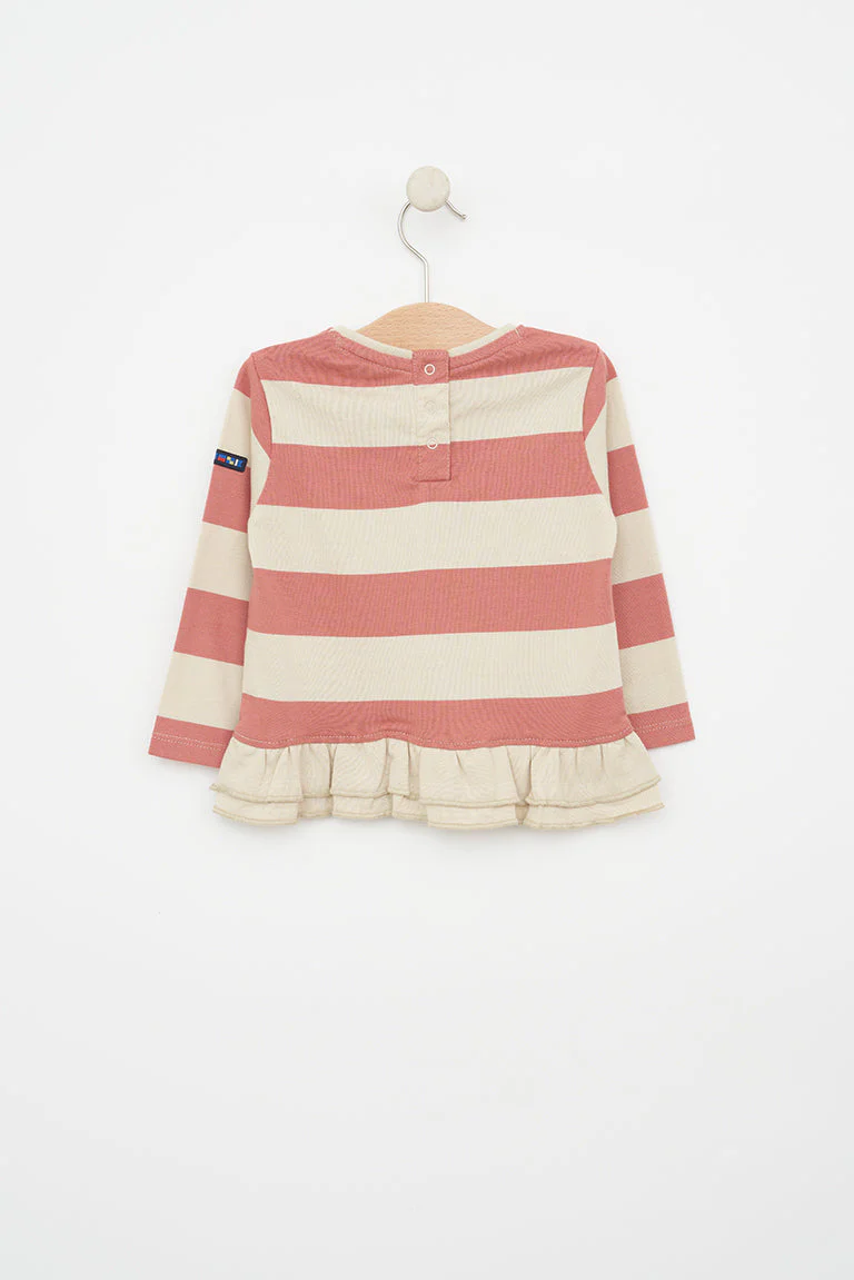 Camiseta para bebe fabricada en tejido de algodón de 220gr con estampado de rayas. Tiene cuello redondo, botonadura trasera con corchetes y detalle de volantes en el bajo con el mismo tejido.