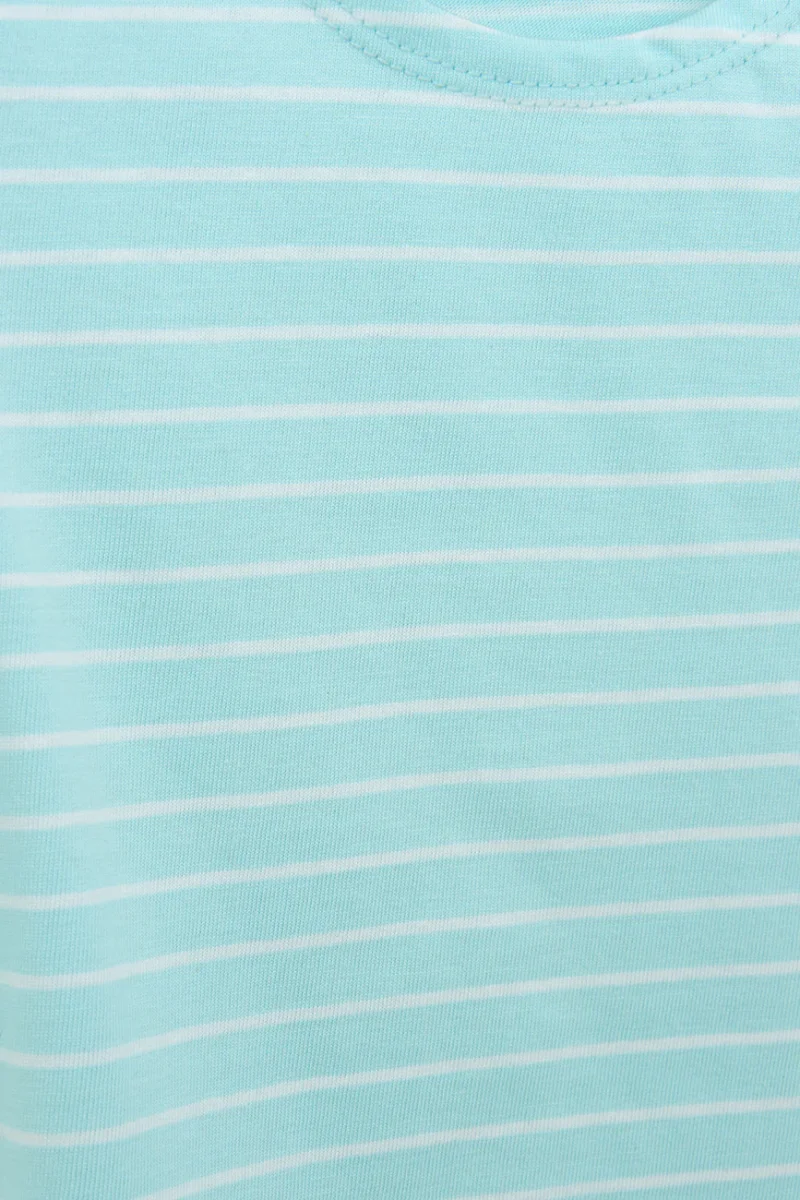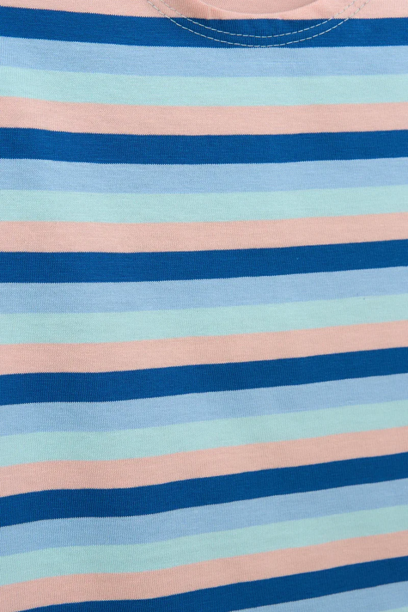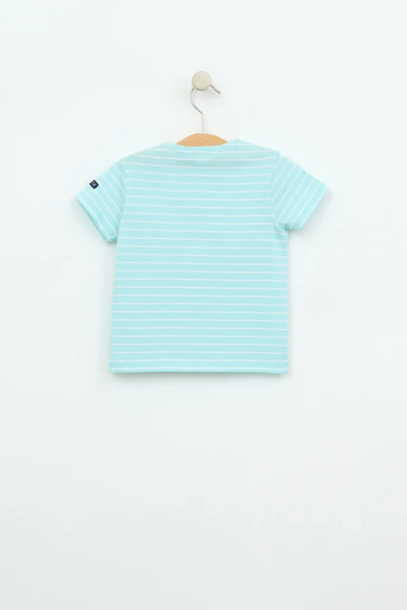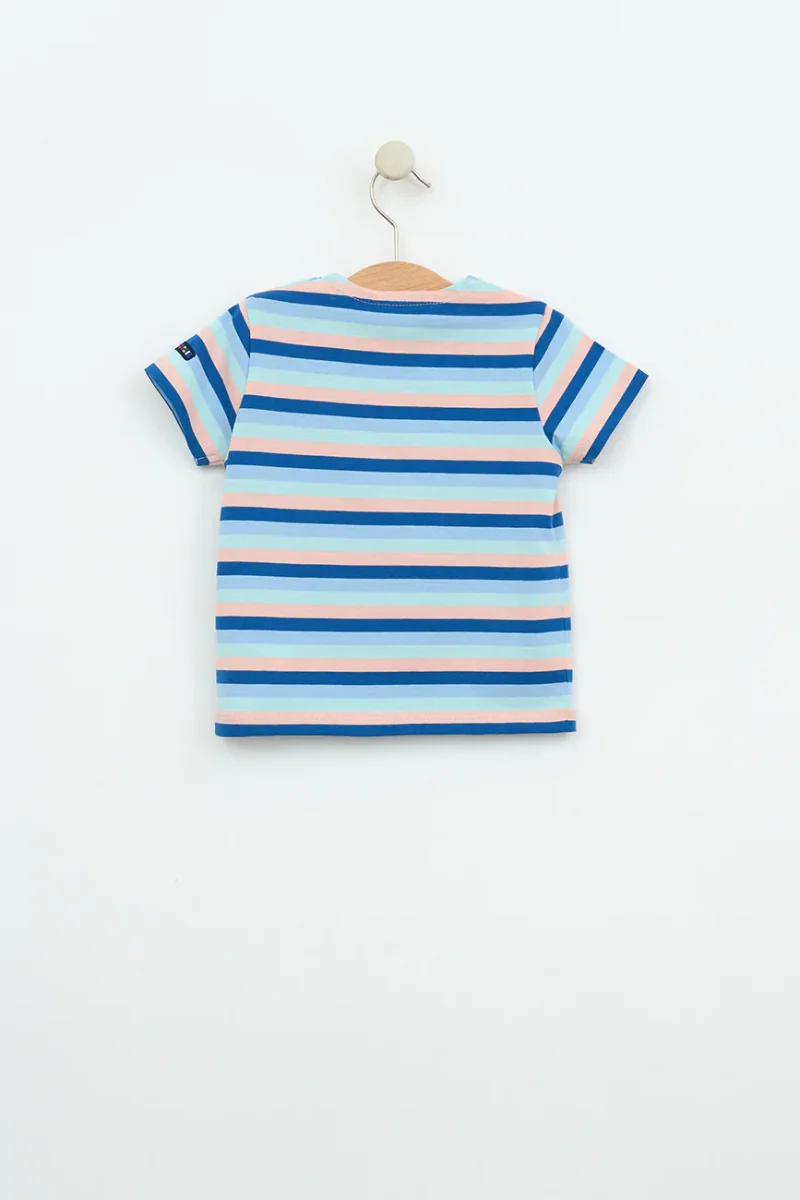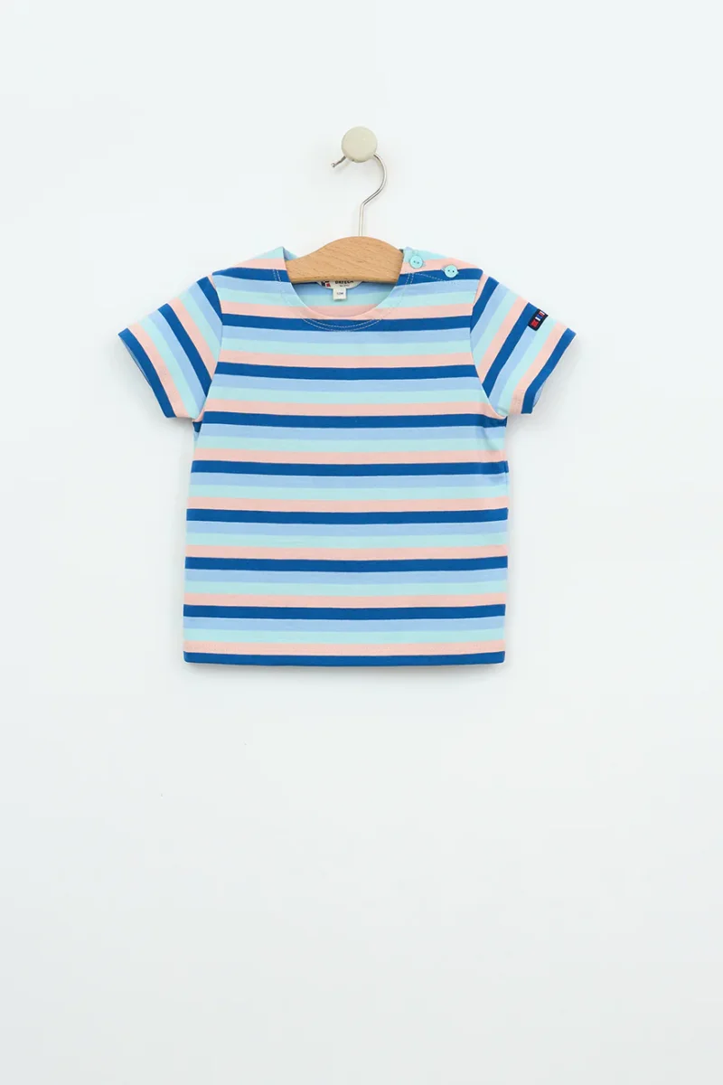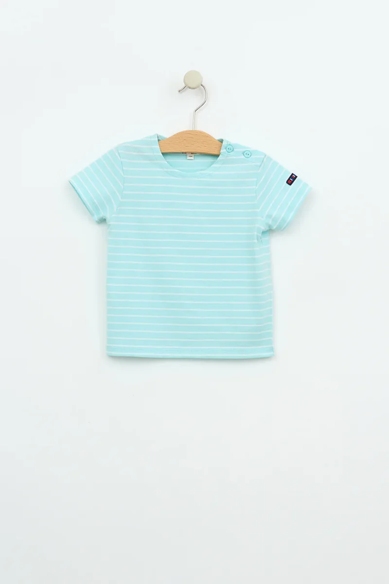 Camiseta algodón de 180gr con manga corta y cuello redondo. Tiene 2 botones en el hombro, para ayudarte a vestir al bebe y nuestro estampado de rayas marineras. Un clásico de verano para nuestros pequeños grumetes.