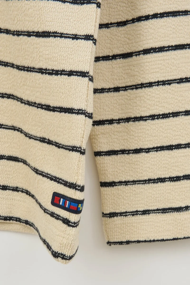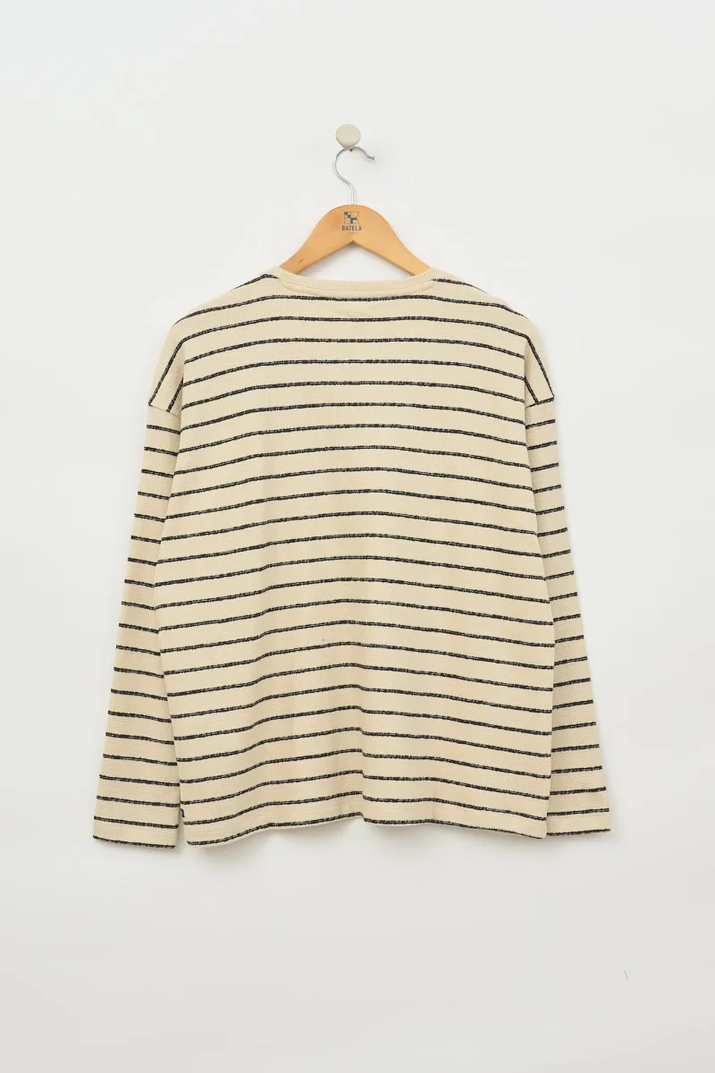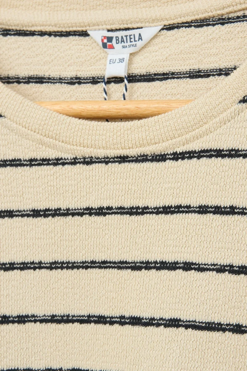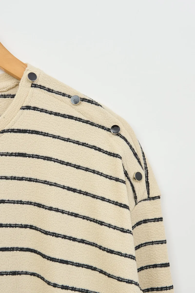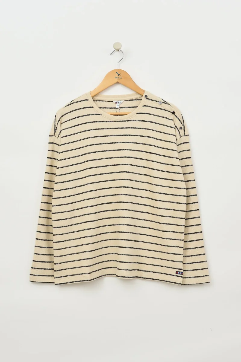 Camiseta para mujer confeccionada en un tejido con textura de jersey. Tiene un estampado con raya marinera muy fina y unos botones decorativos en el hombro dando ese aspecto marinero a la prenda. Puedes consultar el modelo A2595, igual a este, pero sin el estampada a rayas. La modelo mide 1,72m y lleva una talla 38
