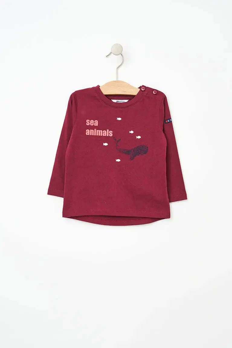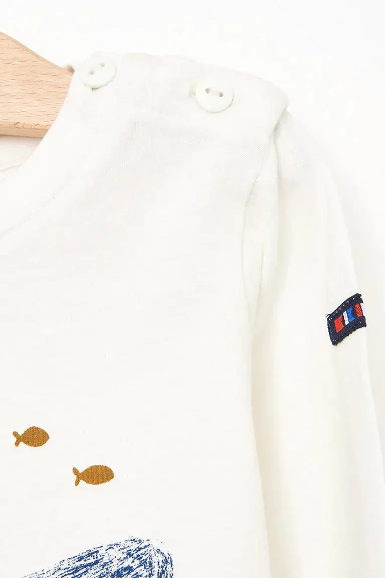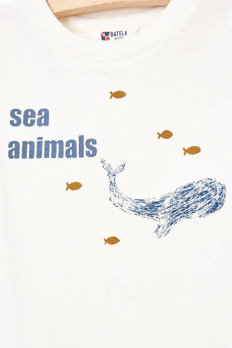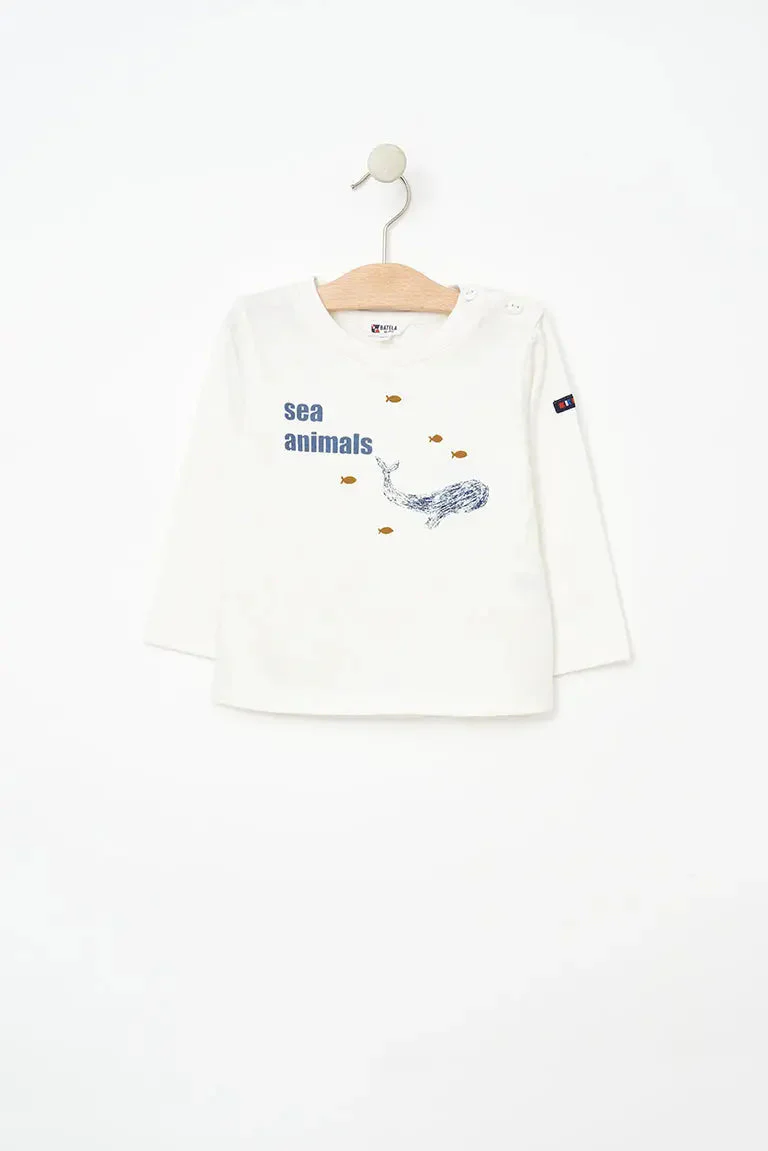 Camisetas bebé Camiseta de manga larga confeccionada en algodón 100% de 220 gramos. Lleva una serigrafía de una ballena rodeada de peces y el texto ‘Sea Animals’.