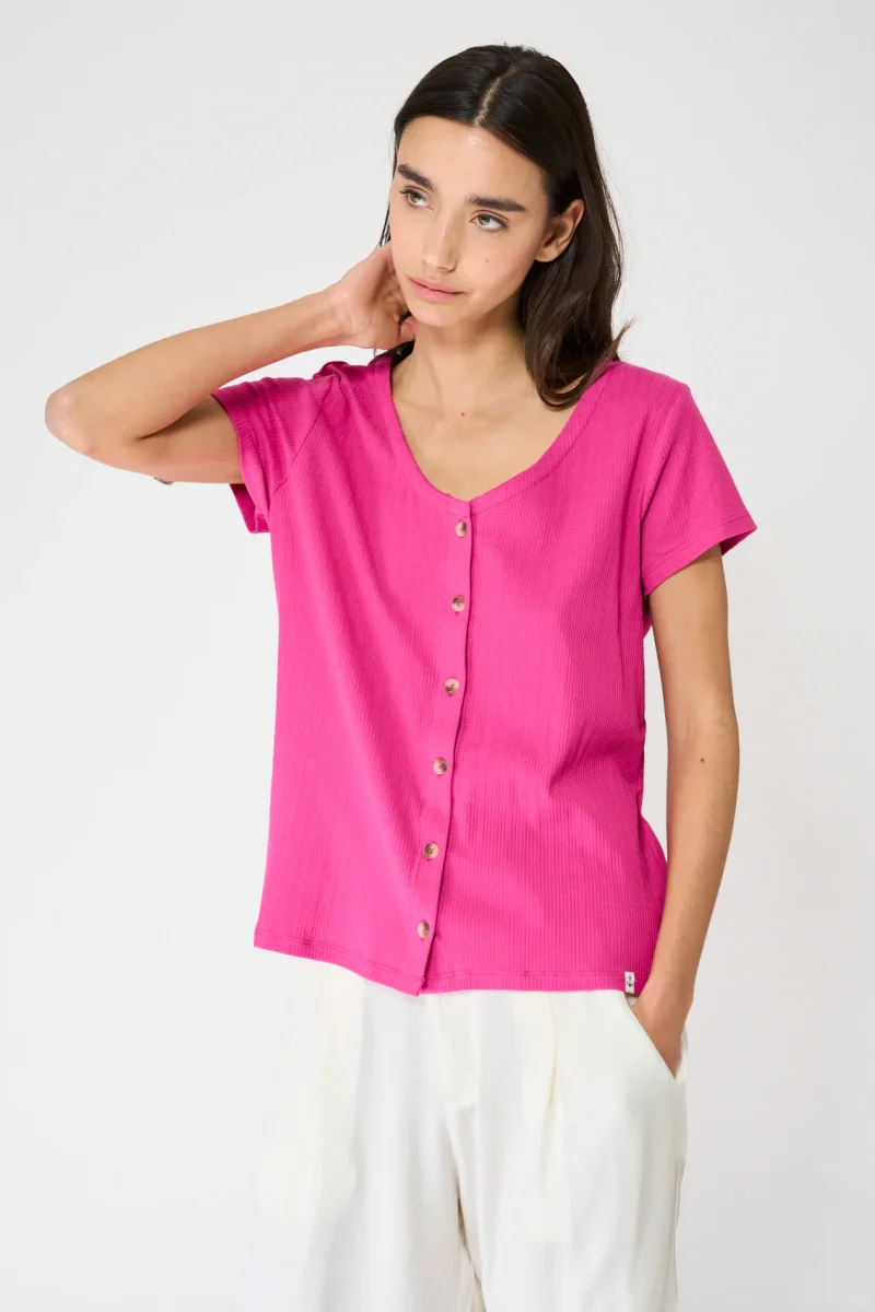 Su diseño con escote en V y su silueta limpia convierten este top en una prenda muy femenina. Los botones en la parte delantera le aportan un toque distintivo. Una prenda ligera y versátil con un aire especial que eleva cualquier look informal.