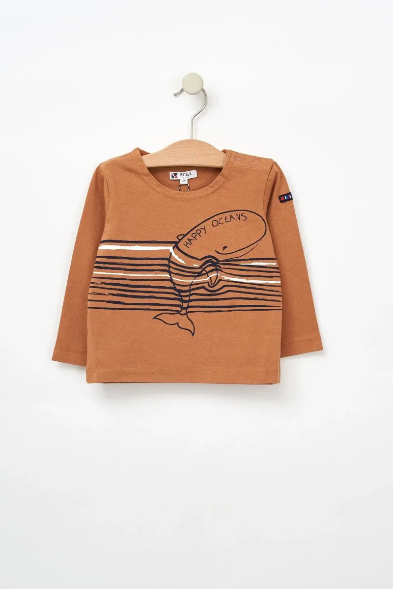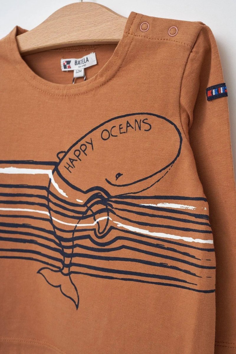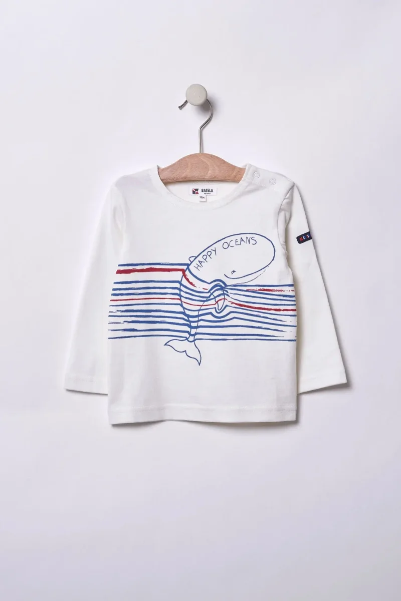 Camiseta con una ballena serigrafiada con el texto ‘Happy oceans’. Confeccionada en algodón de 220 gramos.