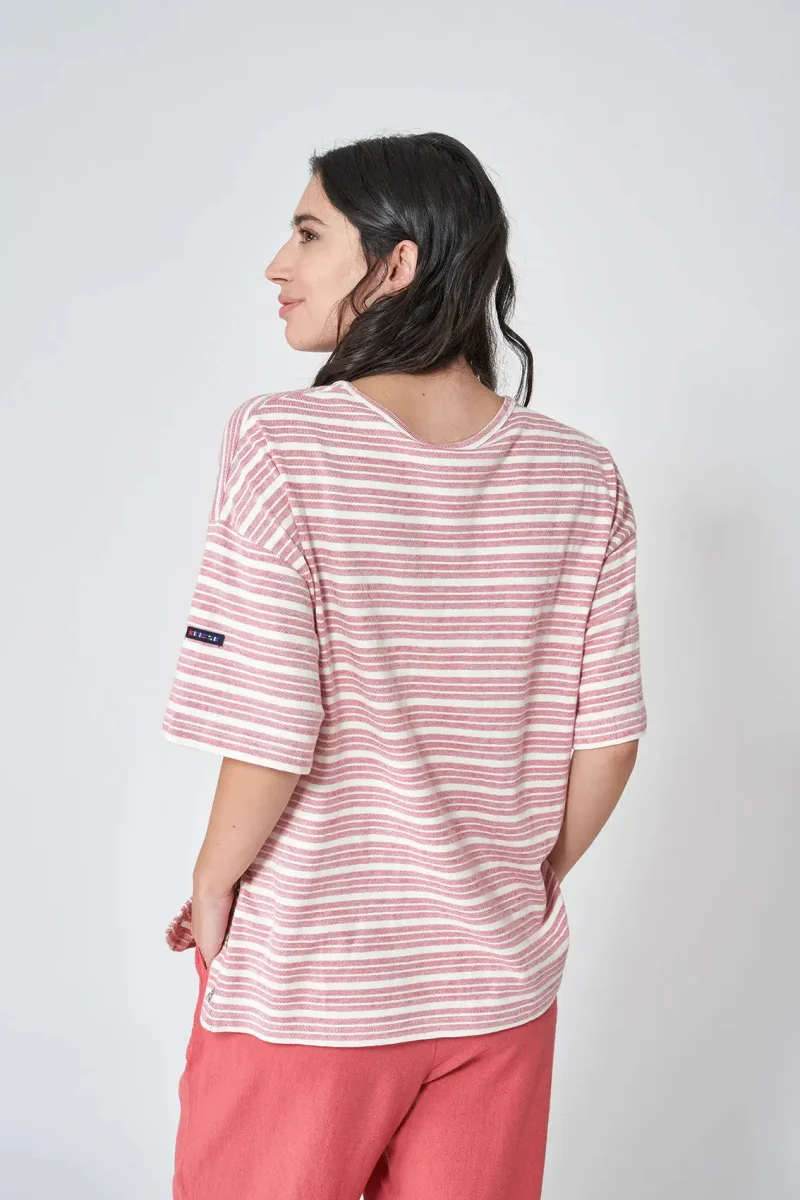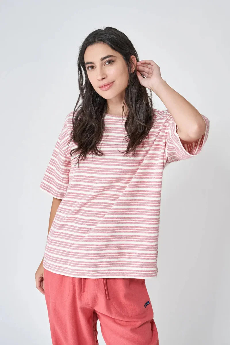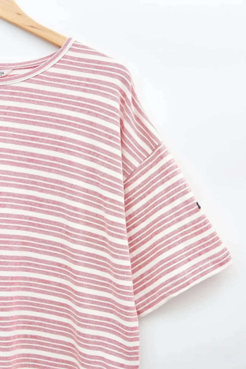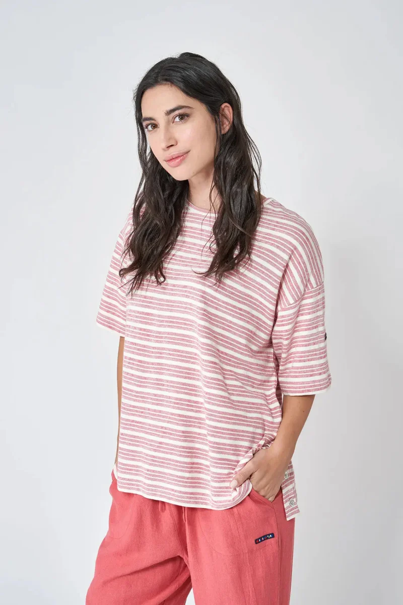 Esta camiseta oversize de rayas es la esencia del confort chic, con un cuello redondo clásico y una silueta amplia que ofrece un toque contemporáneo al atuendo diario. Las rayas, un eterno favorito náutico, se presentan en esta prenda amplia que invita a la comodidad sin sacrificar el estilo.
