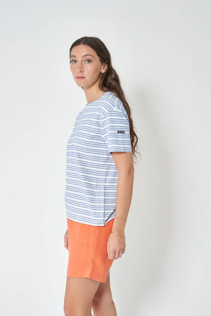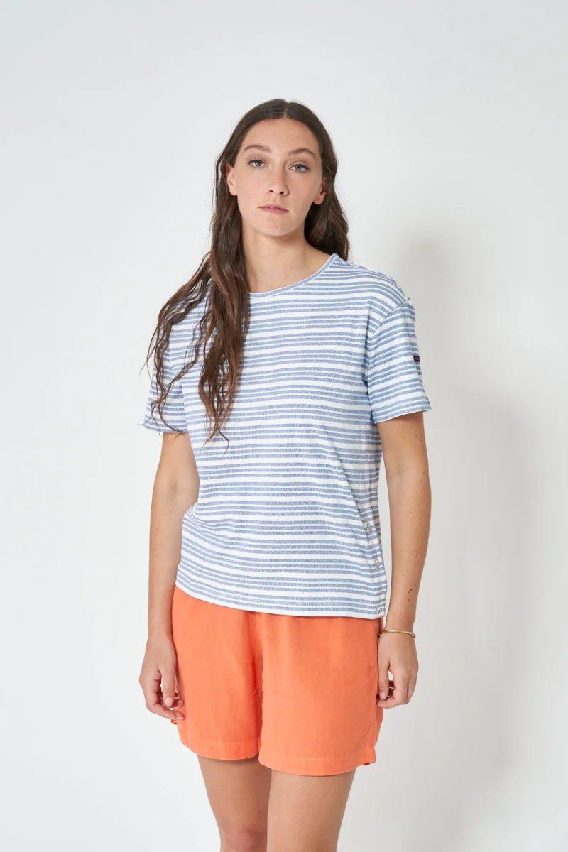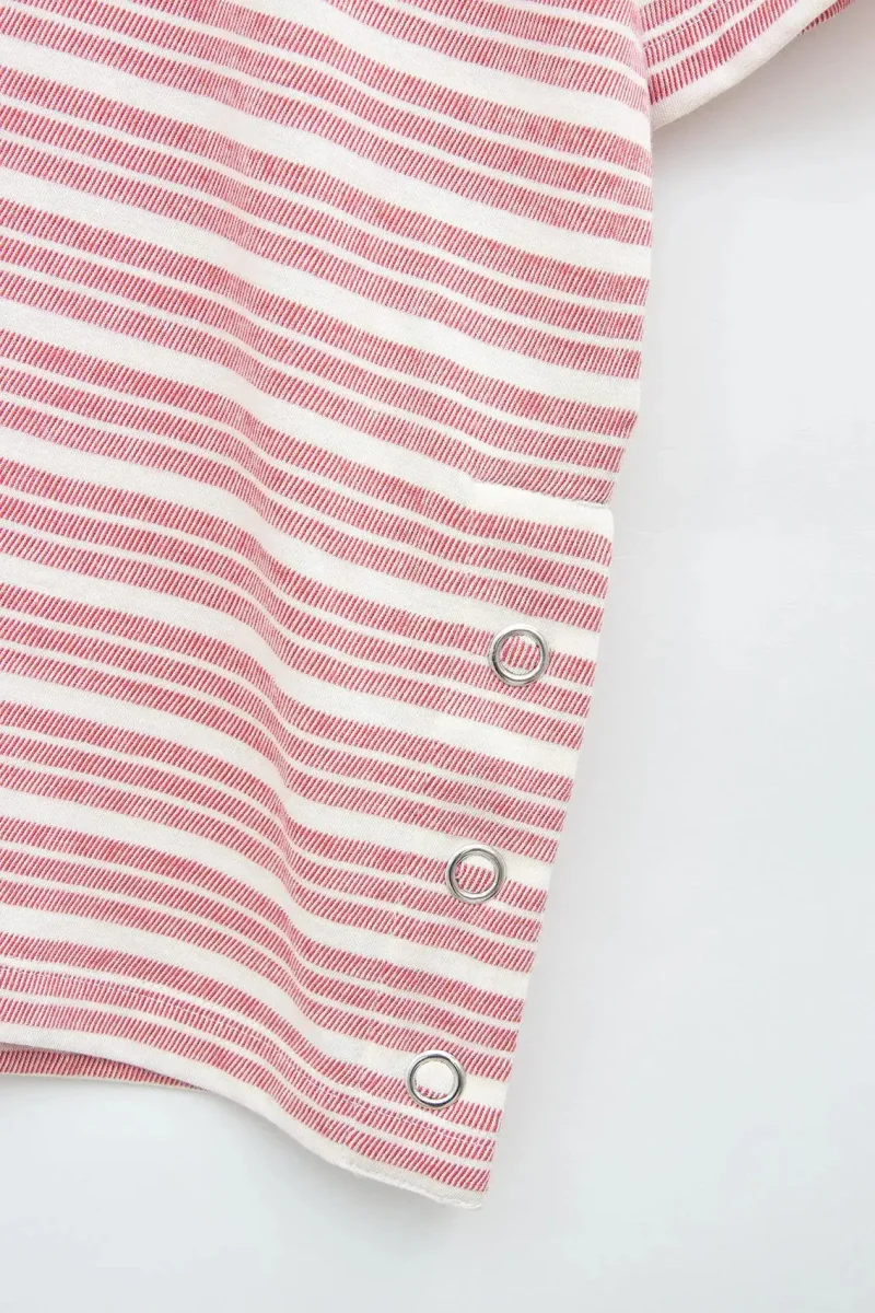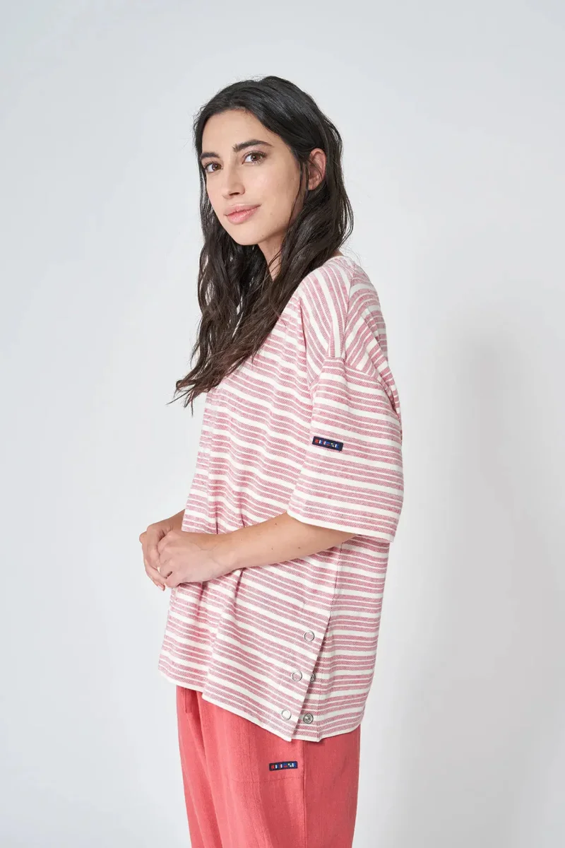 Esta camiseta oversize de rayas es la esencia del confort chic, con un cuello redondo clásico y una silueta amplia que ofrece un toque contemporáneo al atuendo diario. Las rayas, un eterno favorito náutico, se presentan en esta prenda amplia que invita a la comodidad sin sacrificar el estilo.