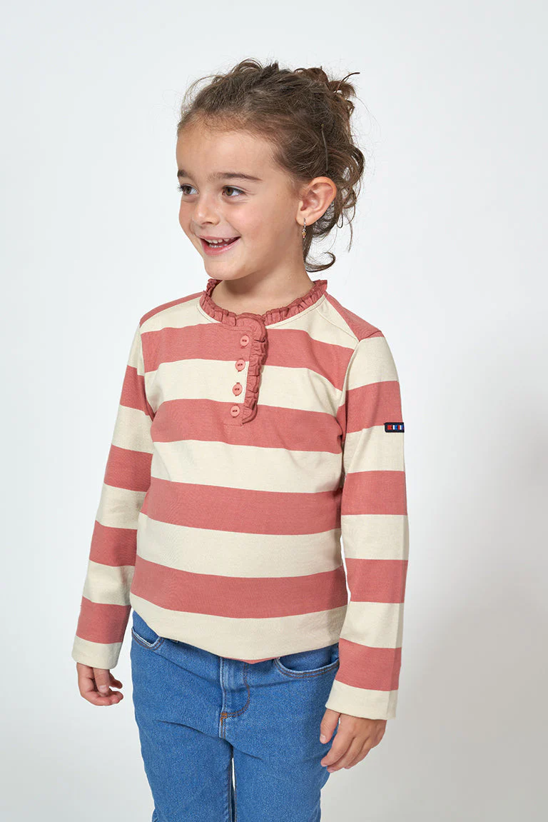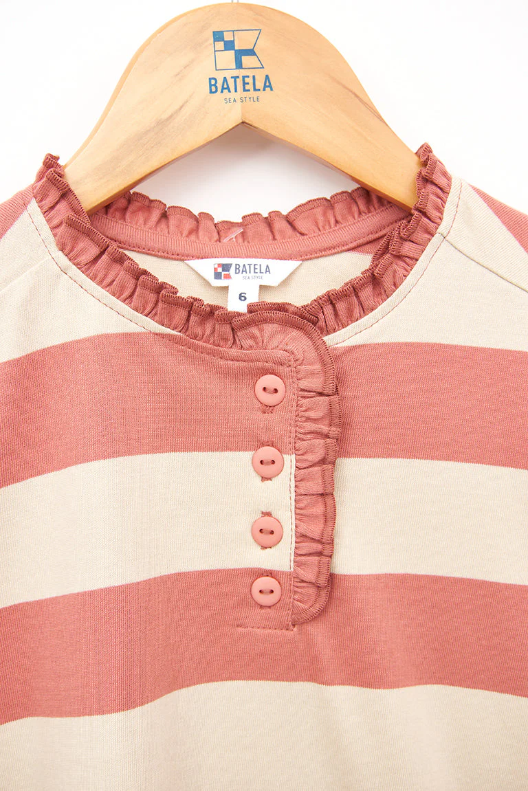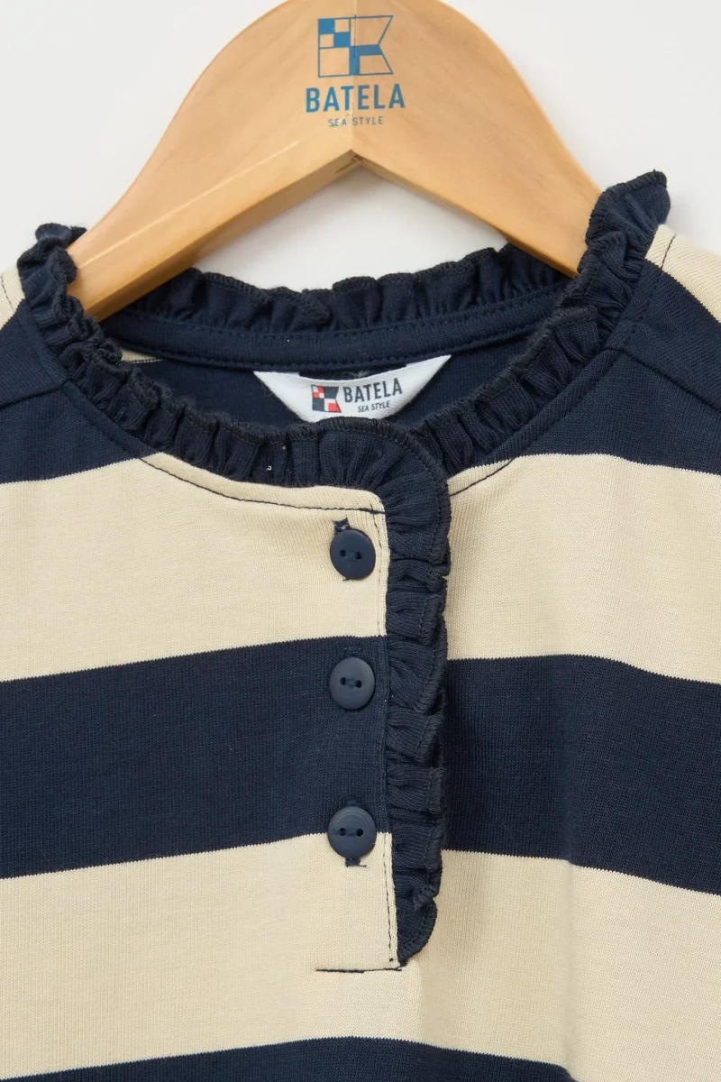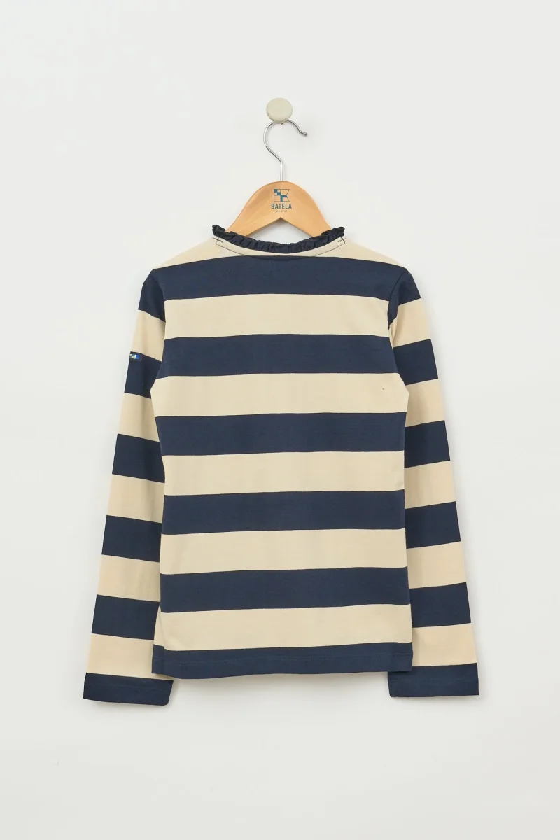 Camiseta para niña de manga larga fabricada en algodón de 220gr con estampado a rayas. Botonadura en el pecho con detalle decorativo de volante continuado por todo el cuello.