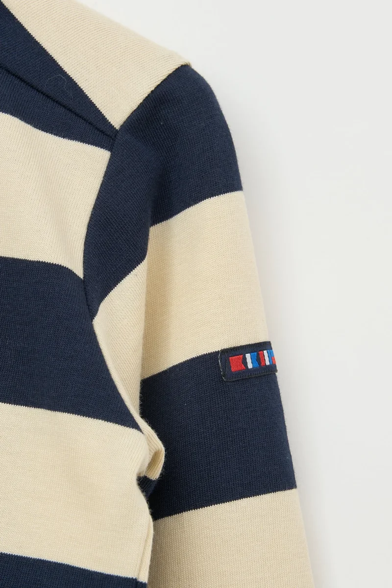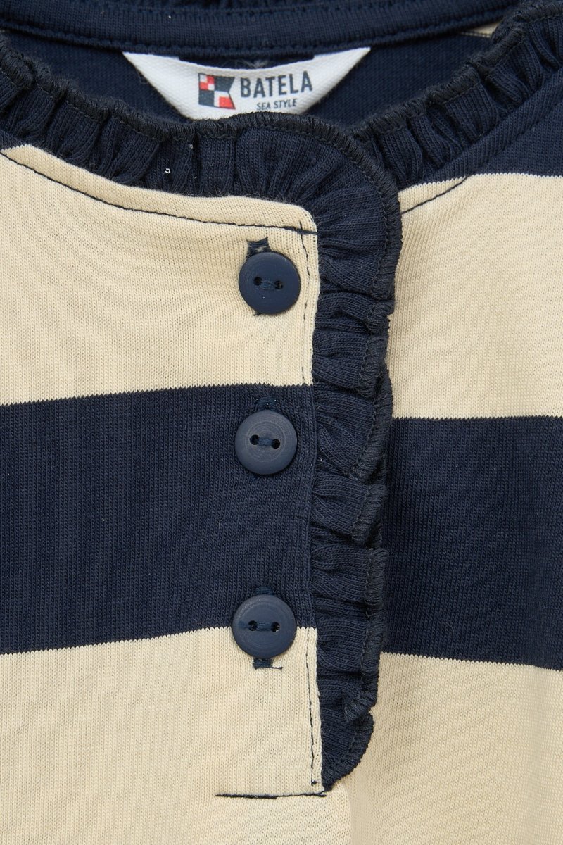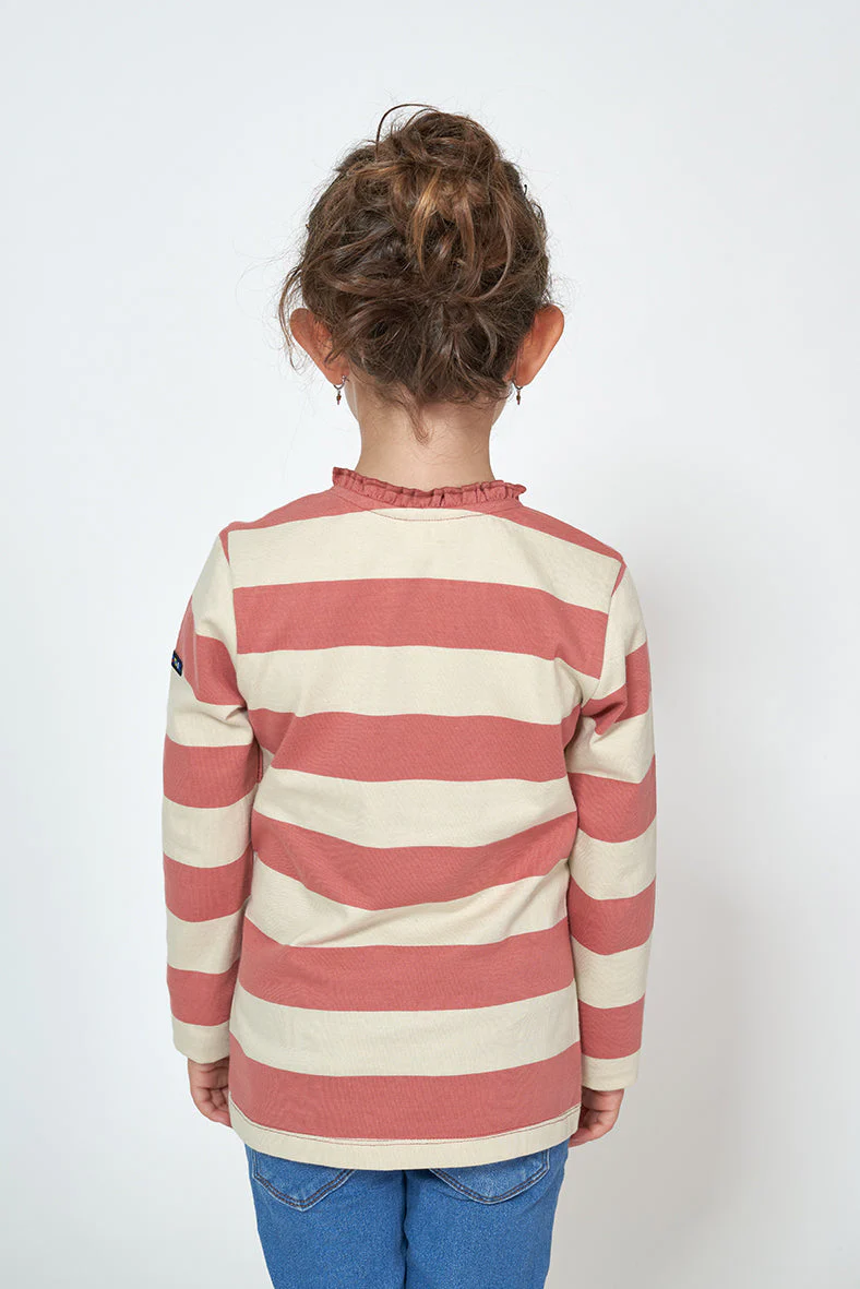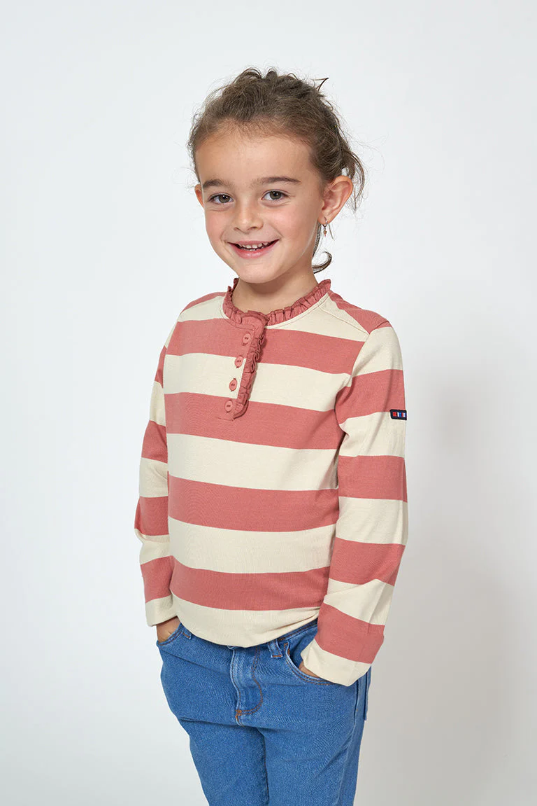 Camiseta para niña de manga larga fabricada en algodón de 220gr con estampado a rayas. Botonadura en el pecho con detalle decorativo de volante continuado por todo el cuello.