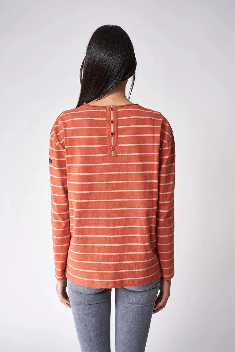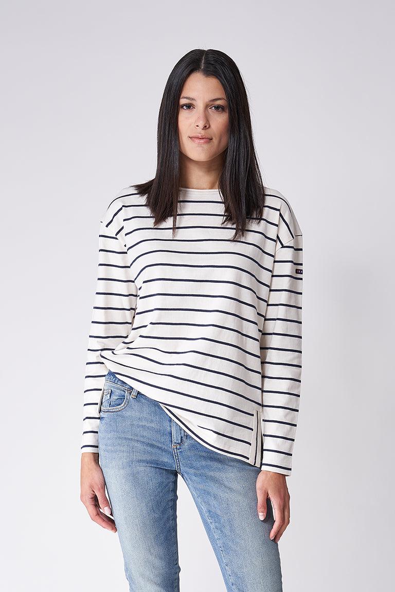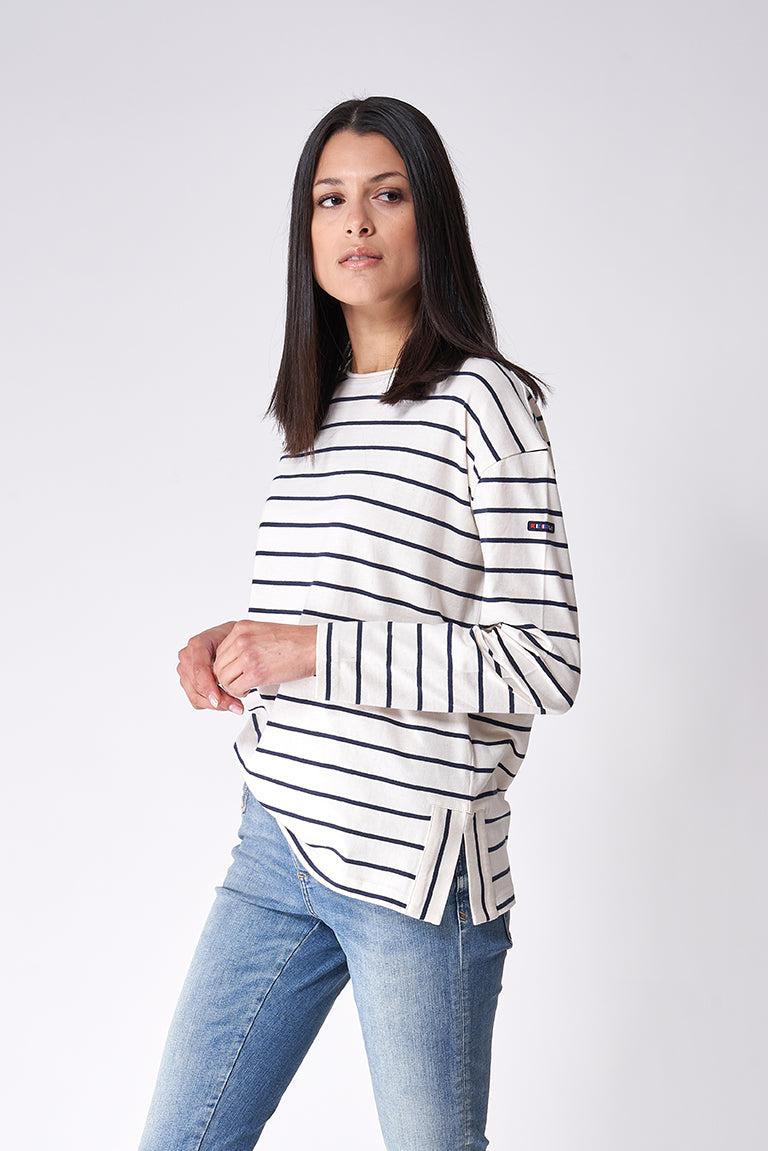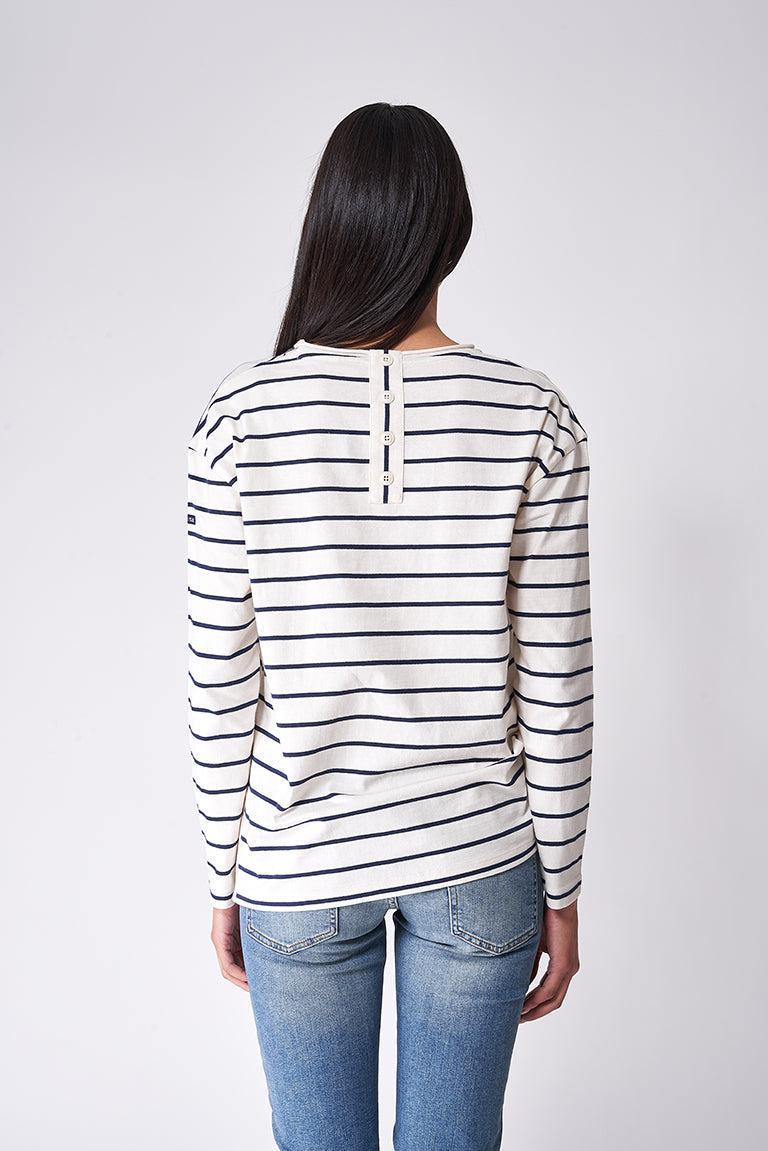 Camiseta marsellesa de mujer en algodón y manga larga, con cortes laterales inferiores y corte oversize. Tiene botones en la parte trasera.