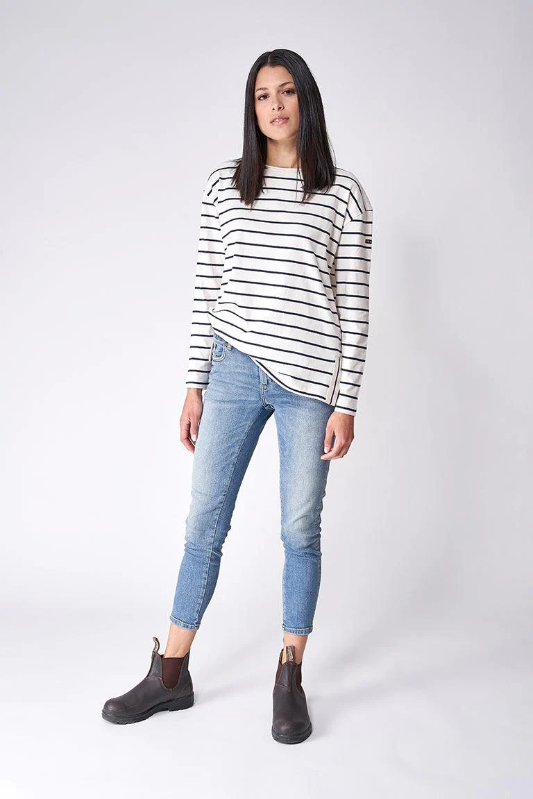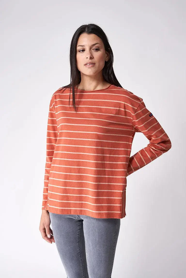 Camiseta marsellesa de mujer en algodón y manga larga, con cortes laterales inferiores y corte oversize. Tiene botones en la parte trasera. El tallaje es ligeramente grande. Es posible que necesite una talla menos de lo normal.