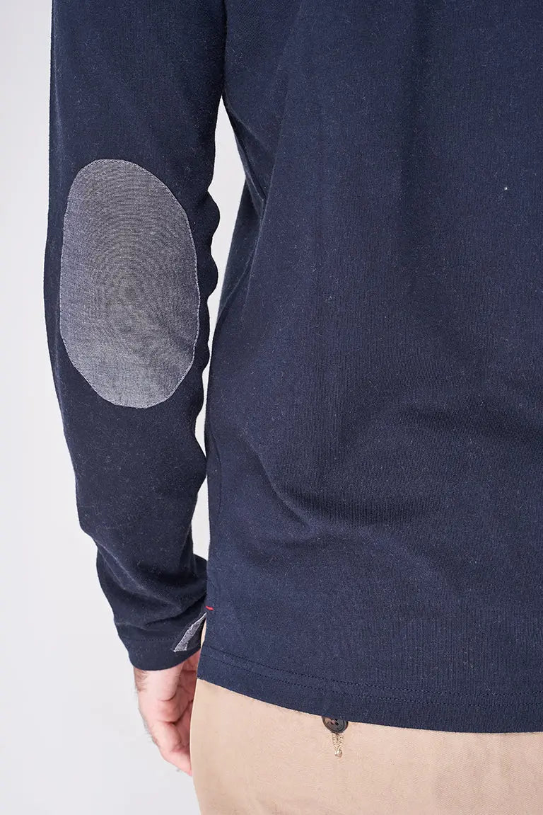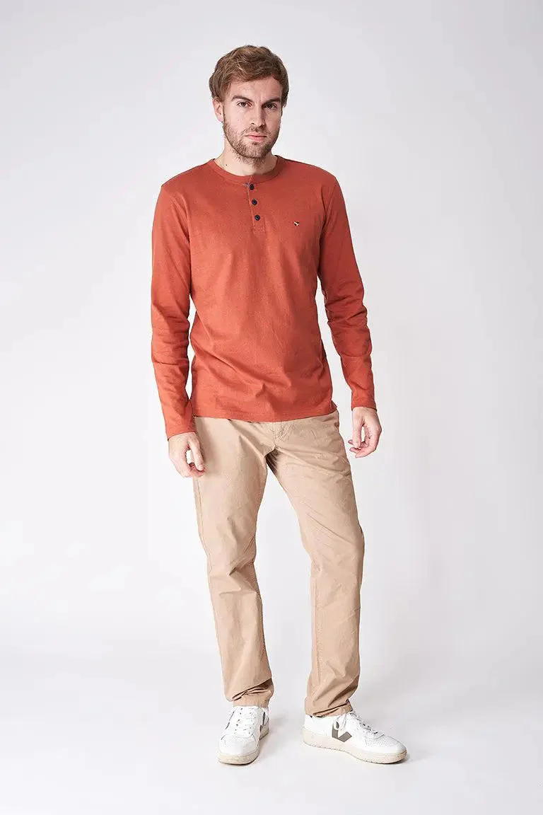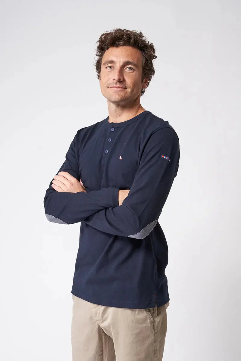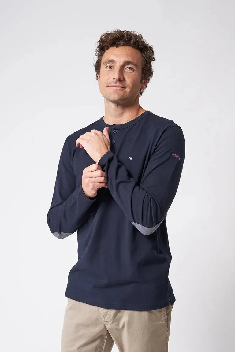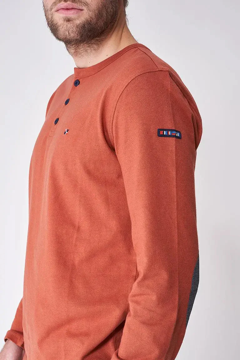 Camiseta de manga larga de algodón (220 gr) con botones. El tallaje es normal, el modelo mide sobre 1,80 y lleva la talla M.