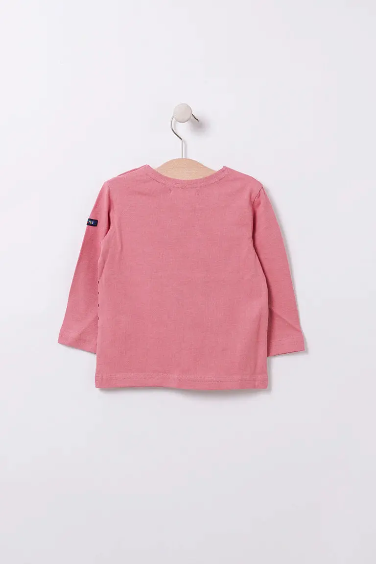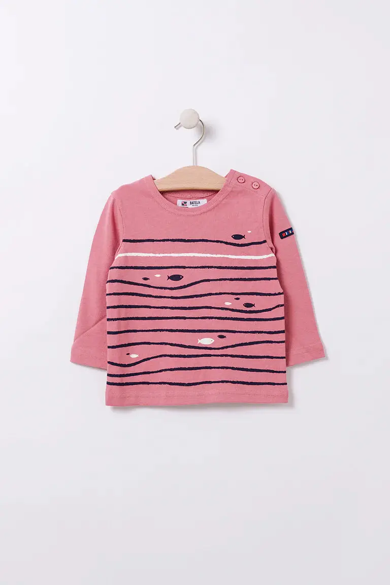 Camiseta de manga larga con serigrafía de peces y olas. Es 100% algodón de 220 gramos.