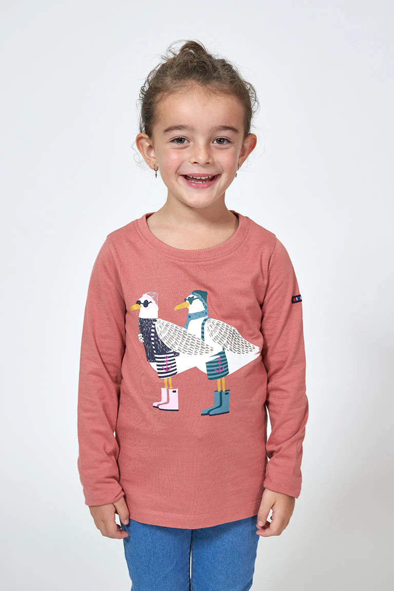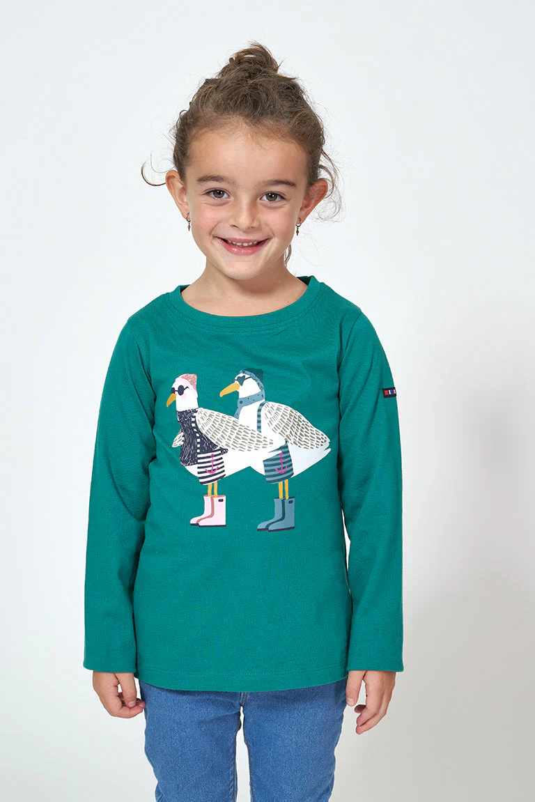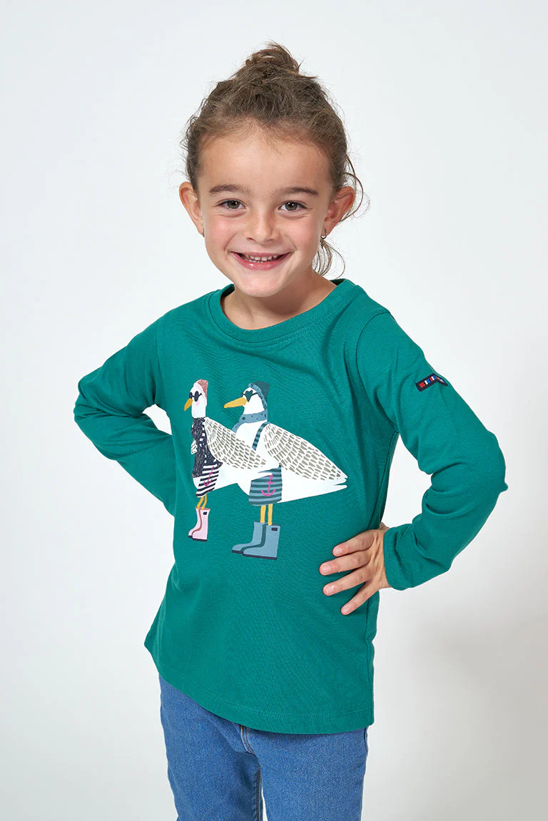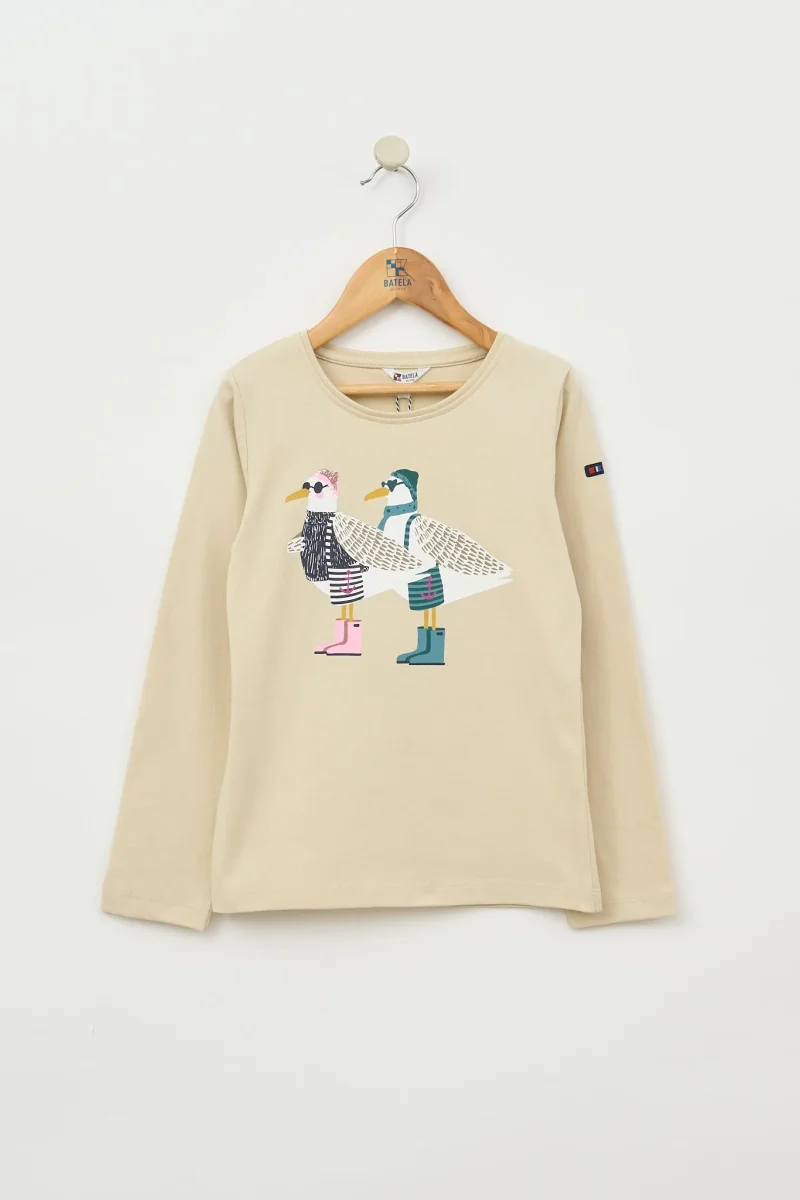 Camiseta para niño o niña de manga larga fabricada en algodón de 220gr con una serigrafía de gaviotas delante. Modelo de corte estándar con cuello redondo ribeteado en canalé y bajo recto.