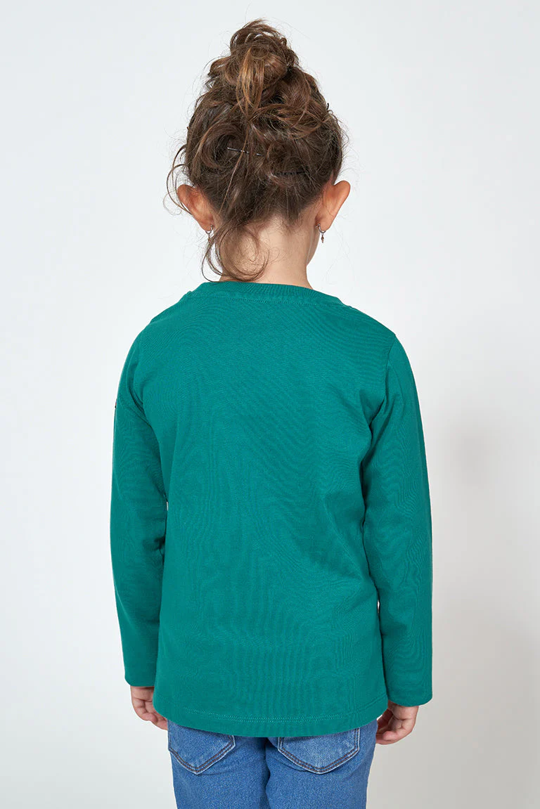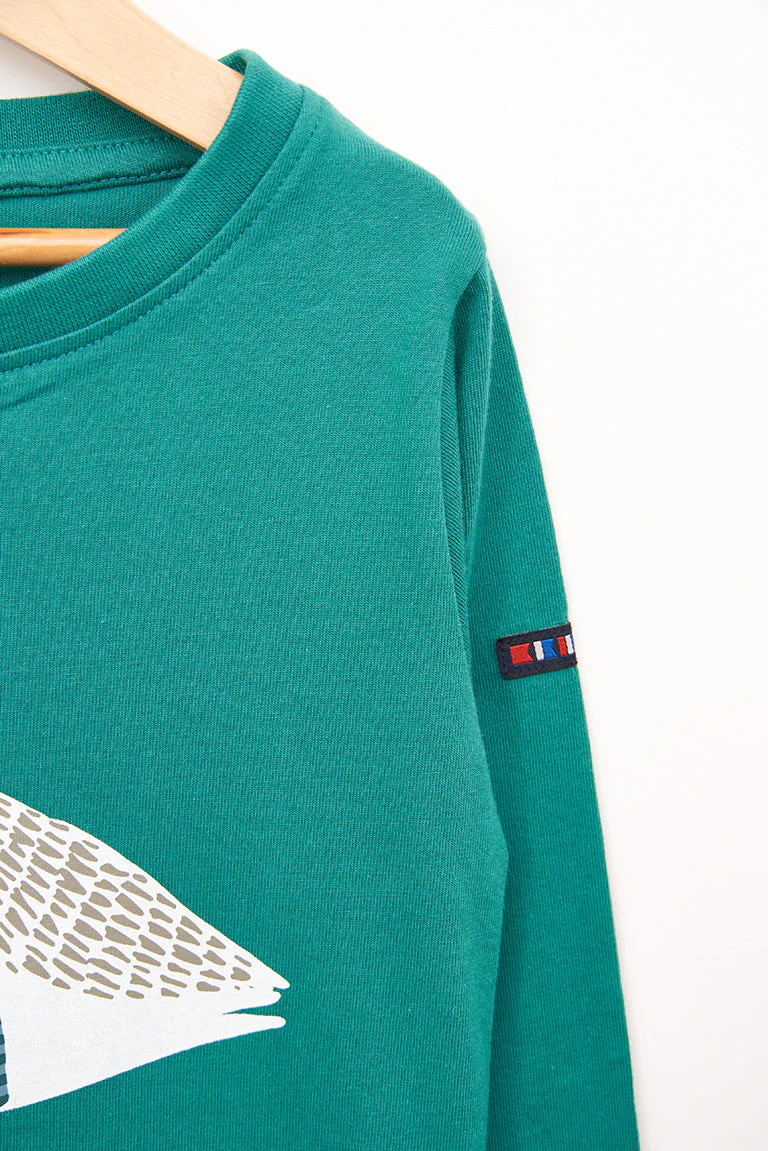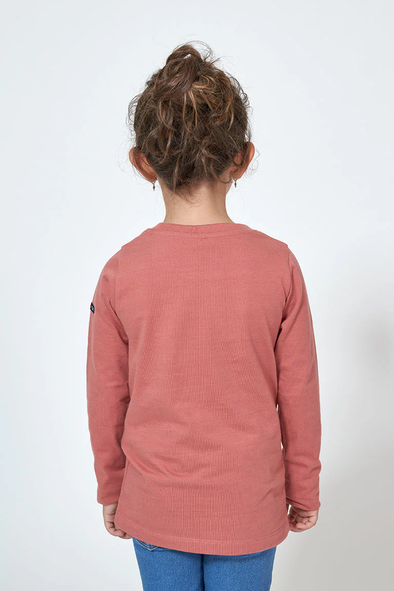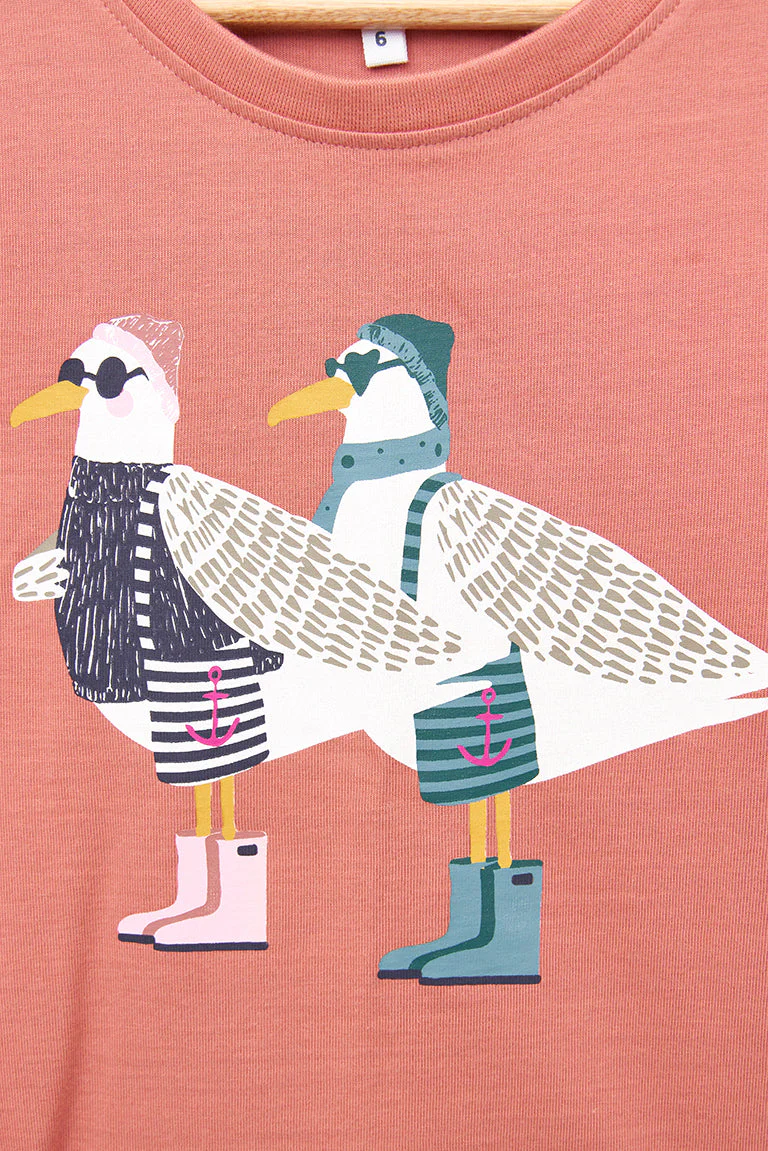 Camiseta para niño o niña de manga larga fabricada en algodón de 220gr con una serigrafía de gaviotas delante. Modelo de corte estándar con cuello redondo ribeteado en canalé y bajo recto.