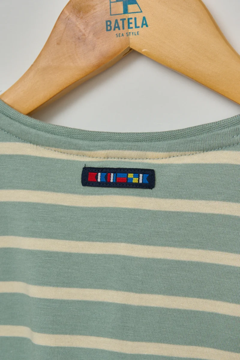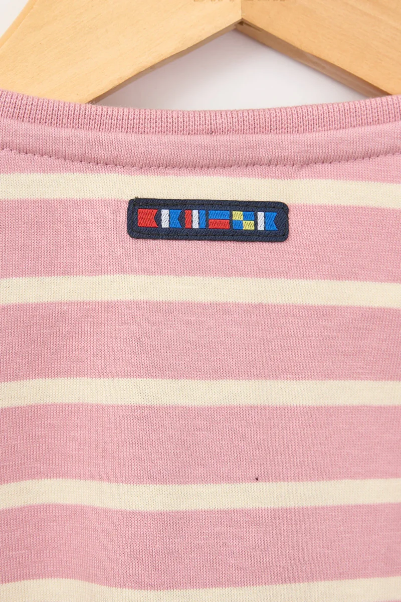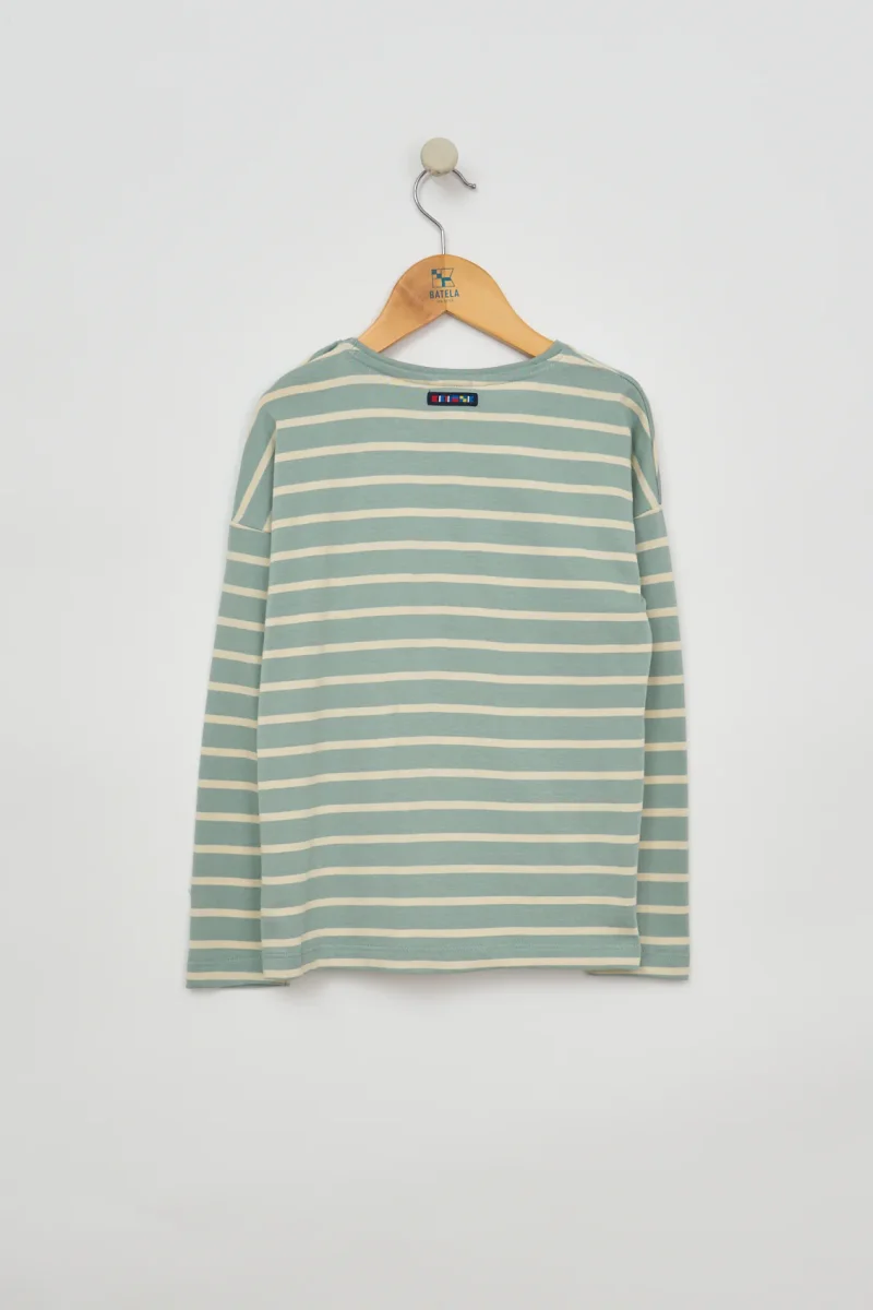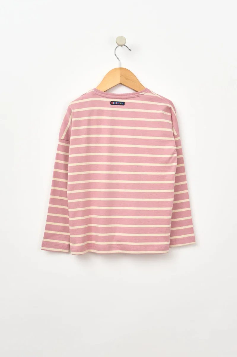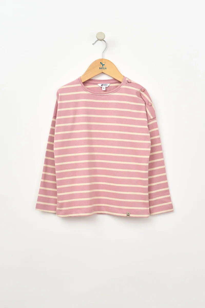 Camiseta de niña con estampado de rayas marineras, confeccionada en 100% algodón de 220 gramos, un tejido suave y resistente, ideal para el uso diario.