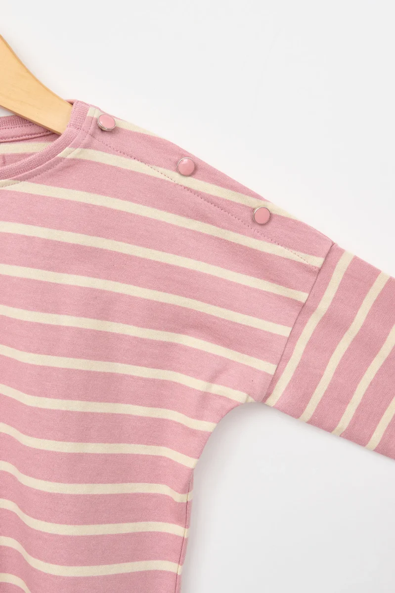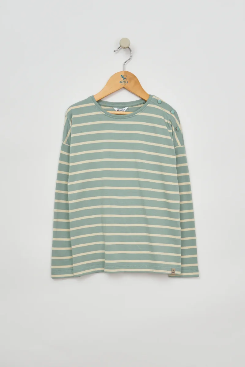 Camiseta de niña con estampado de rayas marineras, confeccionada en 100% algodón de 220 gramos, un tejido suave y resistente, ideal para el uso diario. Presenta un corte oversize fit con hombro caído, que aporta un look relajado y actual. Incluye un detalle de botones decorativos a tono en el hombro, que añade un toque […]