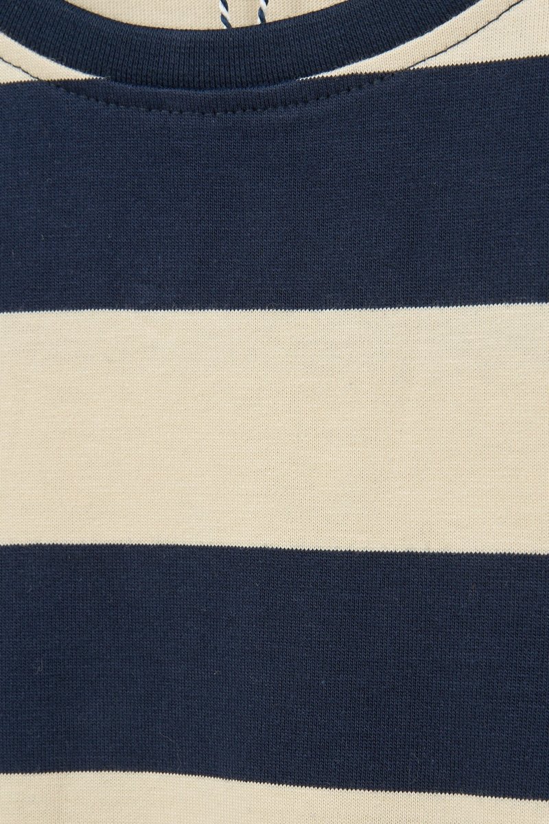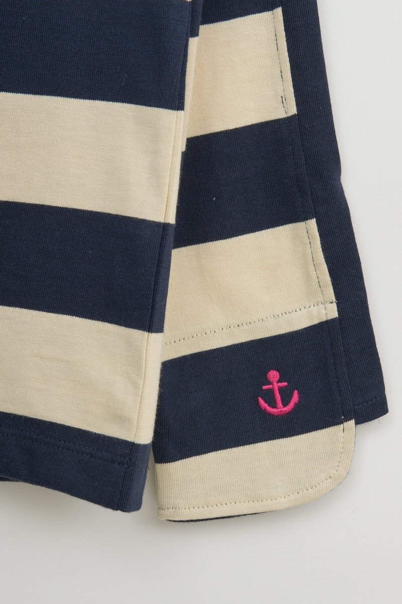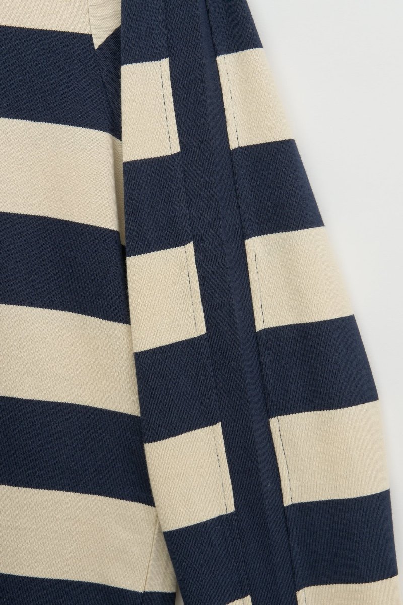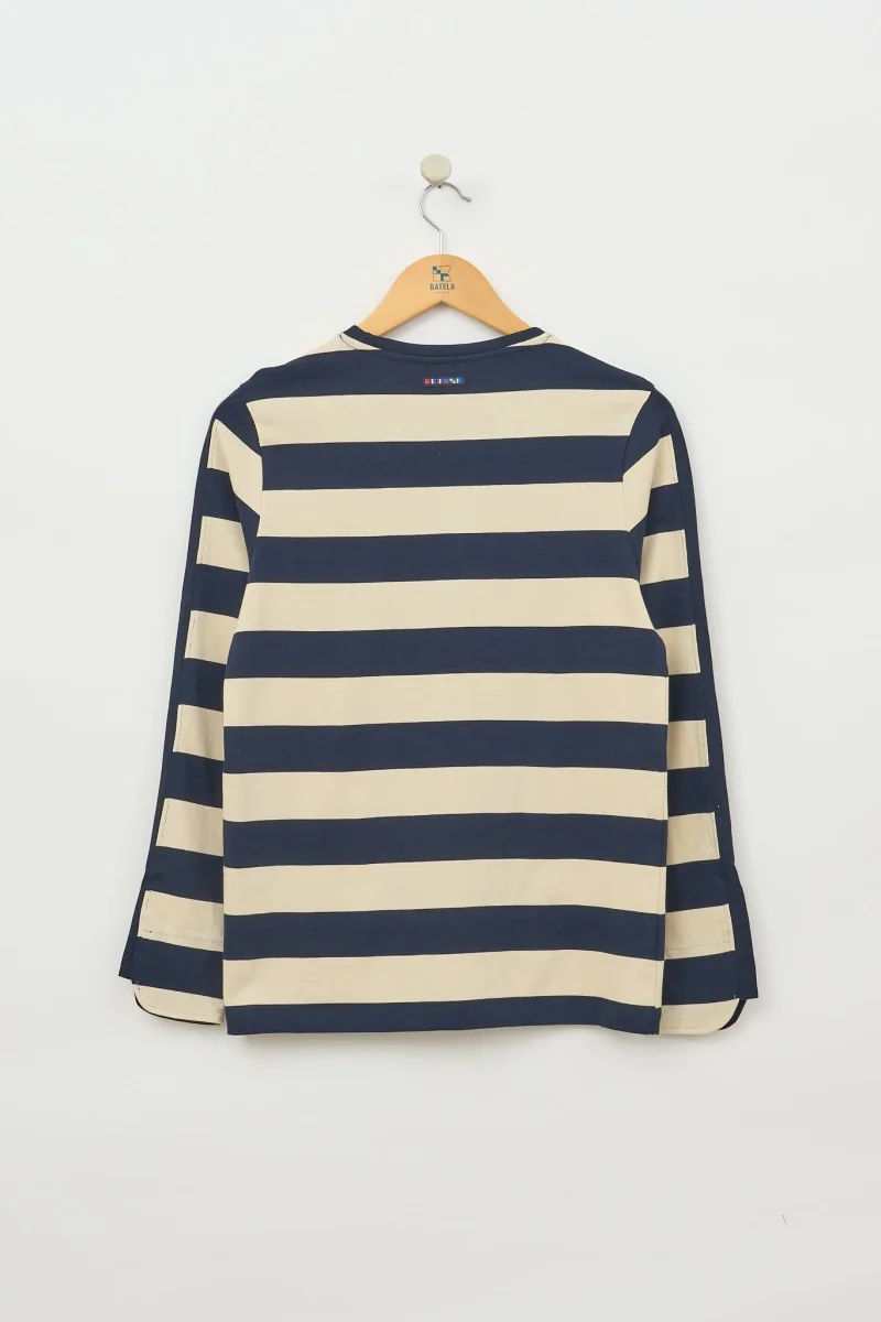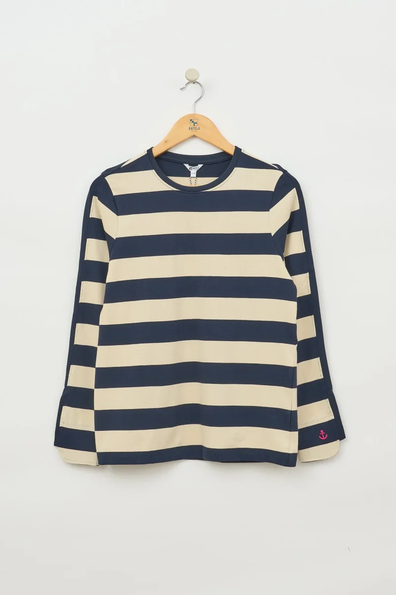 Camiseta para mujer confeccionada en algodón de manga larga. Tiene un estampado marinero con raya ancha y un bonito acabado en los puños con forma redondeada con un ancla bordada. La modelo mide 1,72m y lleva una talla 38