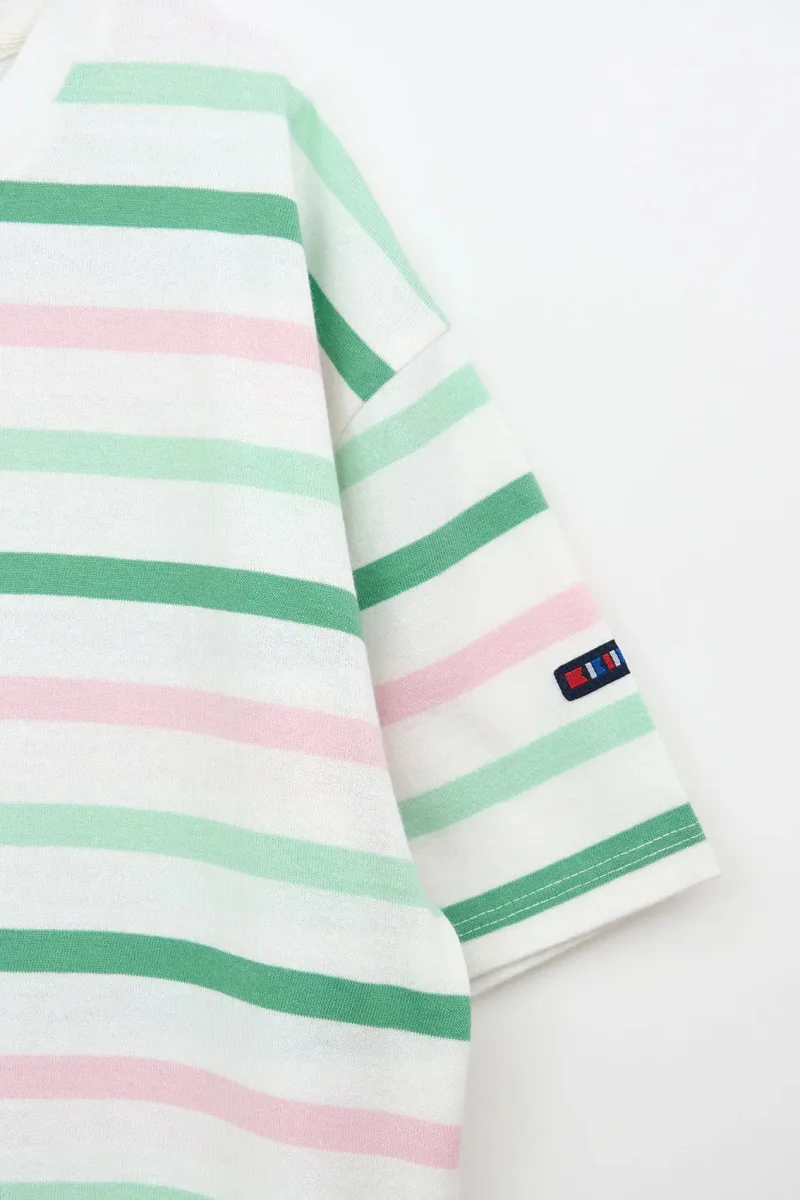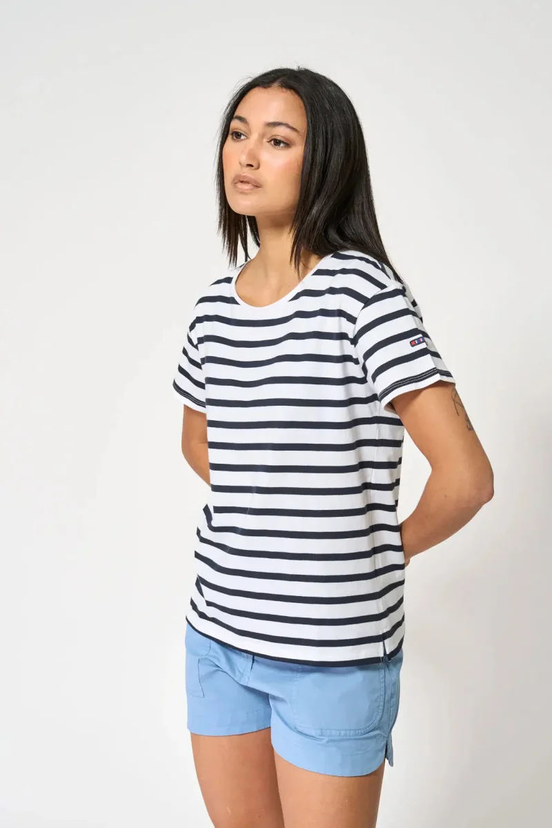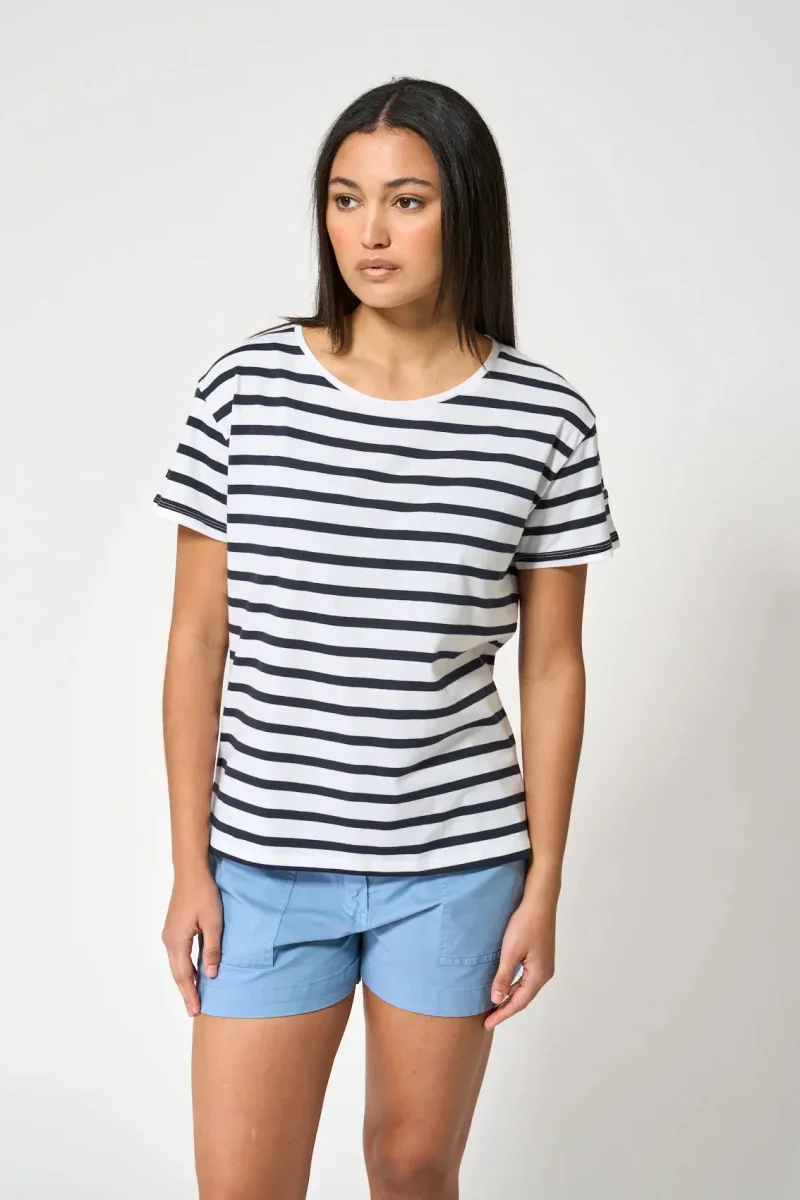 El diseño de rayas, sinónimo de la moda náutica, combina a la perfección con cualquier prenda, ofreciendo un sinfín de posibilidades para crear looks versátiles. La textura suave y la durabilidad del tejido hacen de esta camiseta una pieza básica y duradera para cualquier aventura costera o urbana.