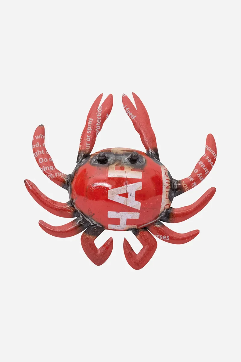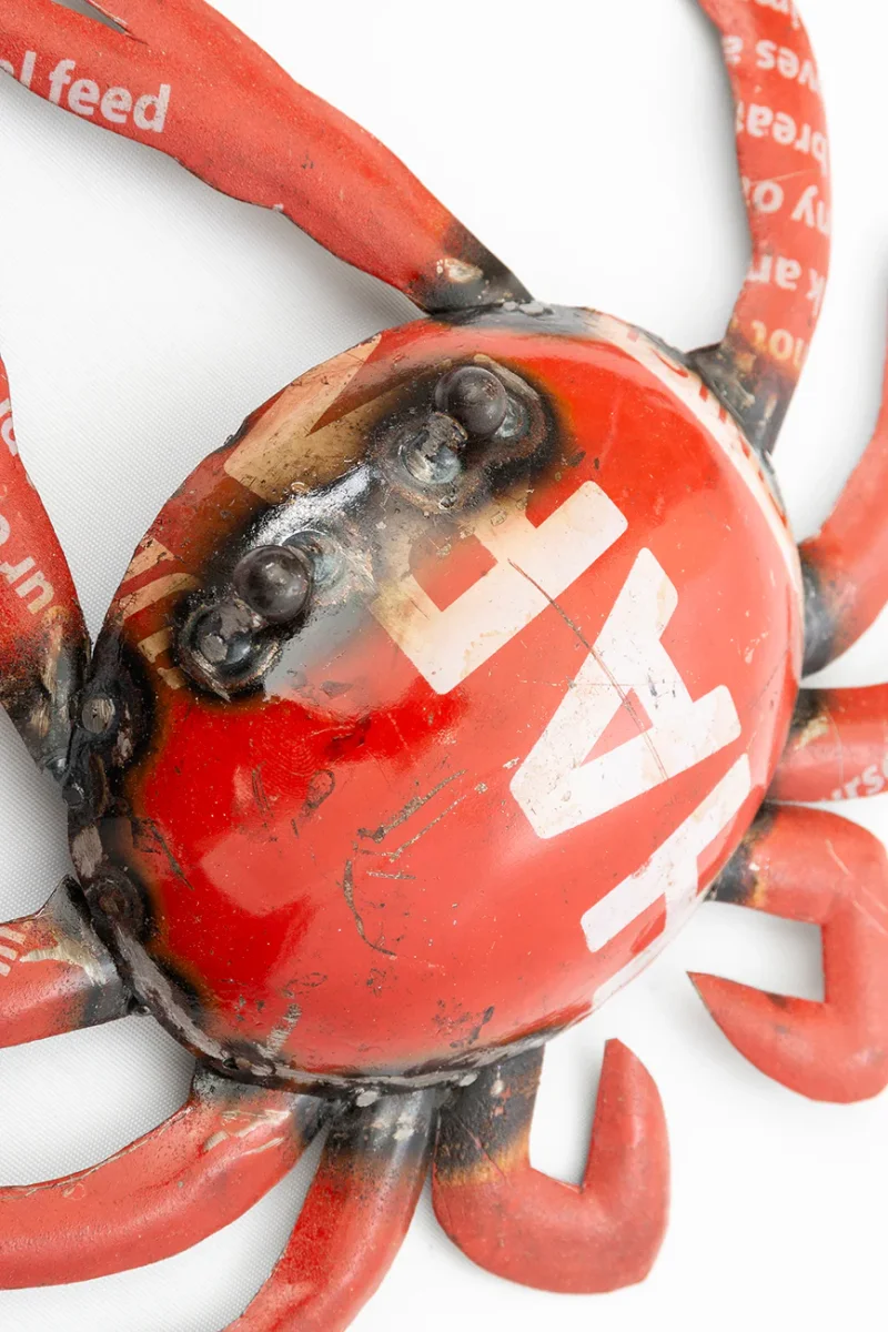 Pequeño cangrejo de metal de bidones reciclados. Una pieza original para dotar de un estilo náutico único cualquier estancia del hogar. Color rojo