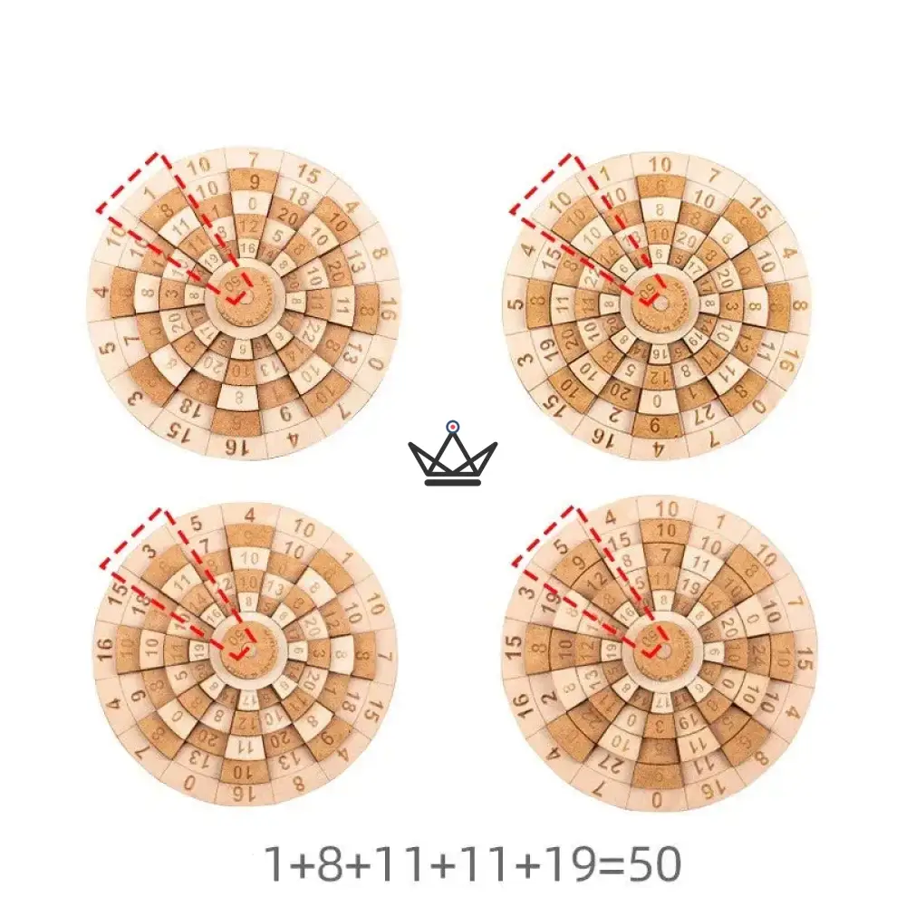 Chaque cercle peut être tourné indépendamment, et les 5 anneaux rotatifs exposent ou cachent les chiffres du cercle inférieur, rendant le jeu encore plus complexe. Vous devrez manipuler et ajuster chaque anneau pour aligner les bonnes valeurs et atteindre l’objectif ultime : trouver la somme exacte de 50 dans toutes les colonnes.