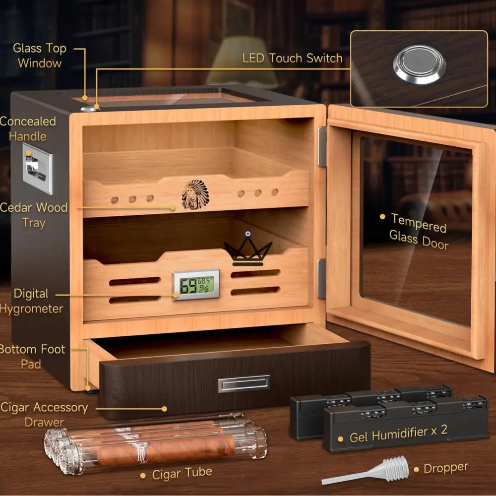 - Capacité généreuse : Jusqu’à 100 cigares, selon les formats.