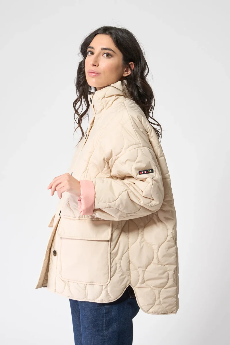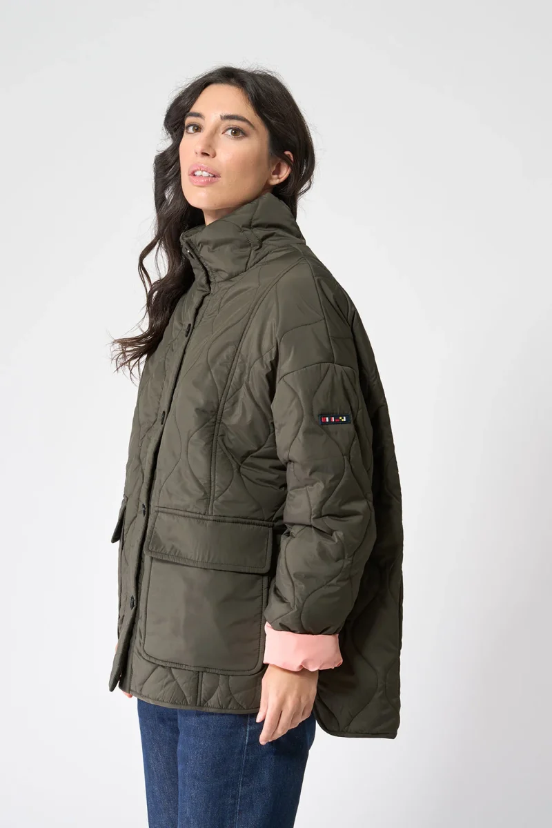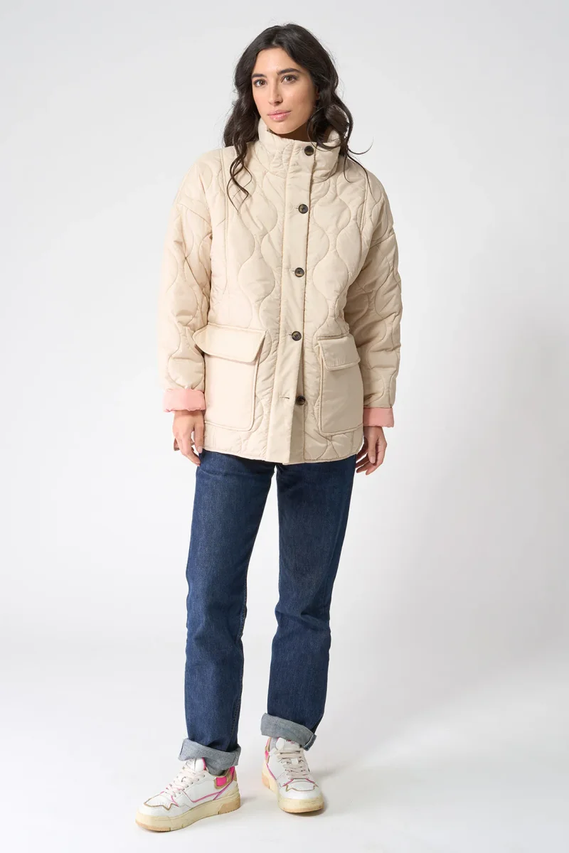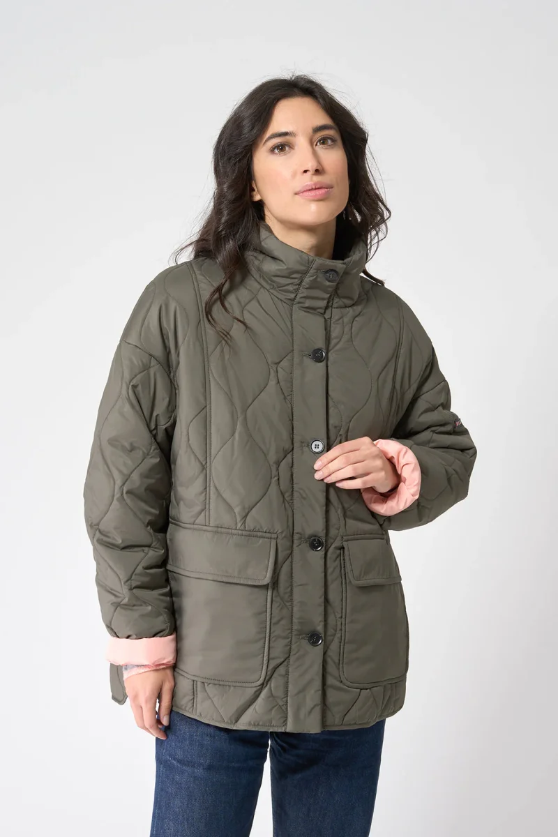 Cazadora de mujer acolchada con cuello elevado y ancho. El hombro es caído y el corte de la prenda es oversize. Tiene dos bolsillos plastrón con solapa. Detalle de forro interior rosa a contraste. Cierre frontal con botones.