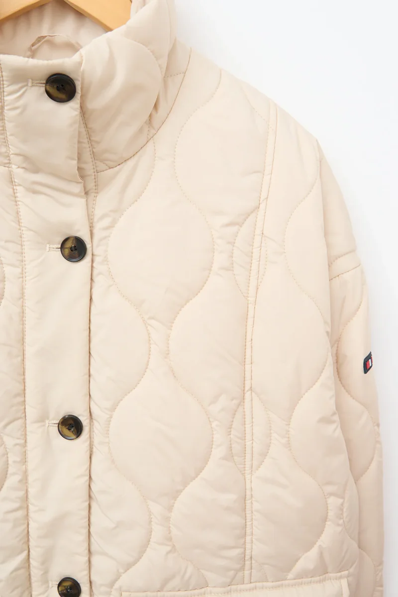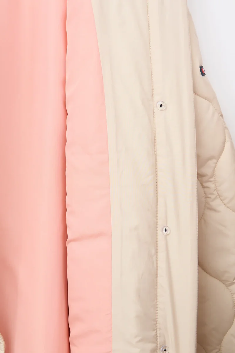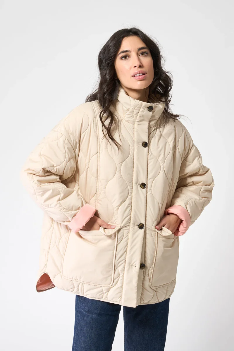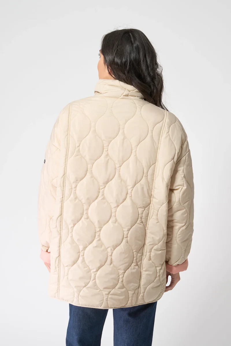 Cazadora de mujer acolchada con cuello elevado y ancho. El hombro es caído y el corte de la prenda es oversize. Tiene dos bolsillos plastrón con solapa. Detalle de forro interior rosa a contraste. Cierre frontal con botones.
