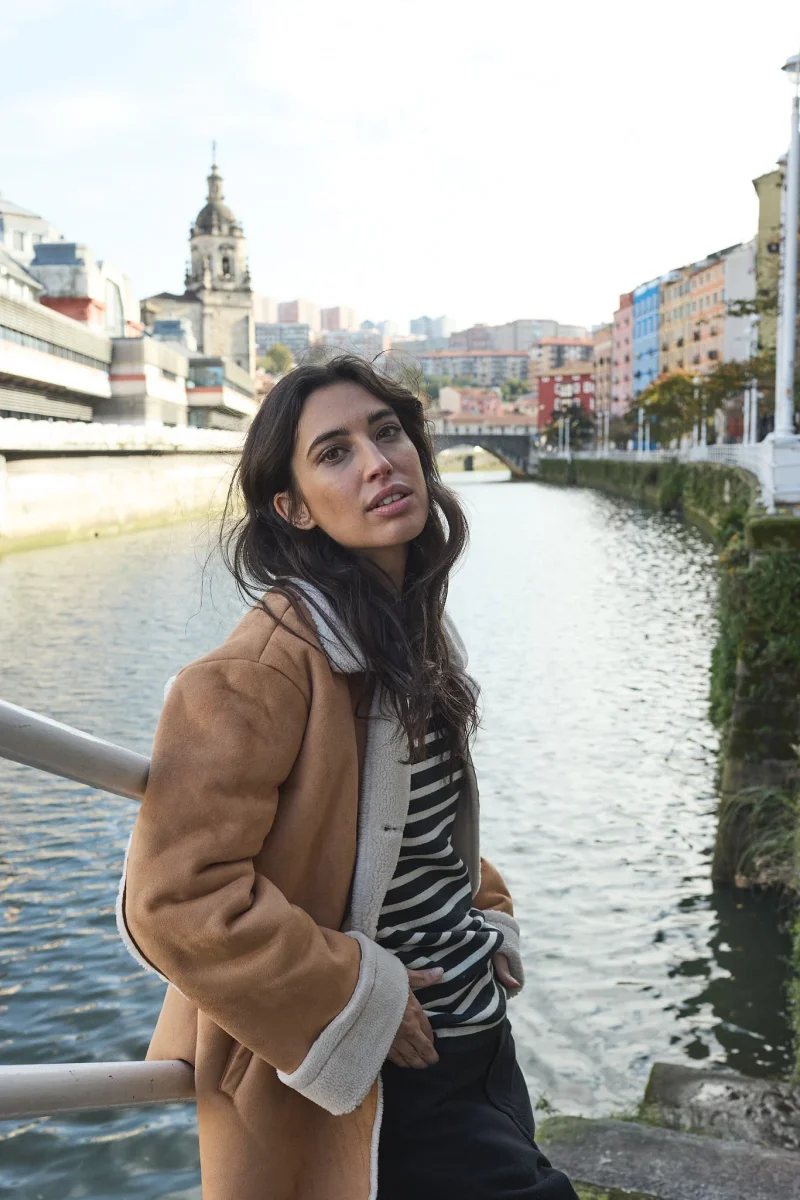 Cazadora confeccionada en tejido de doble faz, con interior de borreguito. Diseño de corte y hombro relajado, con cierre delantero mediante botones y bolsillos laterales de ojal. Los puños vuelto y el cuello en borreguito le hacen un bonito y elegante contraste a la prenda. La modelo mide 1,72m y lleva una talla 38.