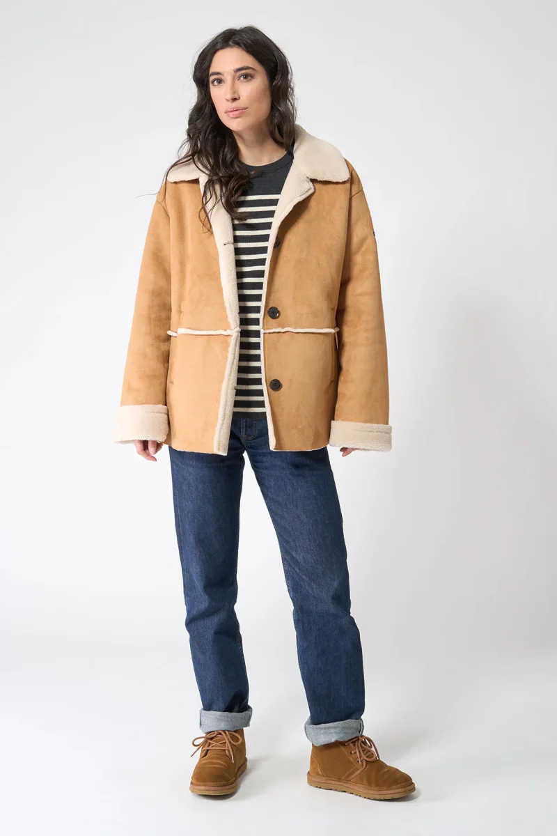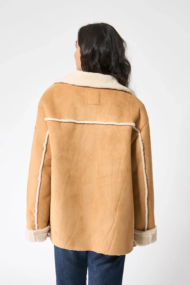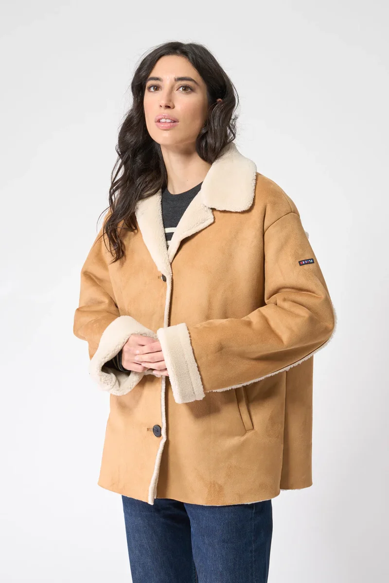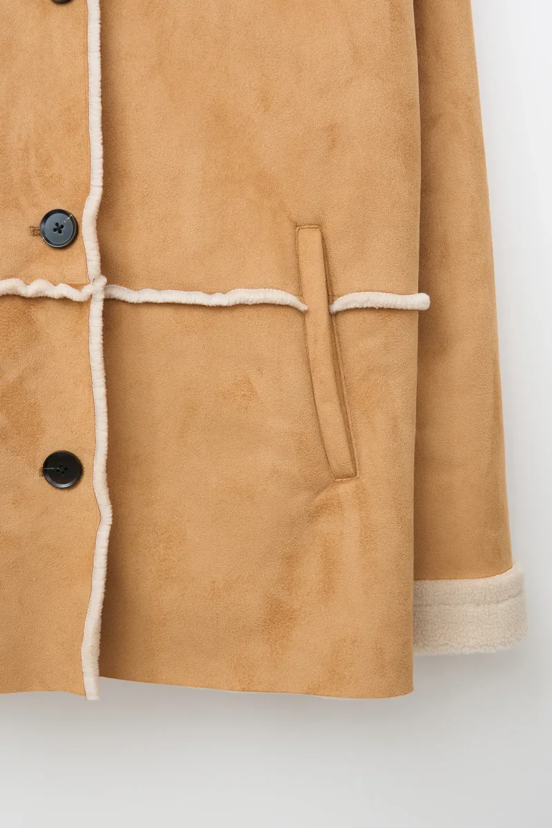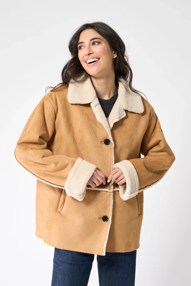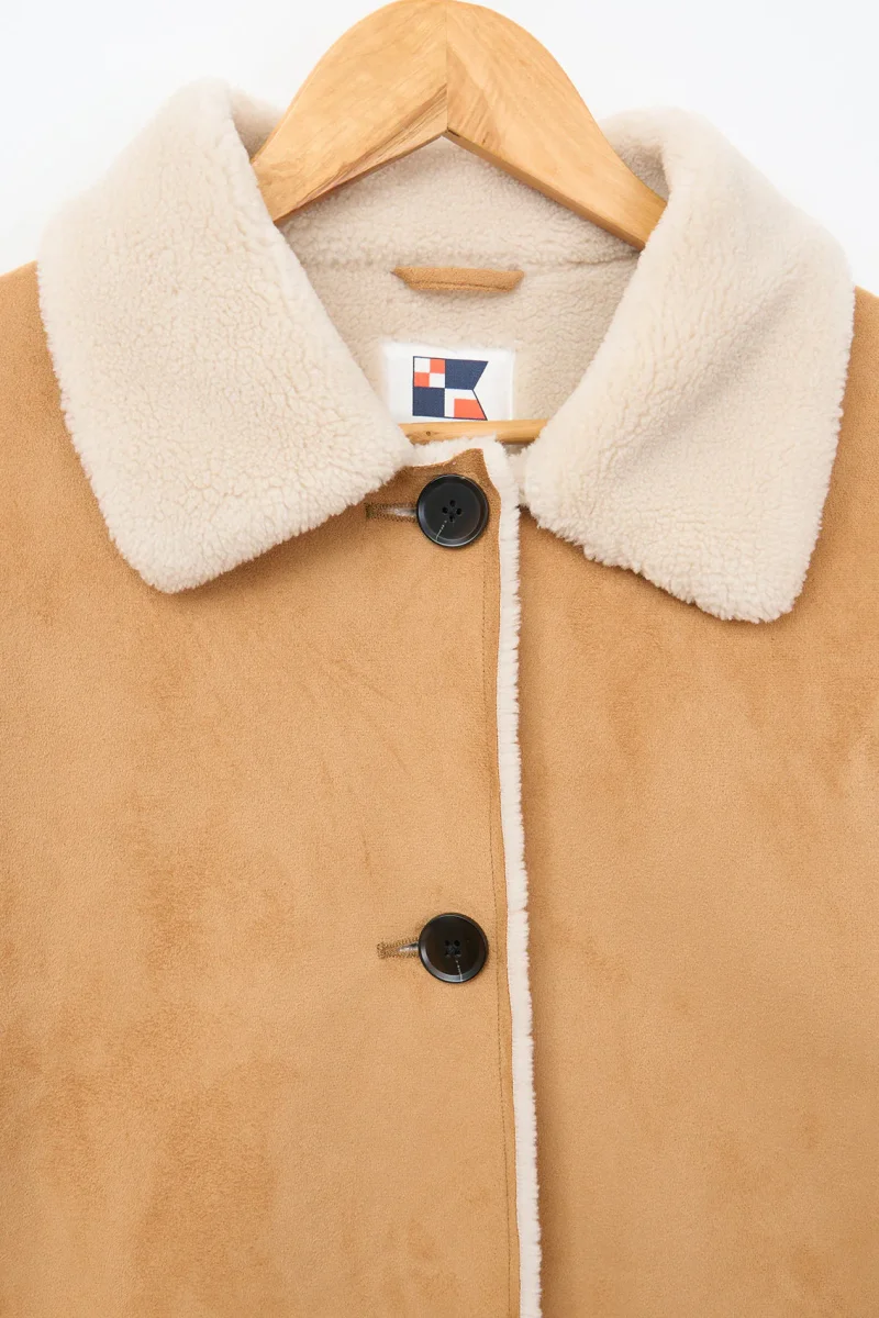 Cazadora confeccionada en tejido de doble faz, con interior de borreguito. Diseño de corte y hombro relajado, con cierre delantero mediante botones y bolsillos laterales de ojal. Los puños vuelto y el cuello en borreguito le hacen un bonito y elegante contraste a la prenda.