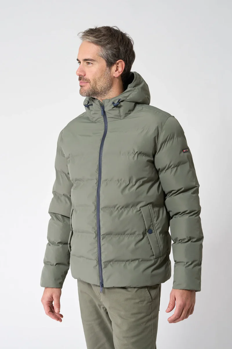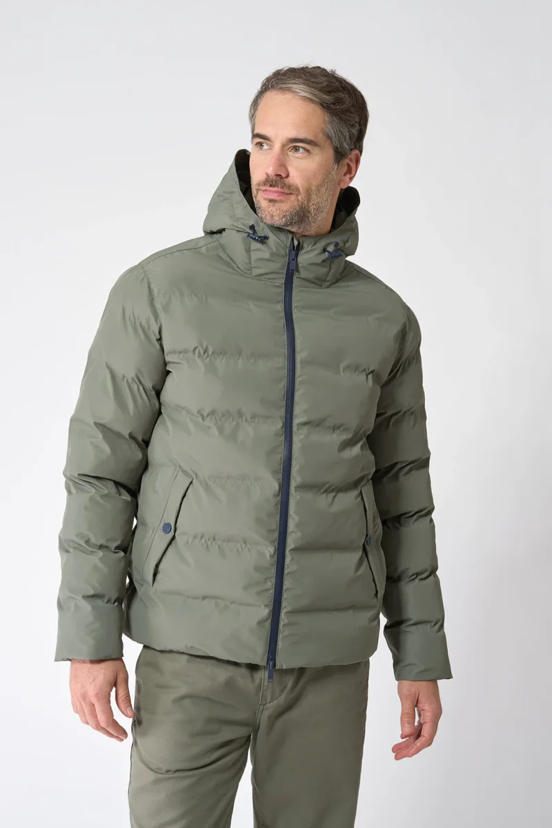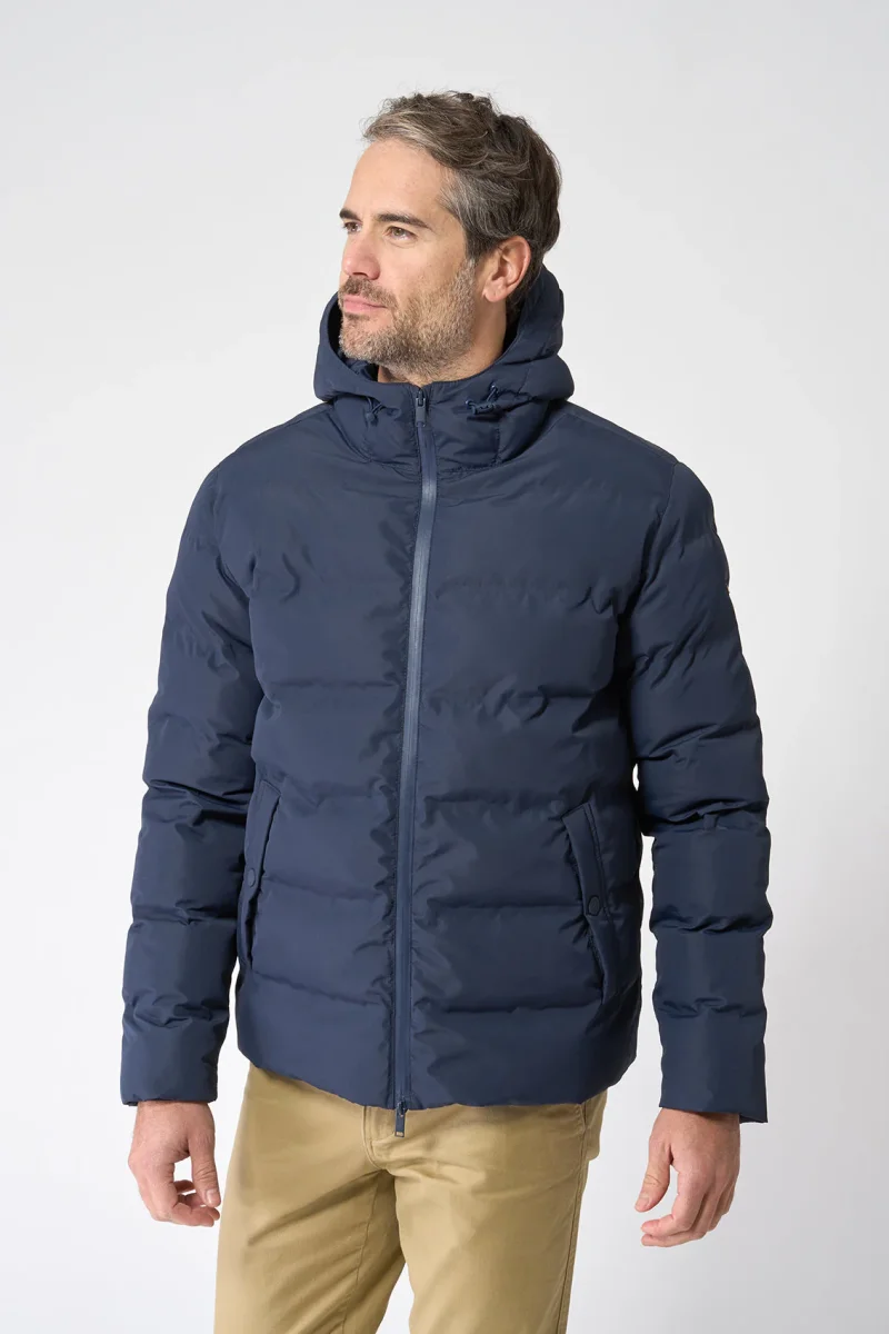 Cazadora tipo puffy o chubasquero acolchado 100% impermeable de hombre. Diseñada para ofrecer protección total frente a la lluvia y el viento. Incluye capucha ajustable, ideal para climas inestables, y está confeccionada con materiales resistentes al agua que aseguran máxima impermeabilidad sin sacrificar comodidad. Una prenda funcional y de estilo actual, perfecta para el uso diario o actividades al aire libre en días lluviosos. Waterproof. El modelo mide 1,83m y lleva una talla M.
