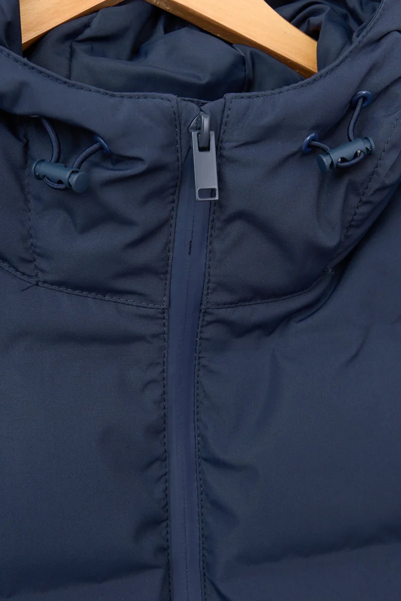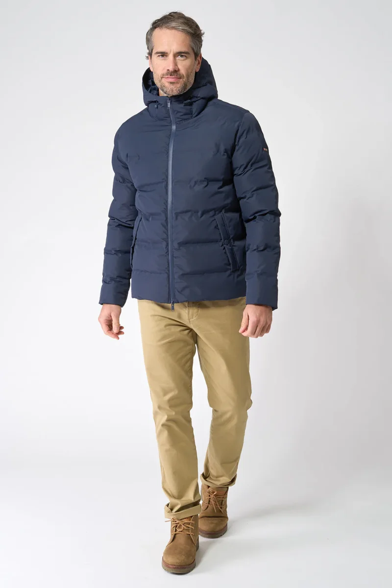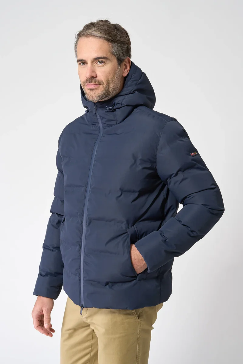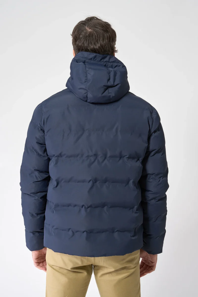 Cazadora tipo puffy o chubasquero acolchado 100% impermeable de hombre. Diseñada para ofrecer protección total frente a la lluvia y el viento. Incluye capucha ajustable, ideal para climas inestables, y está confeccionada con materiales resistentes al agua que aseguran máxima impermeabilidad sin sacrificar comodidad. Una prenda funcional y de estilo actual, perfecta para el uso diario o actividades al aire libre en días lluviosos. Waterproof. El modelo mide 1,83m y lleva una talla M.
