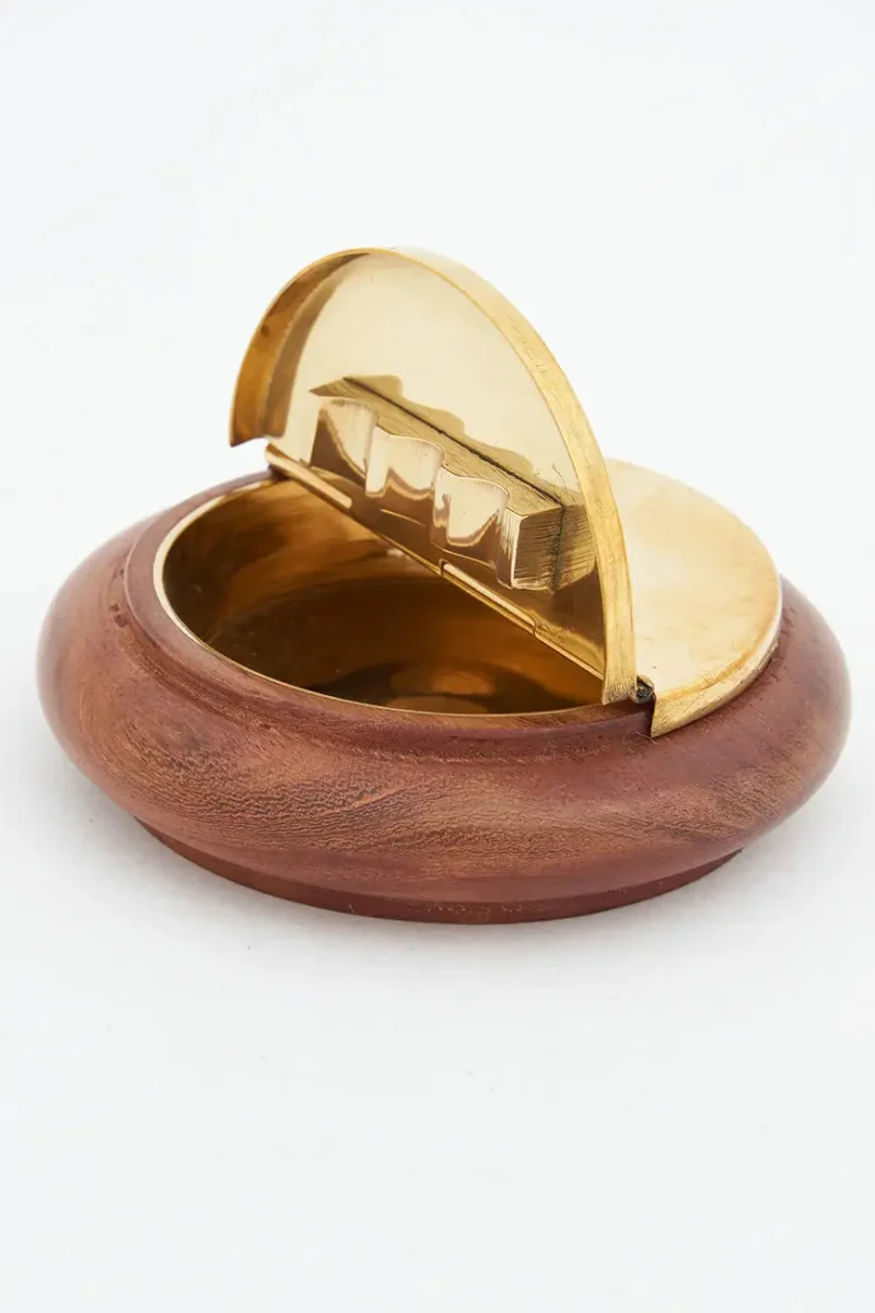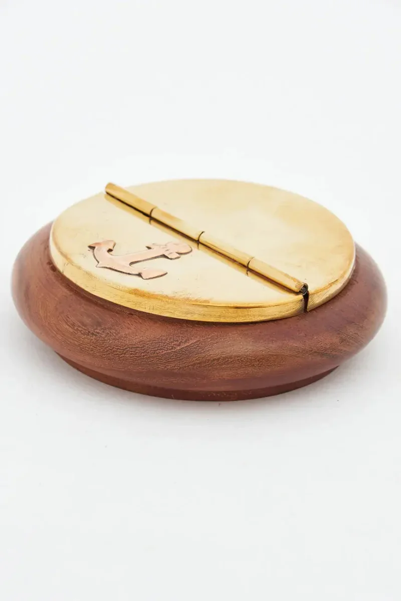 Cenicero hecho en latón sobre una base de madera. Lleva el detalle de un ancla sobre la tapa.