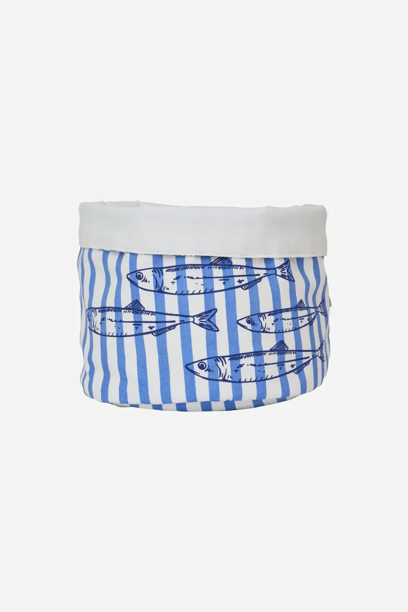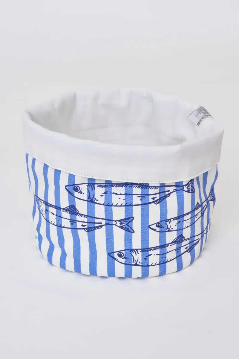 Cesta de pan de algodón con estampado de peces y rayas en tonos azules, inspirada en el estilo náutico. Práctica y decorativa, ideal para presentar pan o pequeños textiles en la mesa o la cocina.