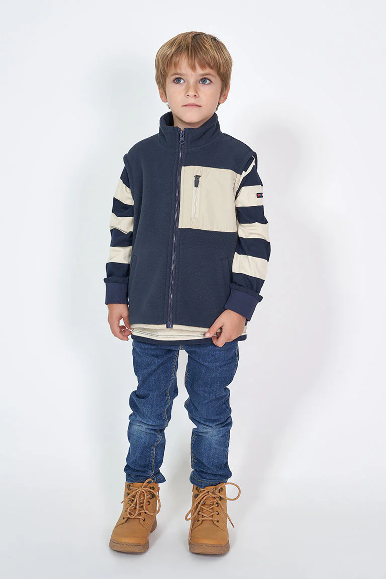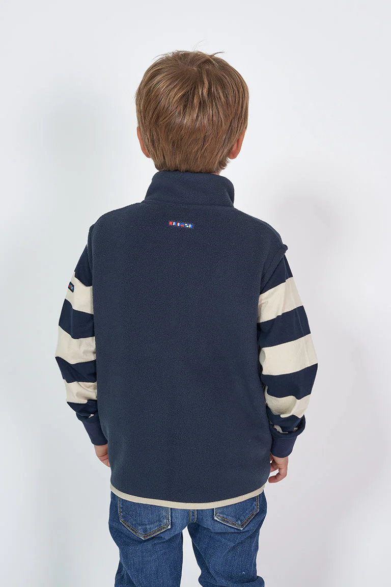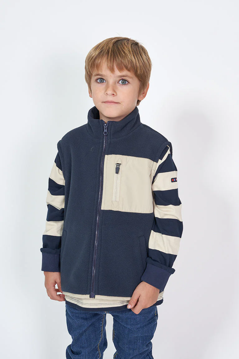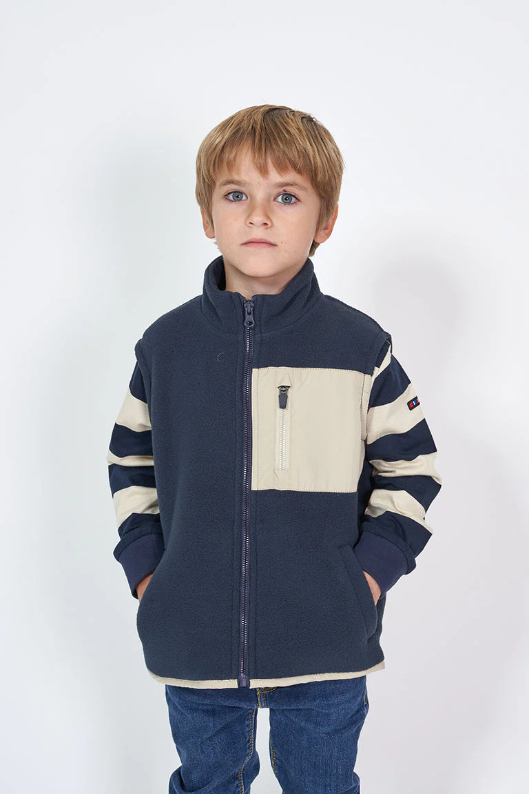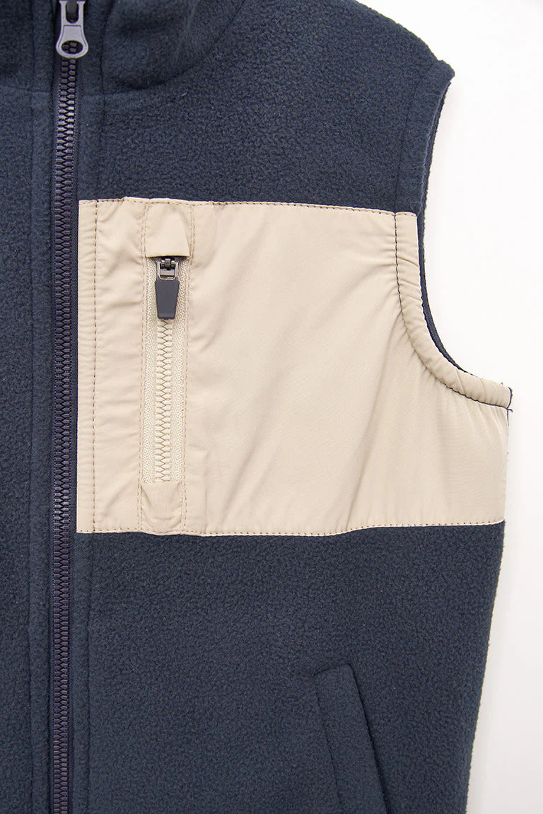 Chaleco para niña o niño confeccionado en tejido de forro polar y cuello elevado. Tiene un bolsillo de nylon a contraste en el pecho y dos bolsillos vivo en los costados. Acabado de nylon a contraste y cierre con cremallera.
