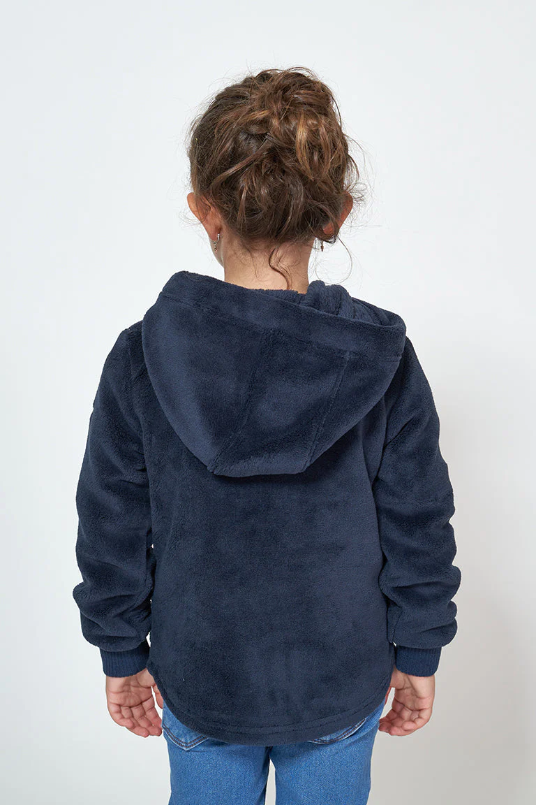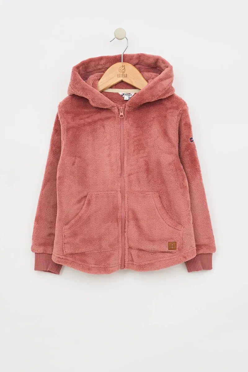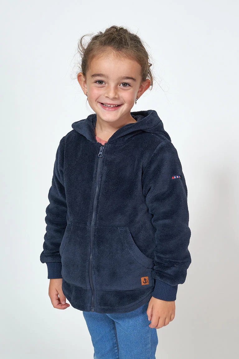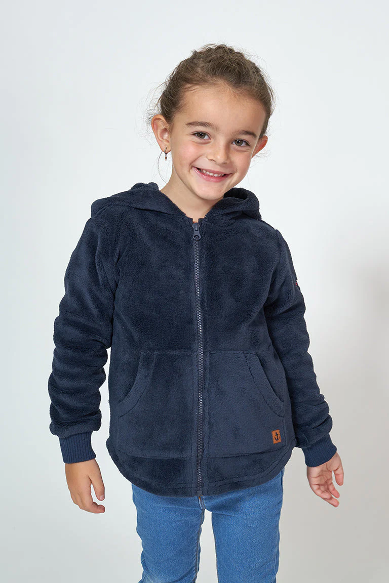Chaqueta con capucha para niña o niño fabricada en tejido teddy polar. Tiene dos bolsillos plastón en el delantero y cierre de cremallera. Puños de canalé elástico y detalle de ancla en cuero en uno de los bolsillos. Bajo con forma redondeada.