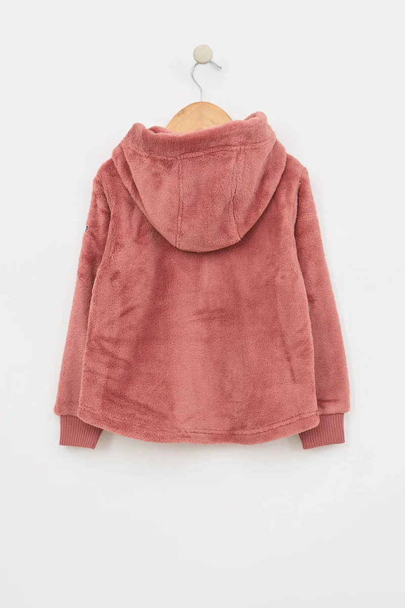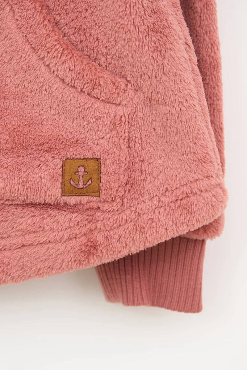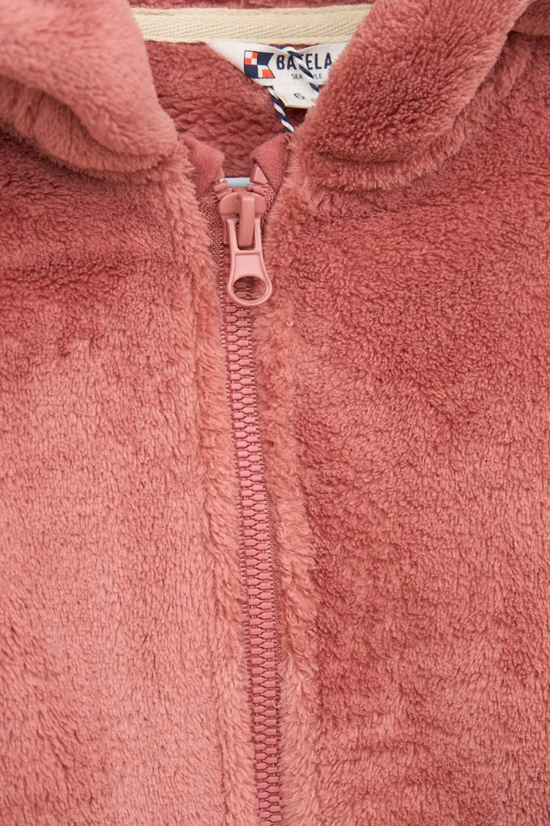 Chaqueta con capucha para niña o niño fabricada en tejido teddy polar. Tiene dos bolsillos plastón en el delantero y cierre de cremallera. Puños de canalé elástico y detalle de ancla en cuero en uno de los bolsillos. Bajo con forma redondeada.